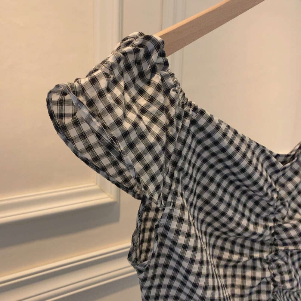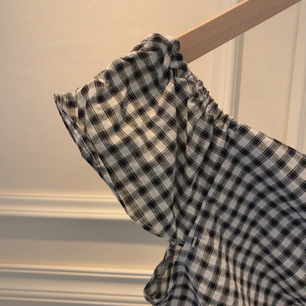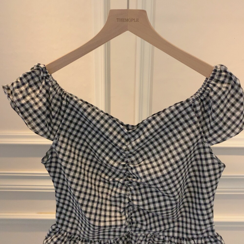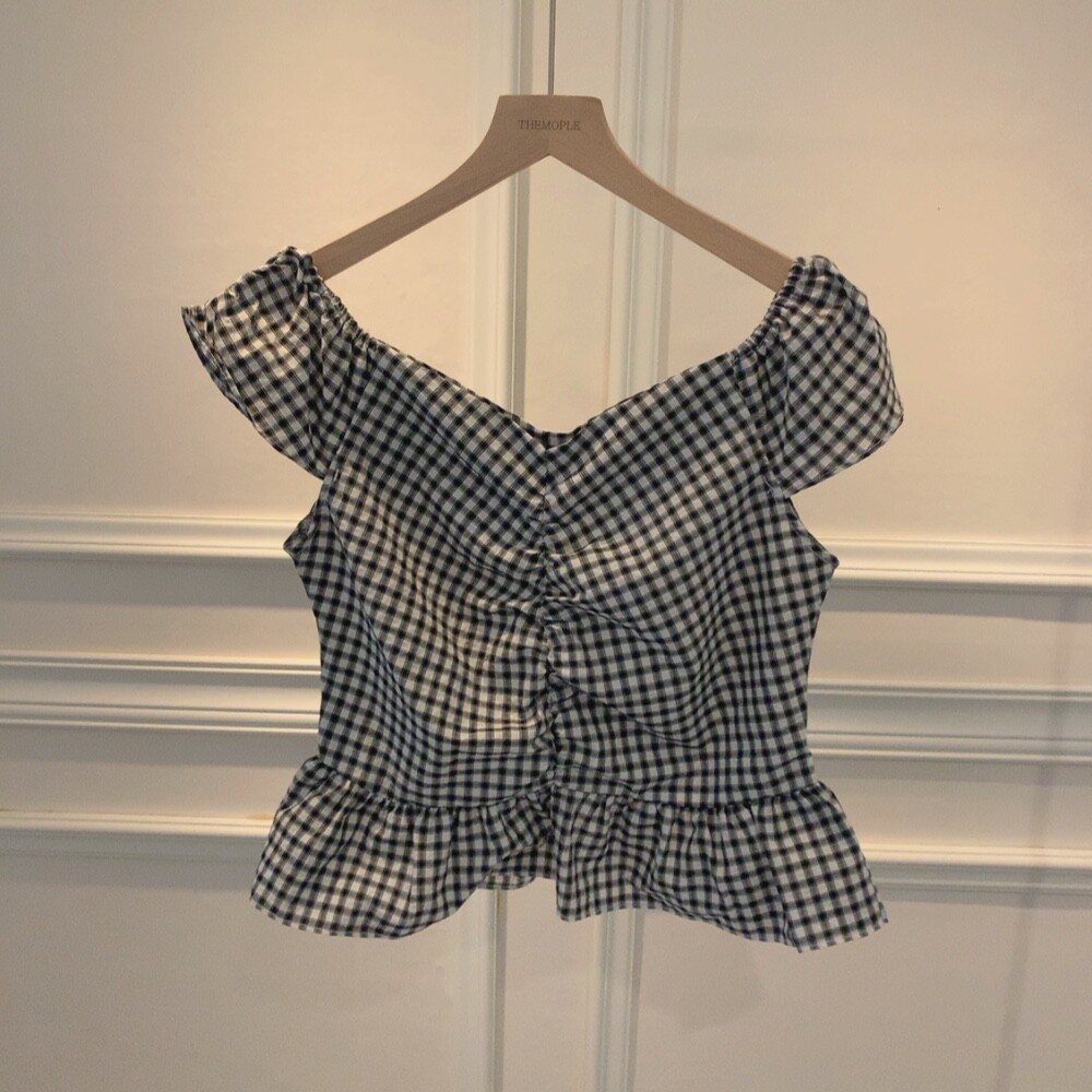 체크 프릴 날개 캡소매 오프숄더 셔링 숏 플레어 블라우스