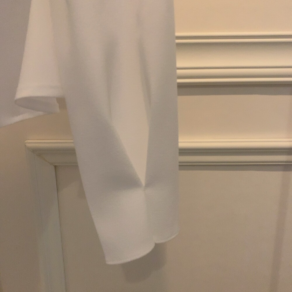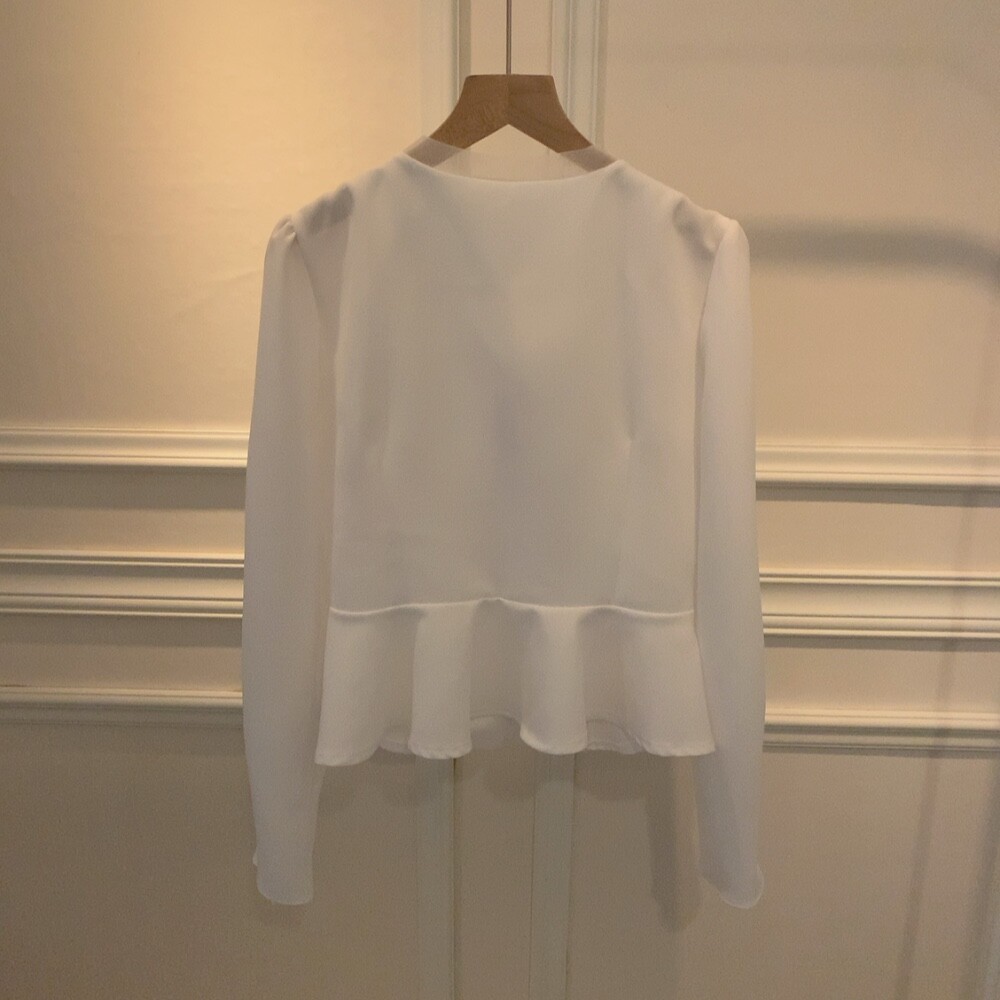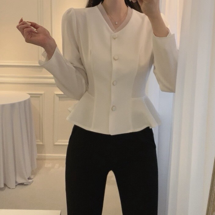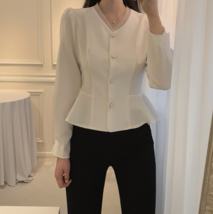 허리 부분 밑으로는 살짝 플레어로 퍼지는 형태의 블라우스로