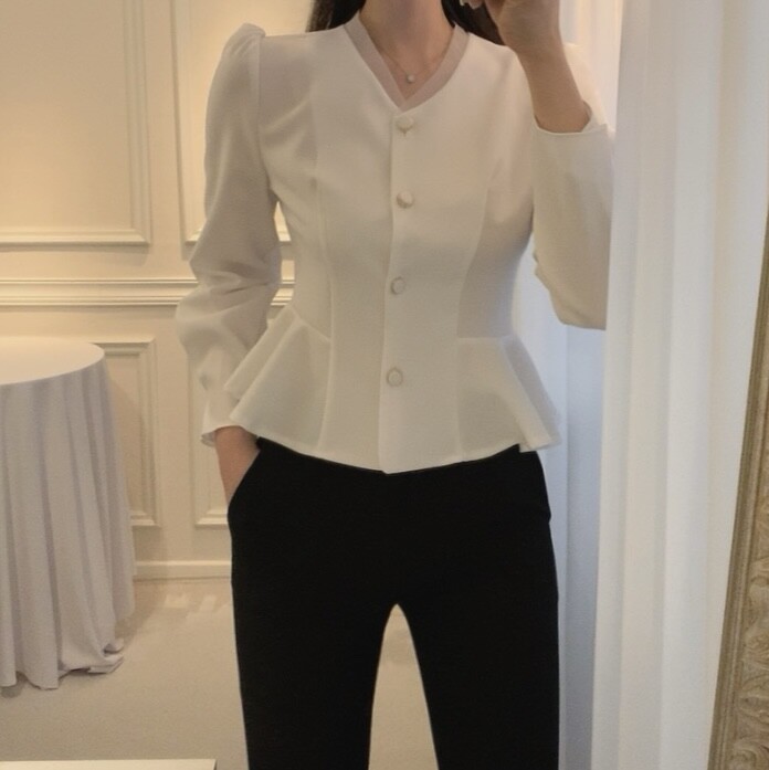 망사 넥 자켓스타일 플레어 단추 블라우스 (하객룩 오피스룩 모임룩)