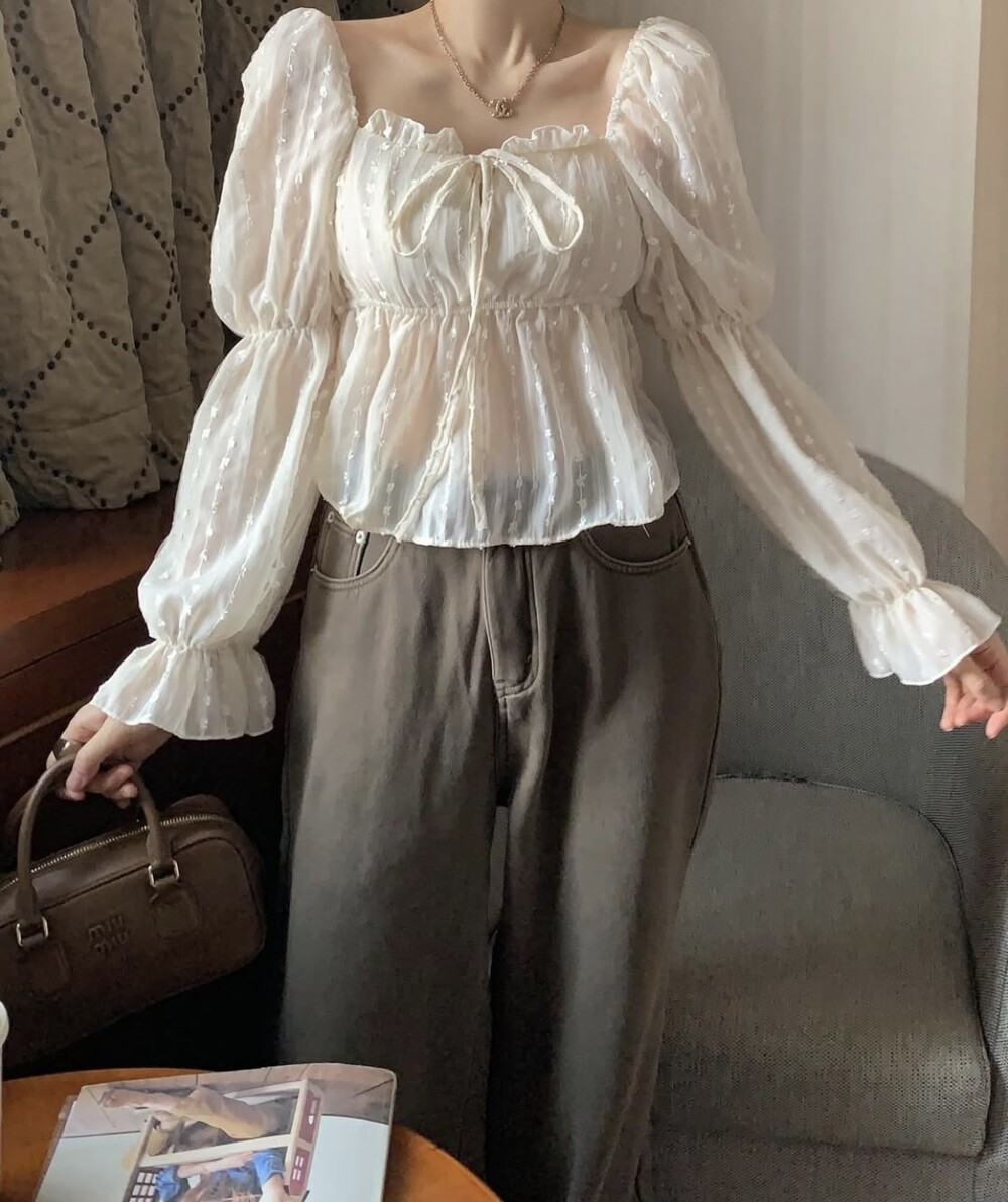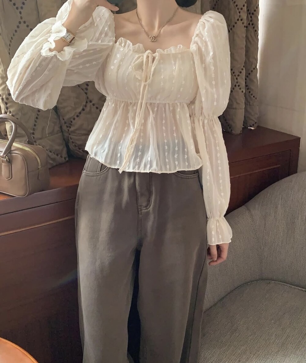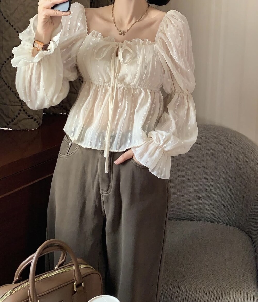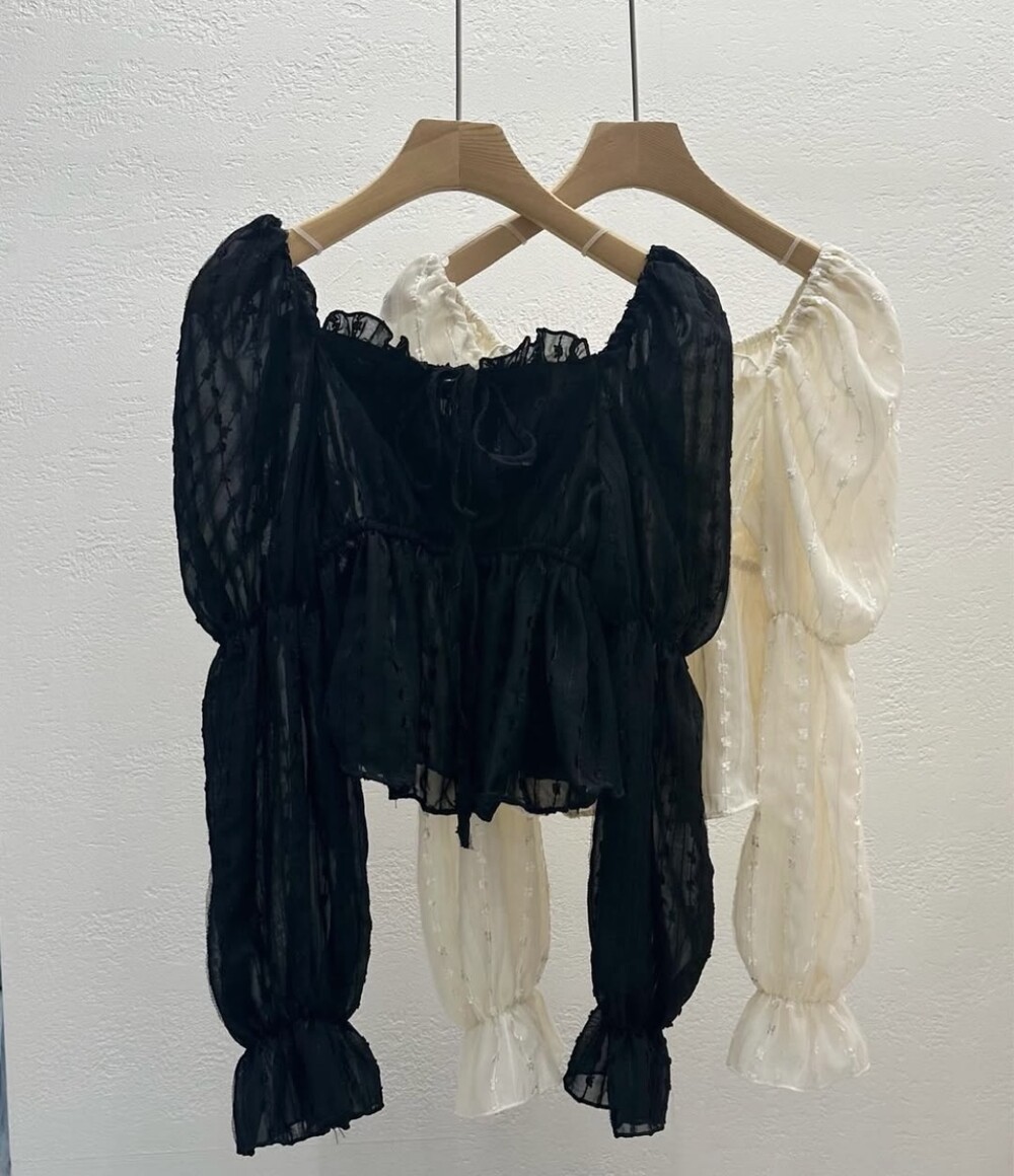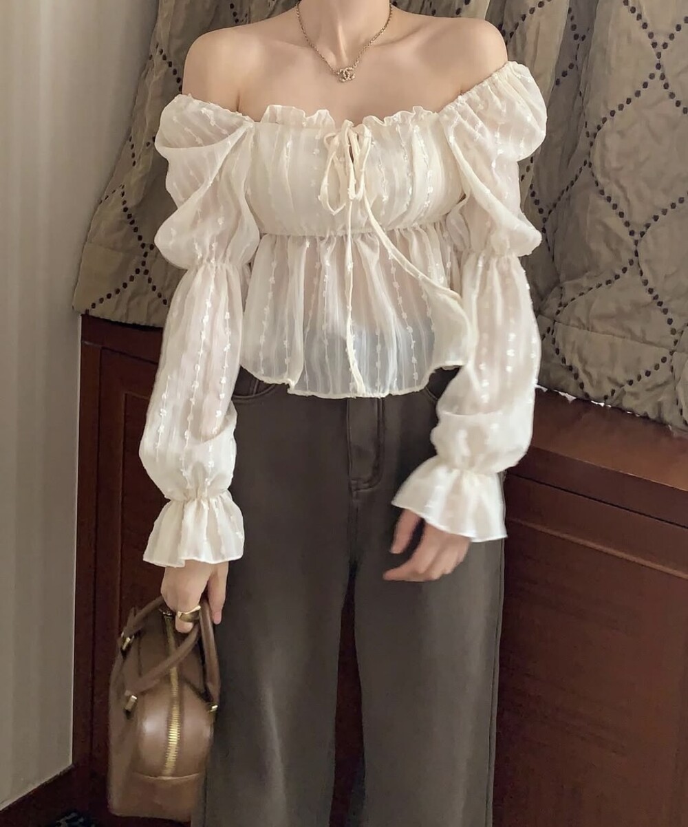 눈꽃 프릴 스퀘어넥 오프숄더 리본 끈 퍼프 소매 블라우스 (연말룩 파티룩 데이트룩)