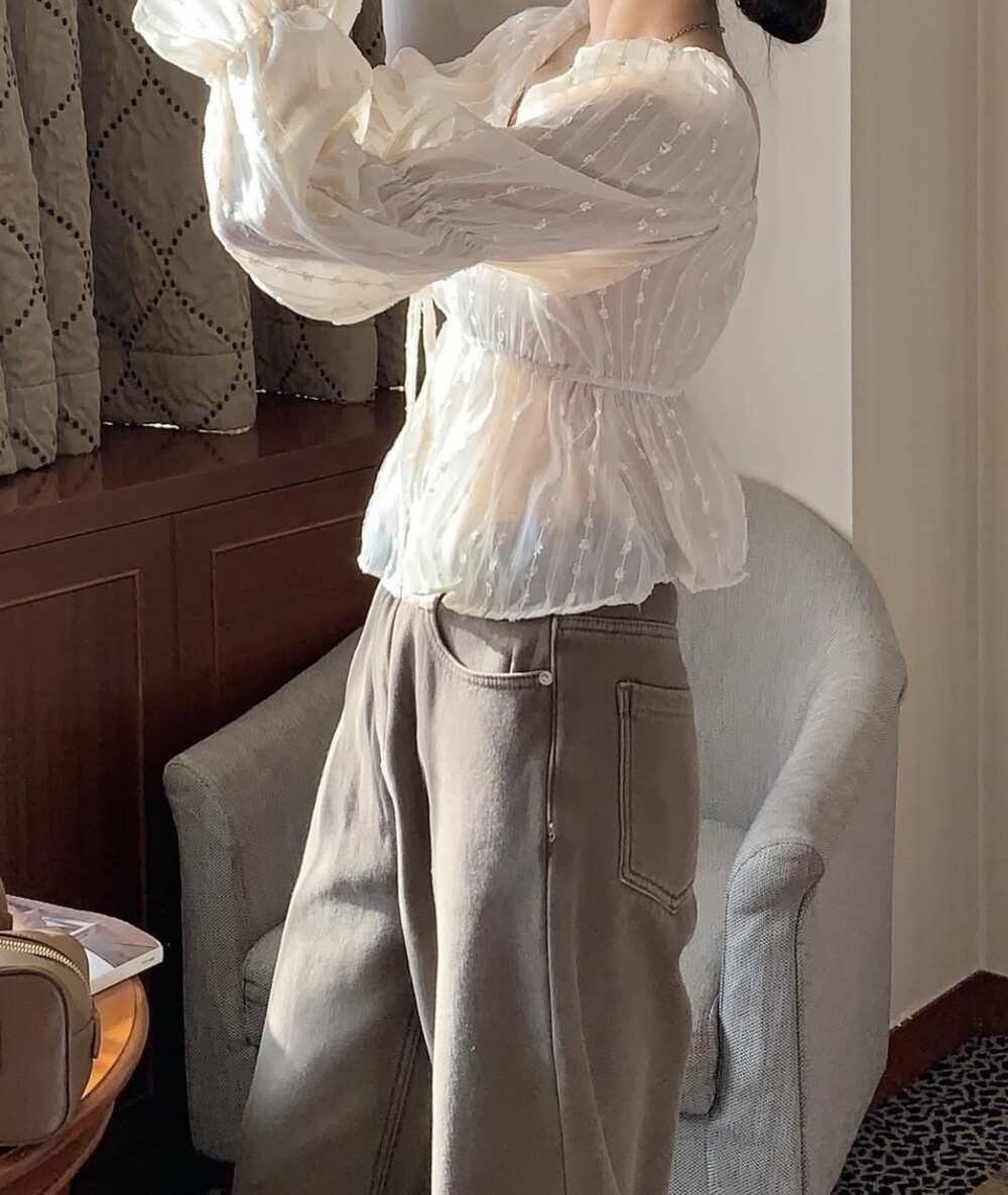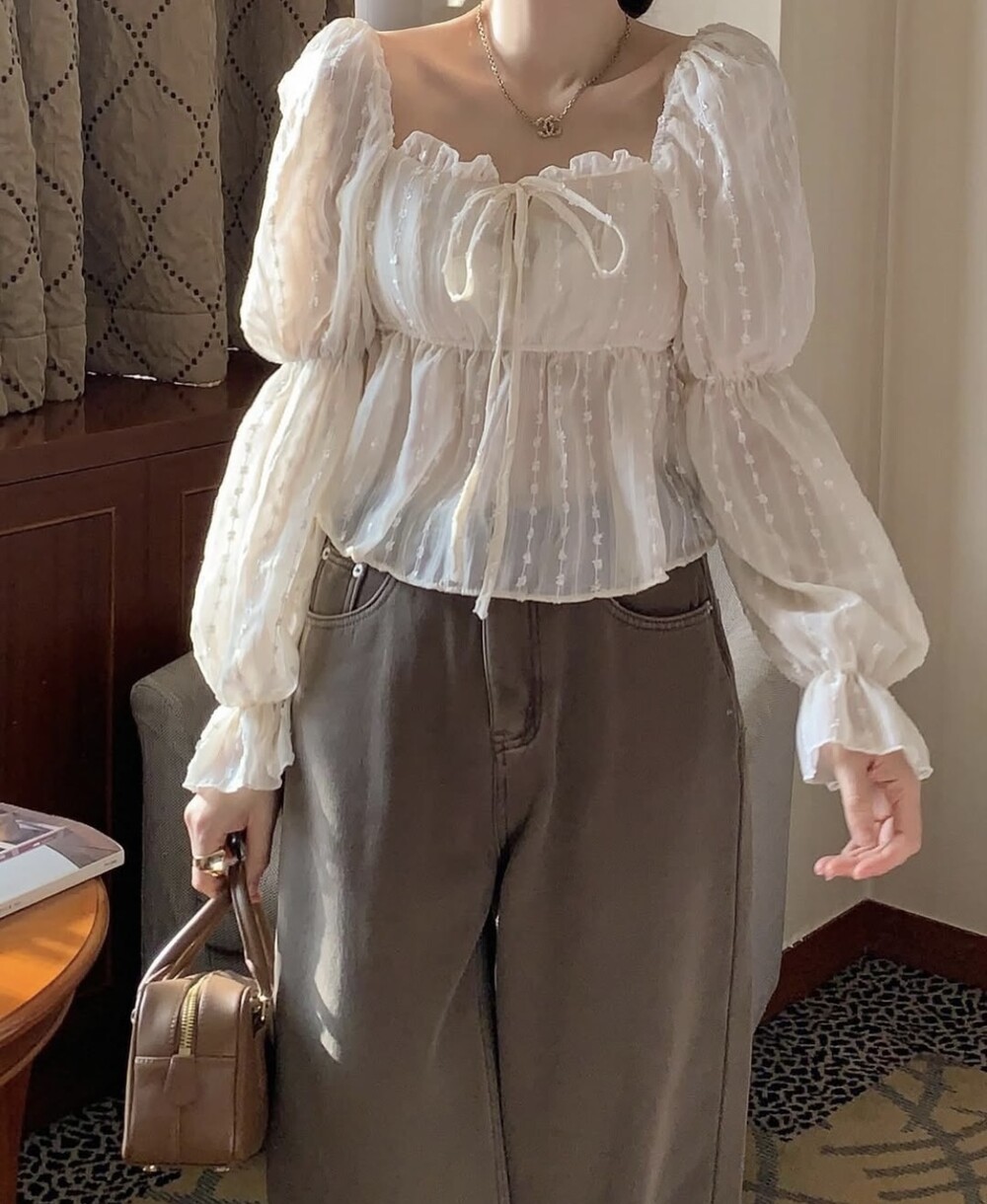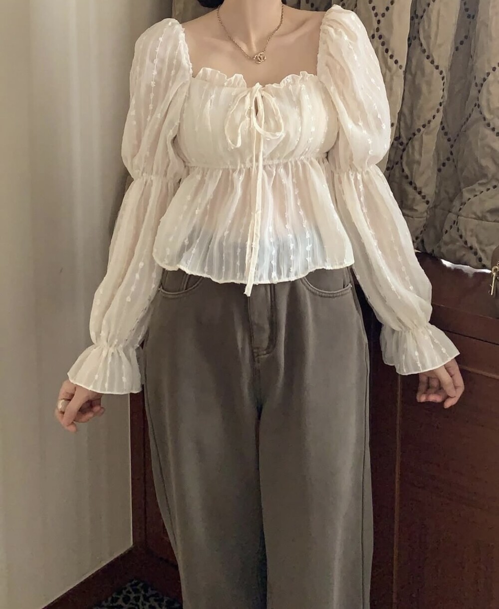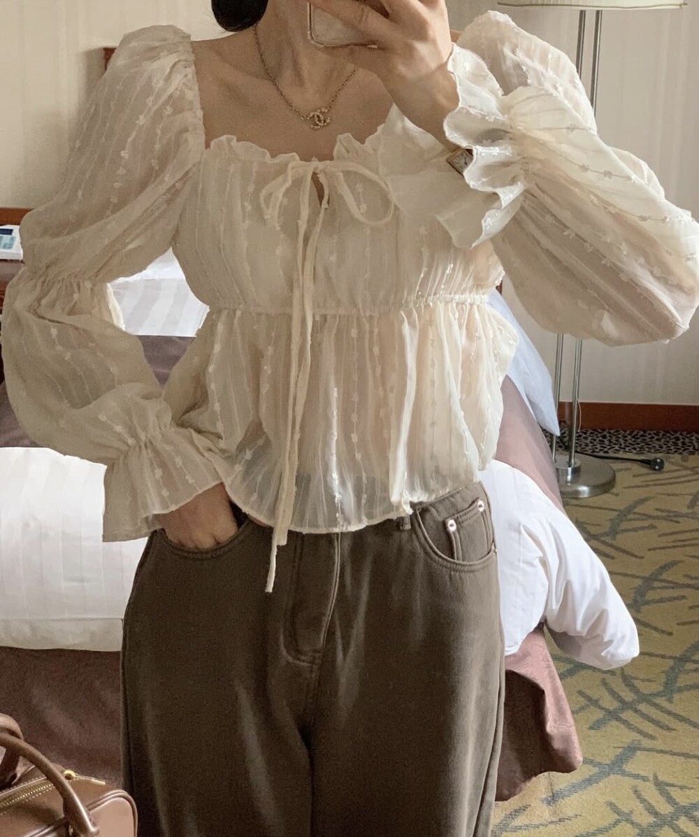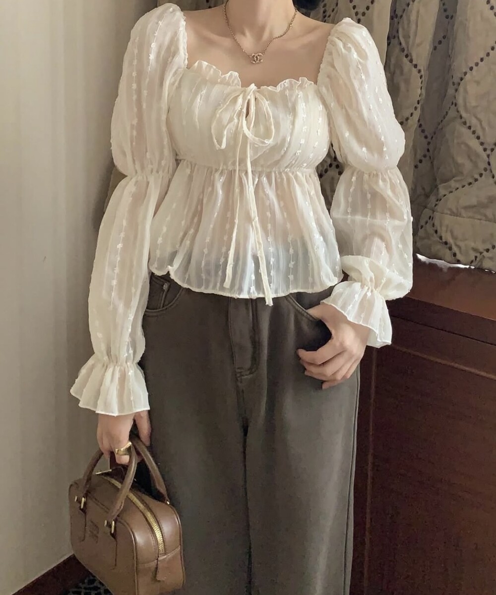 눈꽃 프릴 스퀘어넥 오프숄더 리본 끈 퍼프 소매 블라우스 (연말룩 파티룩 데이트룩)