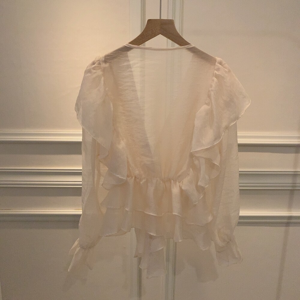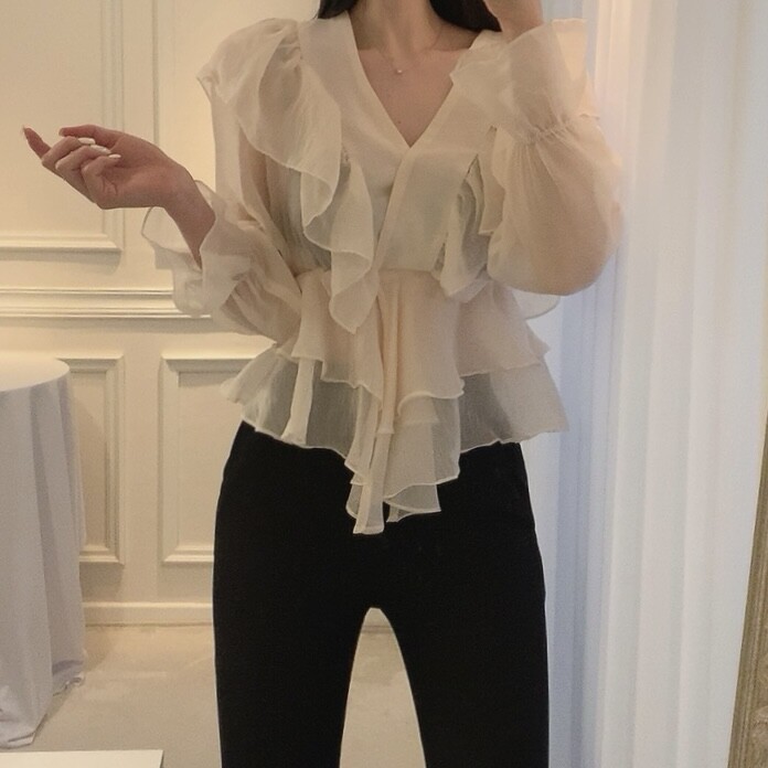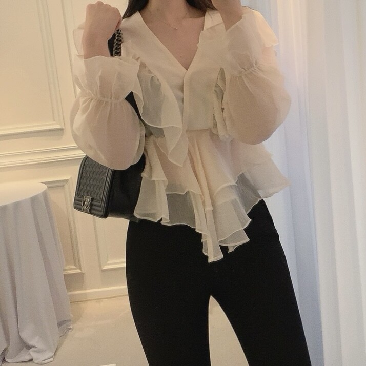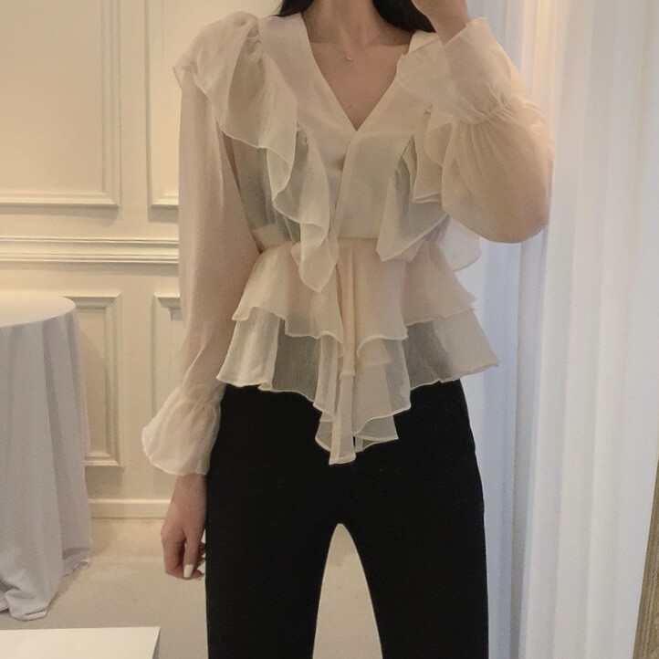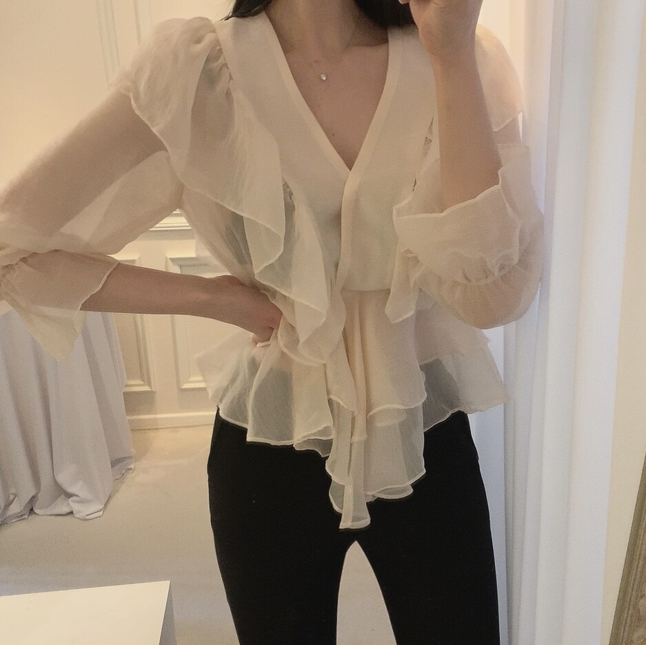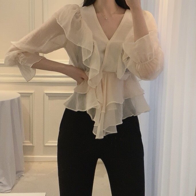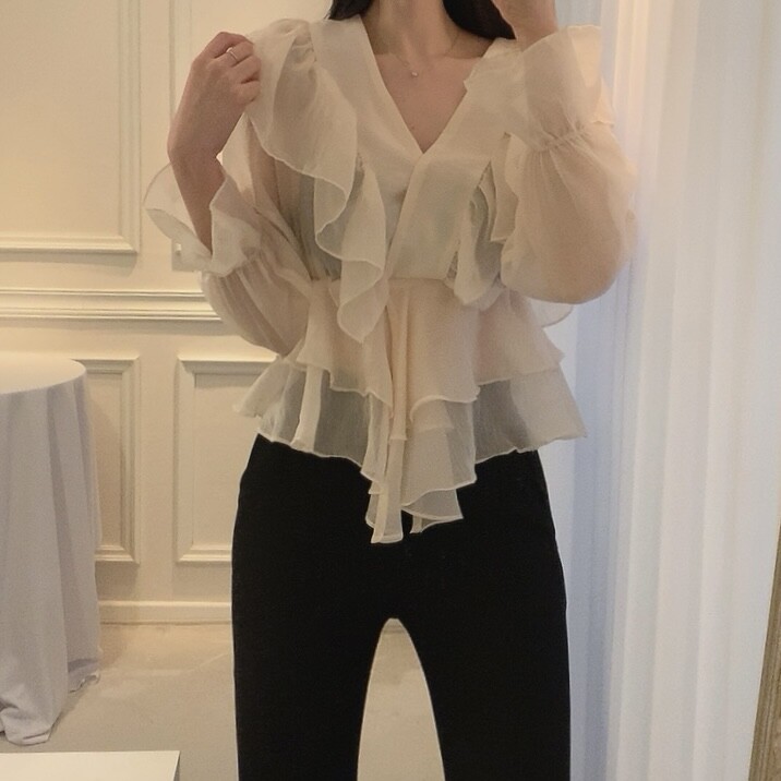 프릴 러플 시스루 브이넥 똑딱이 단추 여신 블라우스 (하객룩 데이트룩 나들이룩)