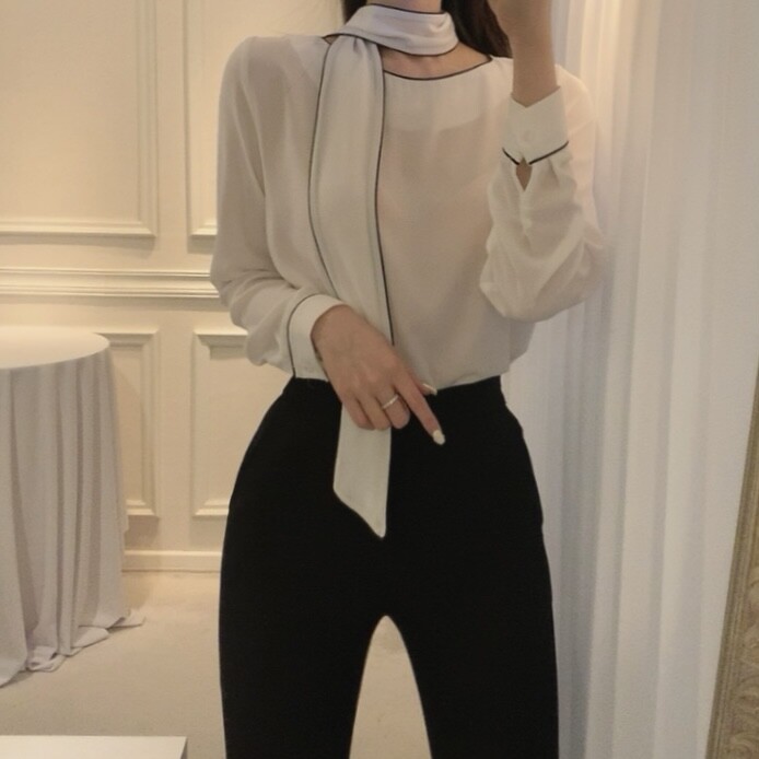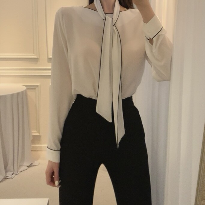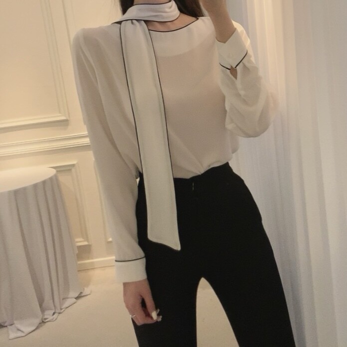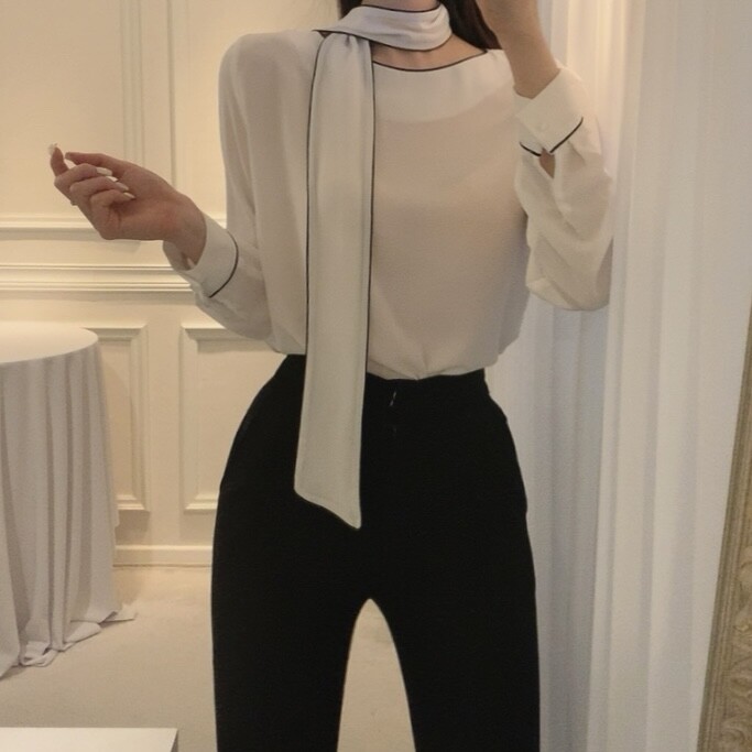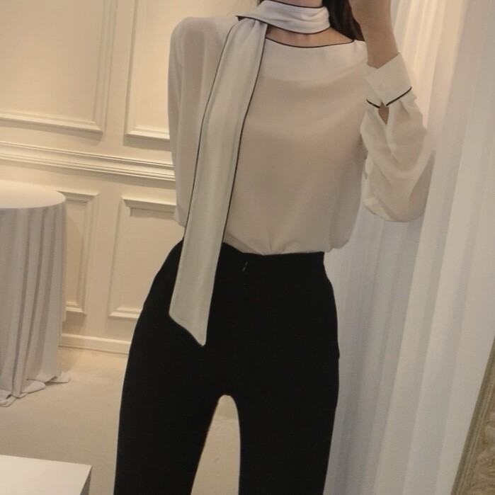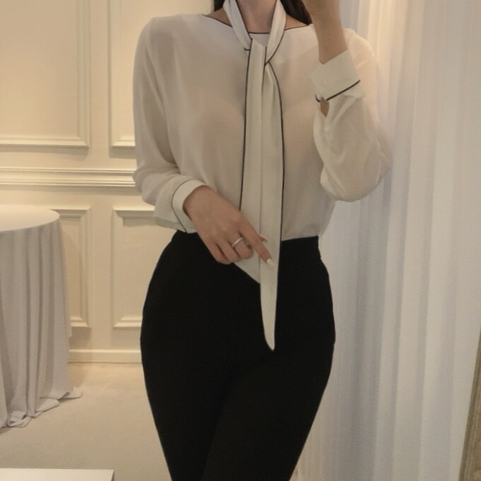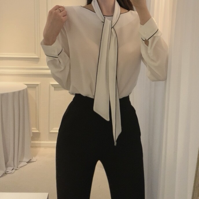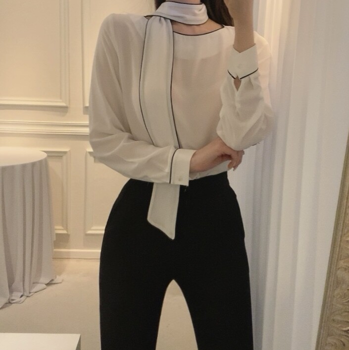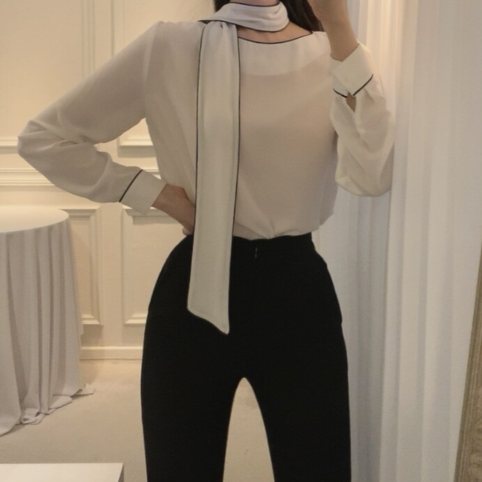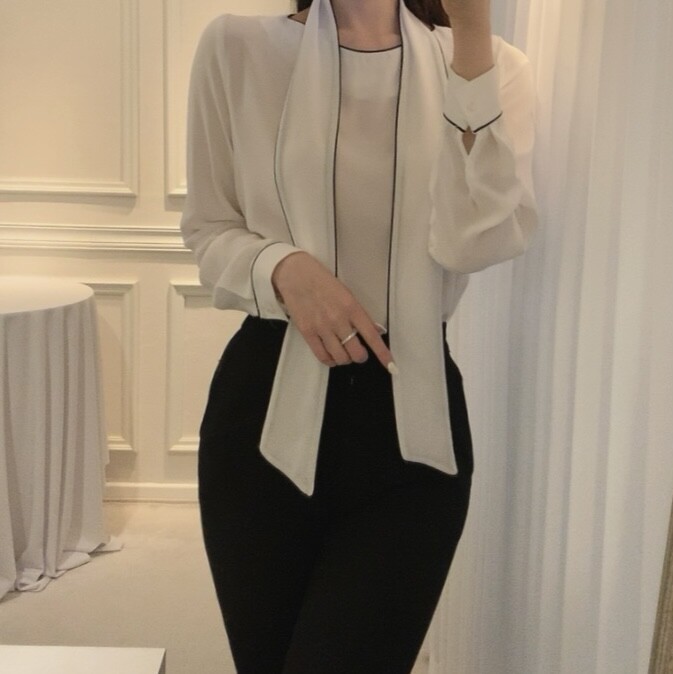 삥줄 배색 스카프 타이 여리여리 루즈핏 블라우스 (하객룩 데이트룩 오피스룩)
