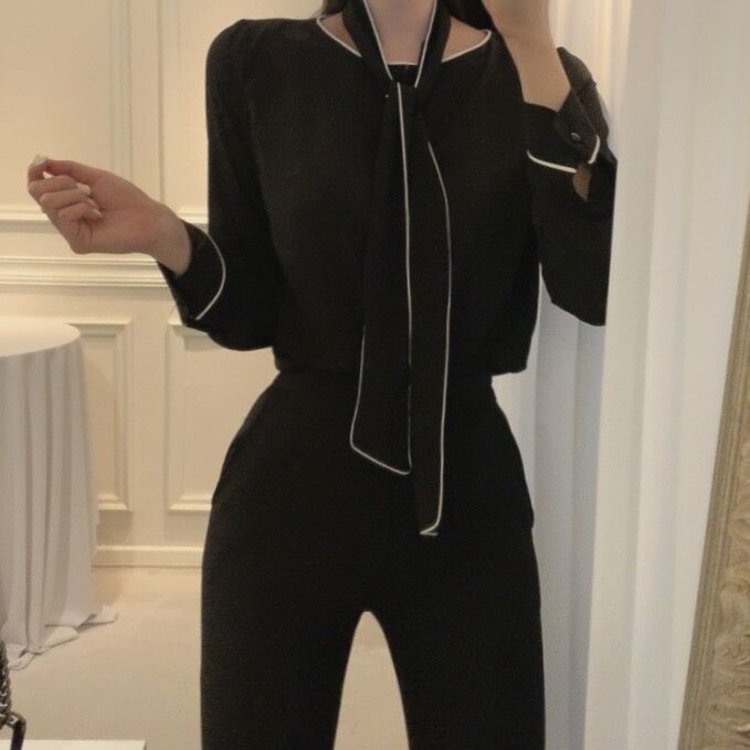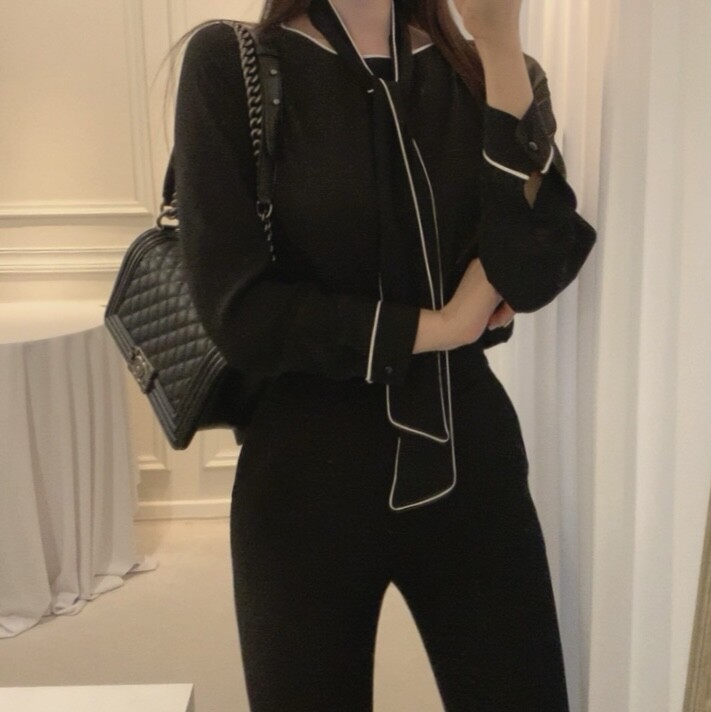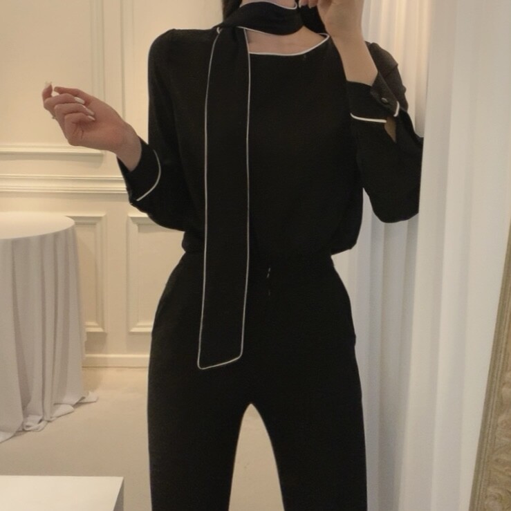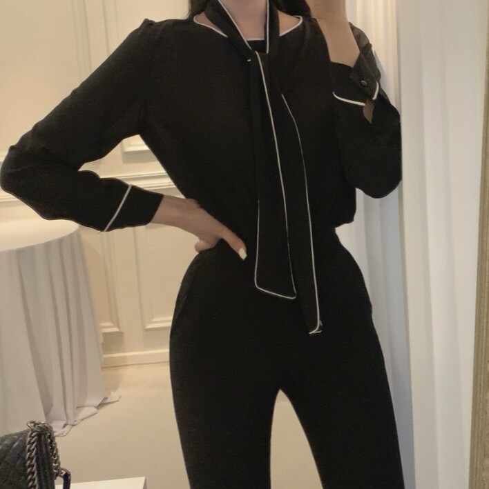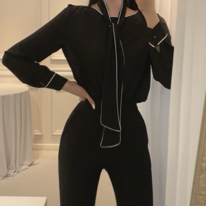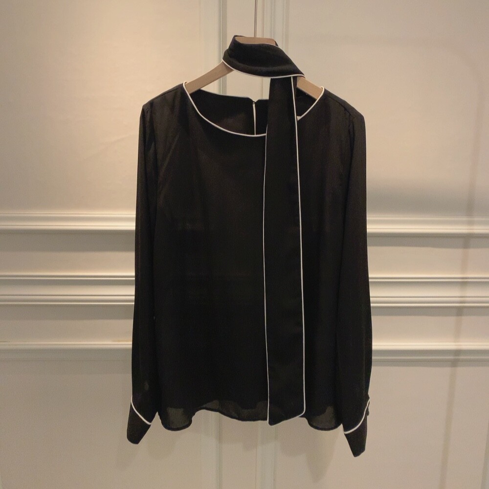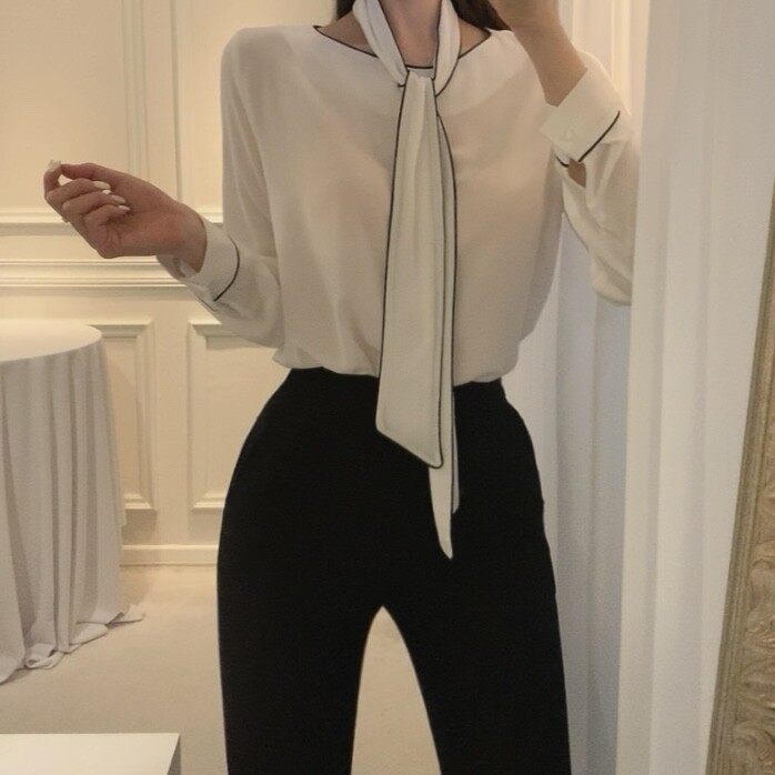 삥줄 배색 스카프 타이 여리여리 루즈핏 블라우스 (하객룩 데이트룩 오피스룩)