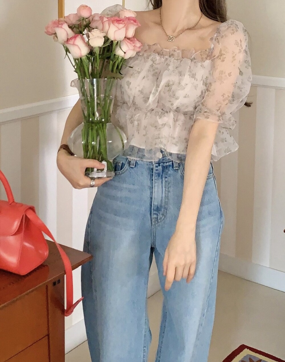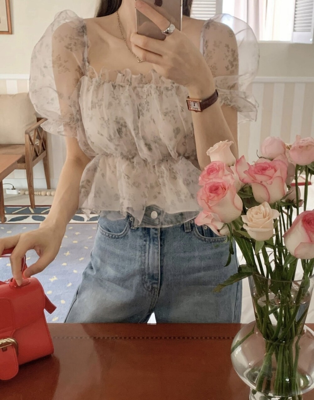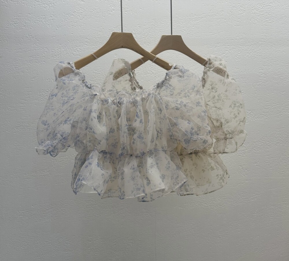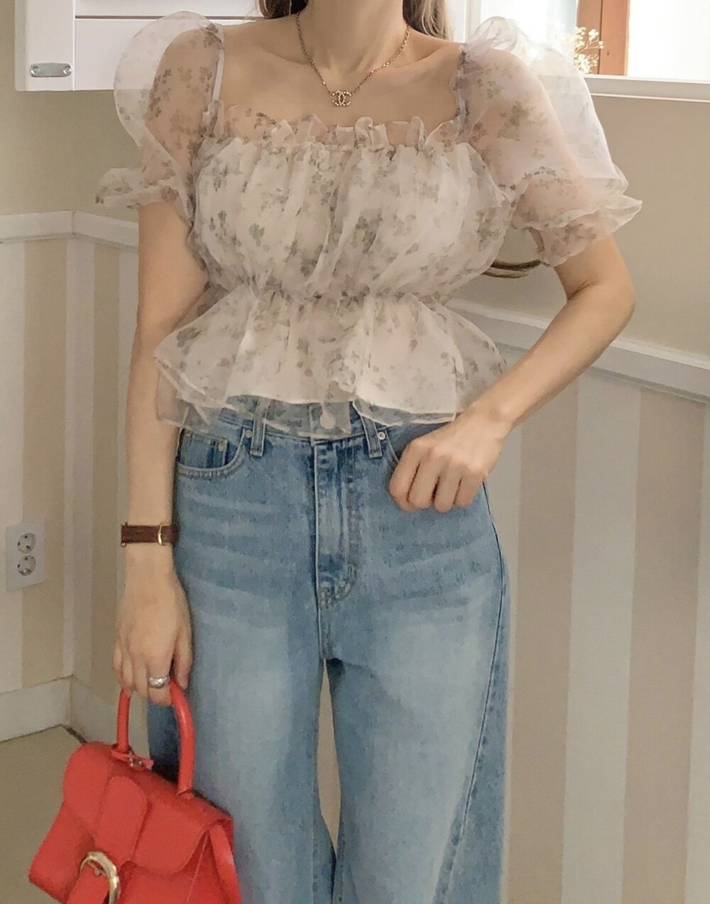 플라워 꽃 나염 노방 오간자 셔링 반팔 퍼프 소매 숏 플레어 블라우스 (데이트룩 나들이룩 여행코디)