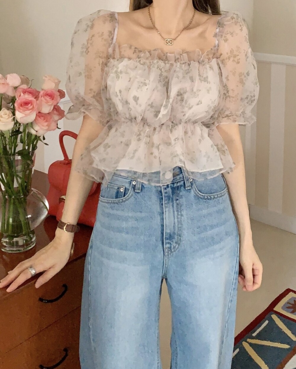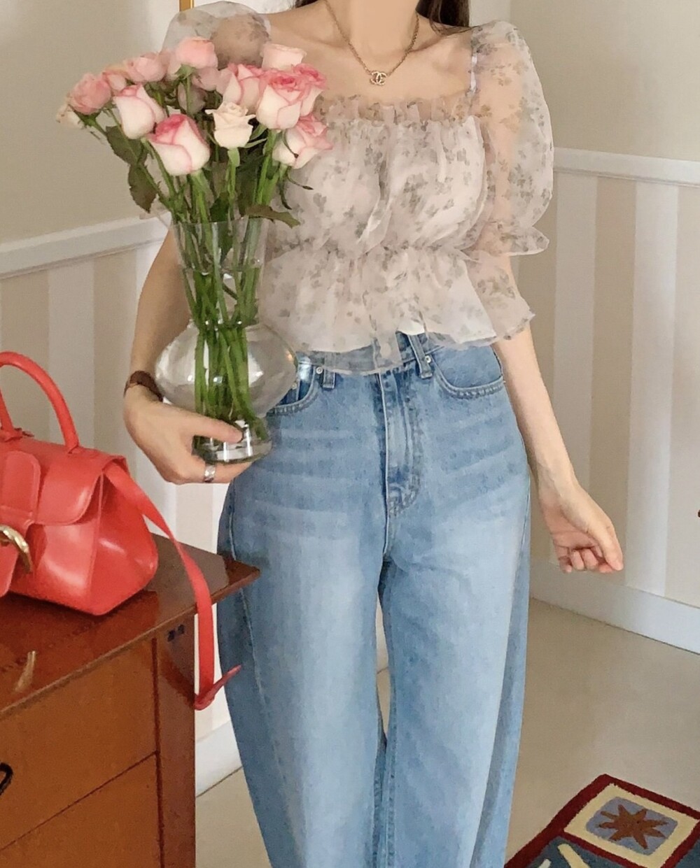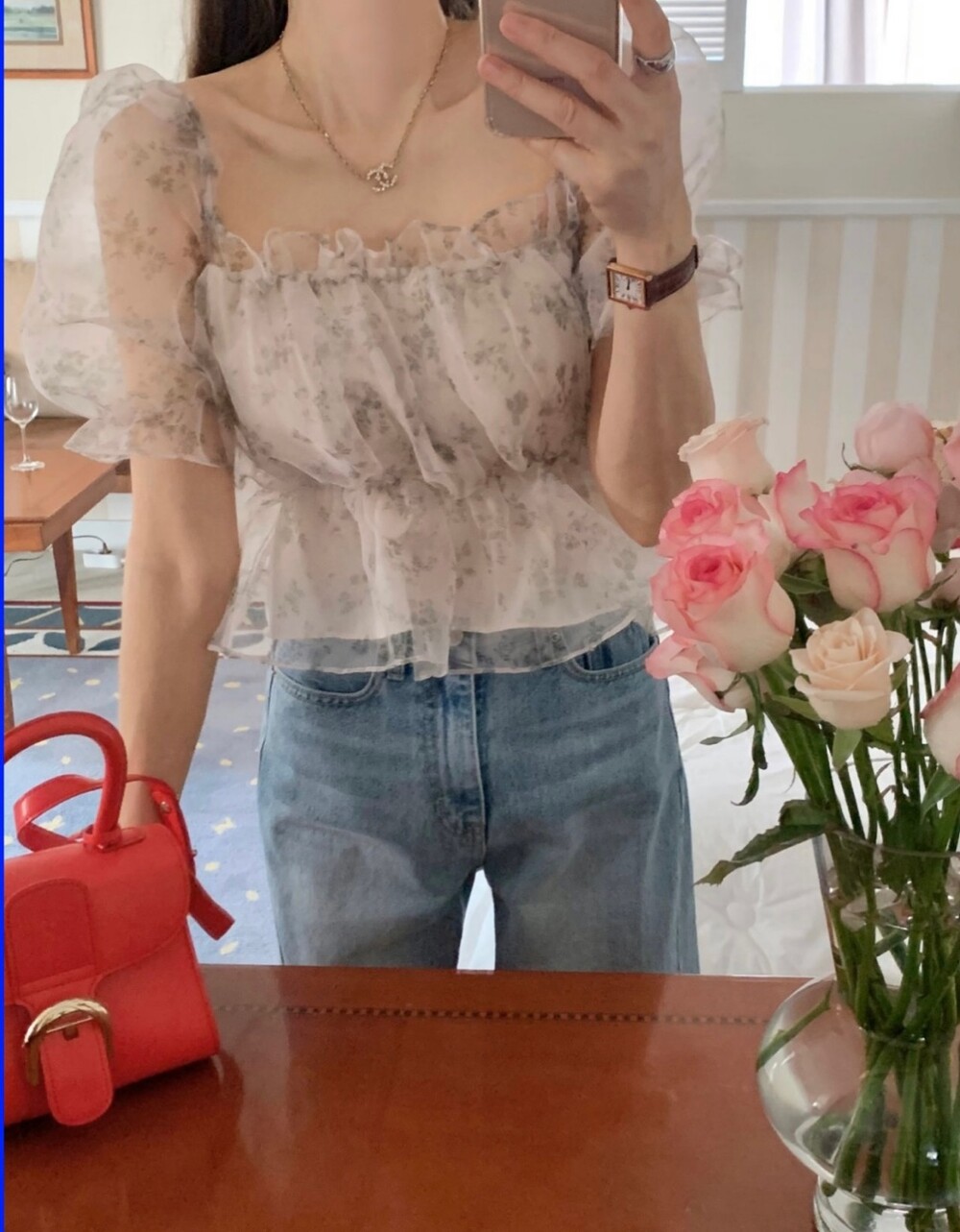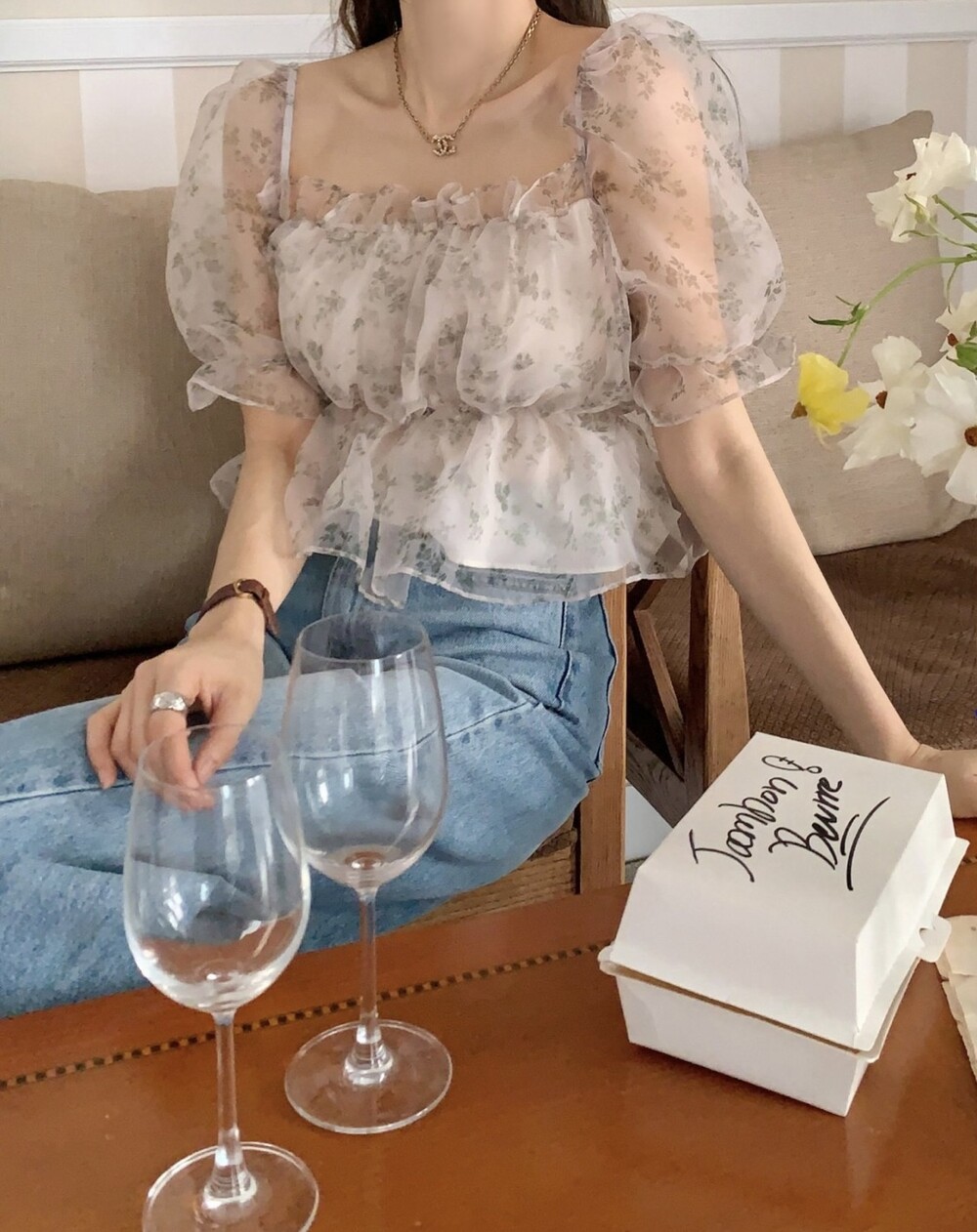 플라워 꽃 나염 노방 오간자 셔링 반팔 퍼프 소매 숏 플레어 블라우스 (데이트룩 나들이룩 여행코디)