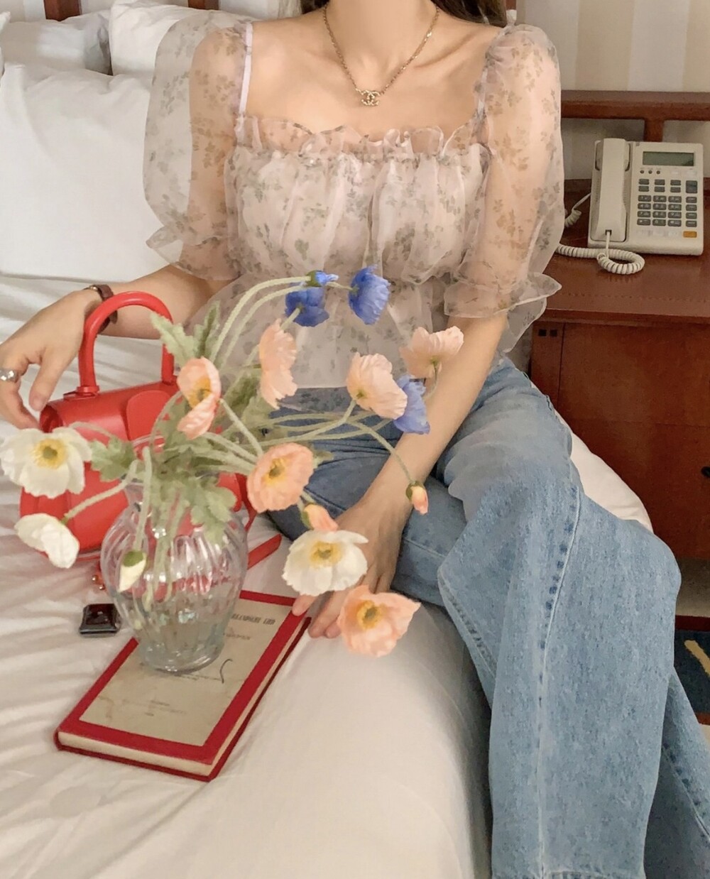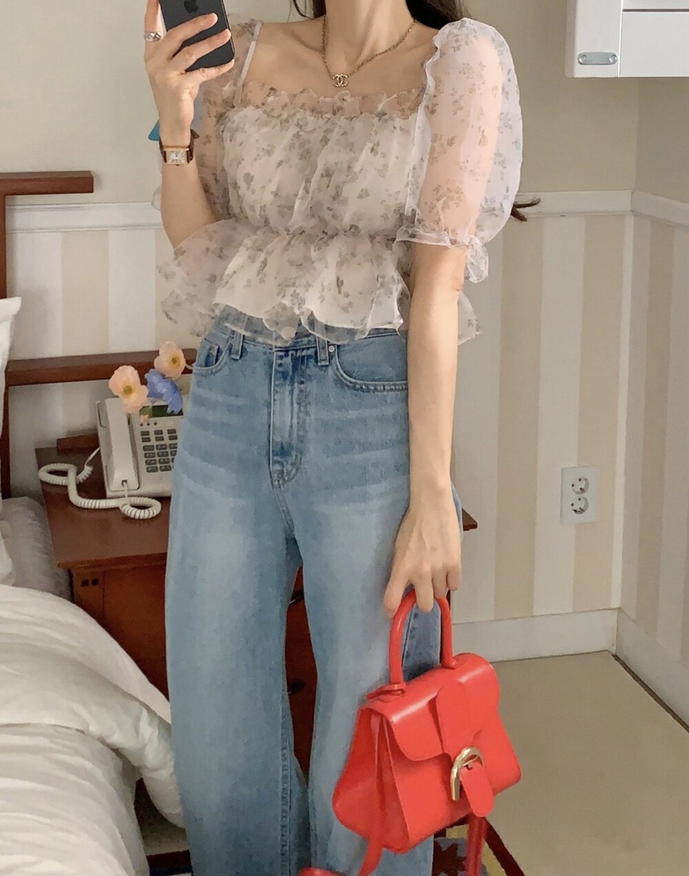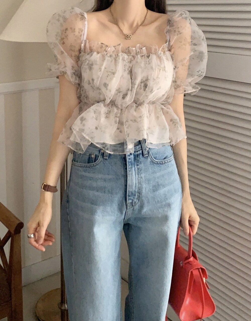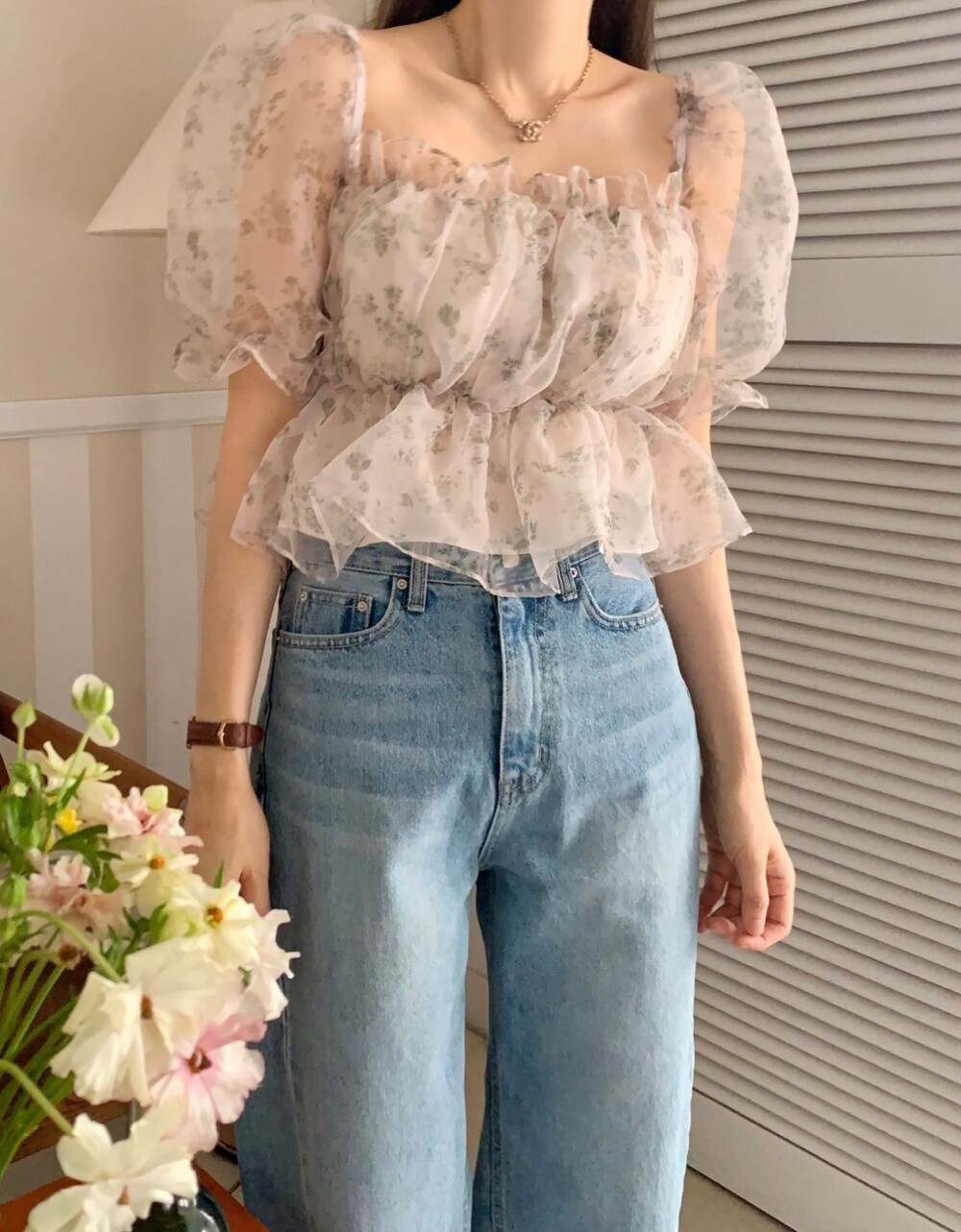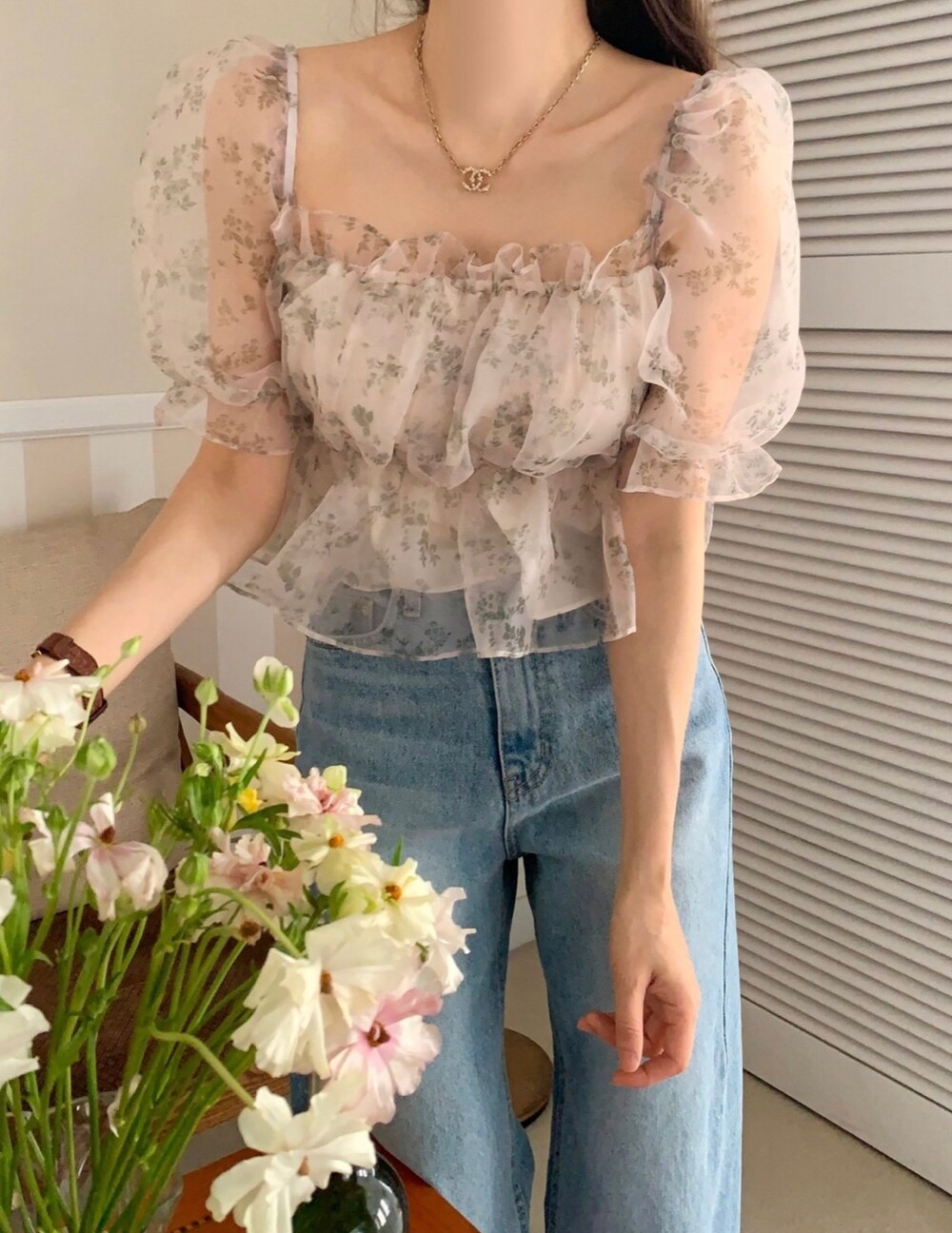 플라워 꽃 나염 노방 오간자 셔링 반팔 퍼프 소매 숏 플레어 블라우스 (데이트룩 나들이룩 여행코디)