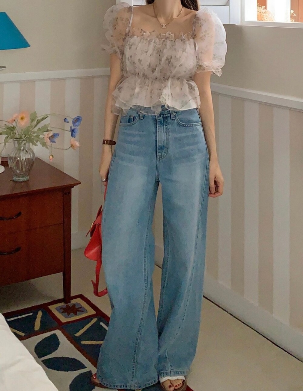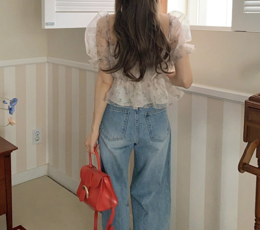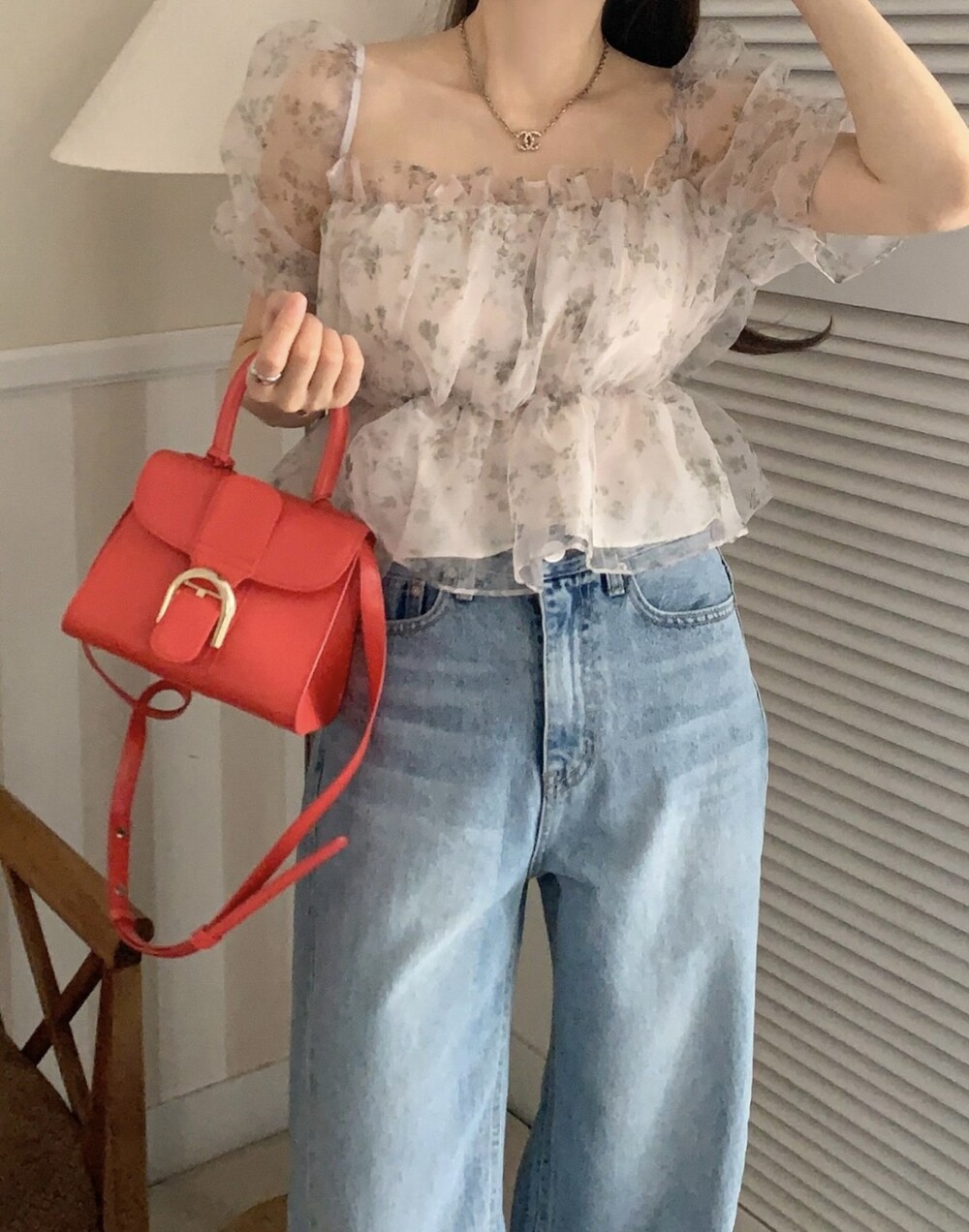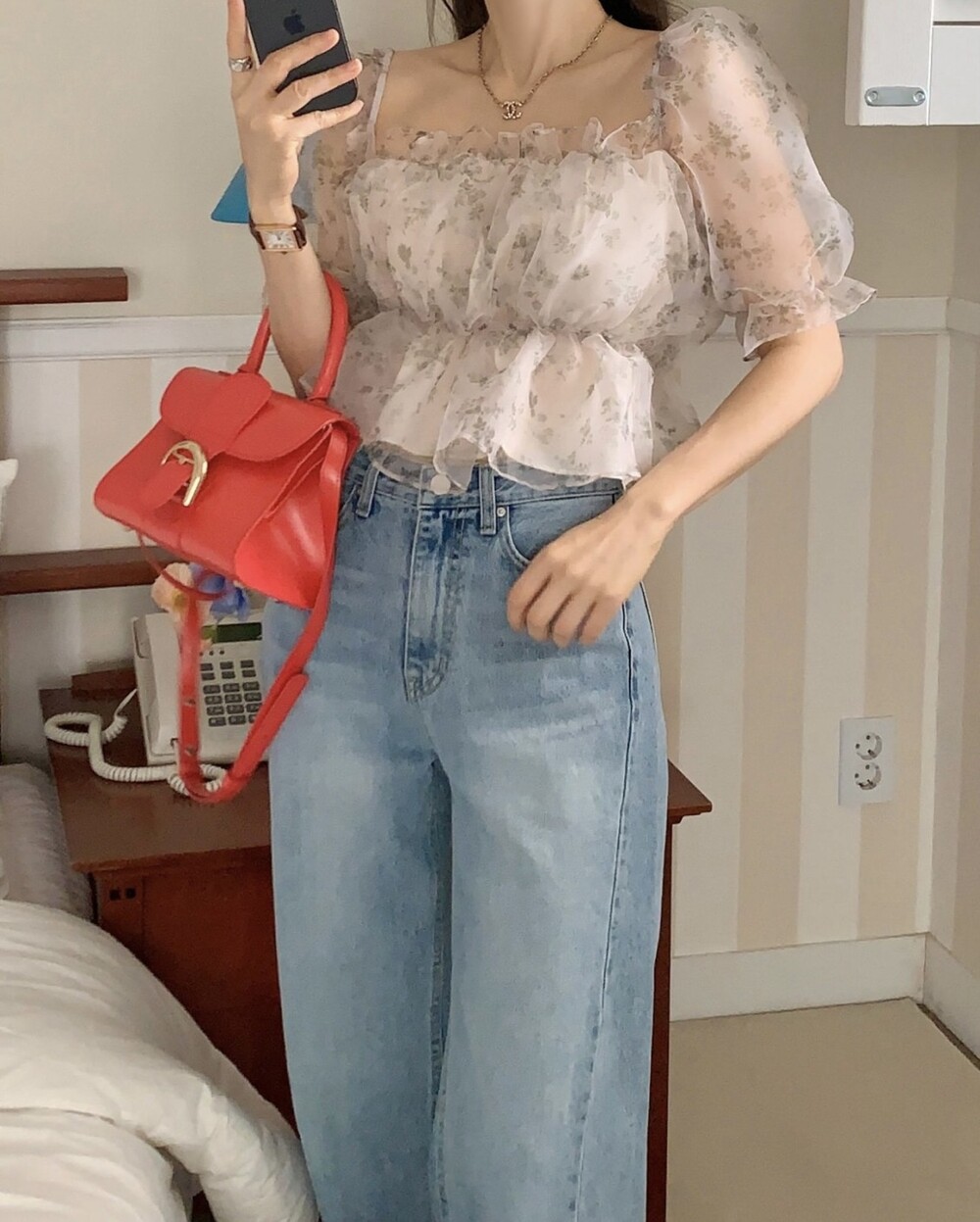 플라워 꽃 나염 노방 오간자 셔링 반팔 퍼프 소매 숏 플레어 블라우스 (데이트룩 나들이룩 여행코디)