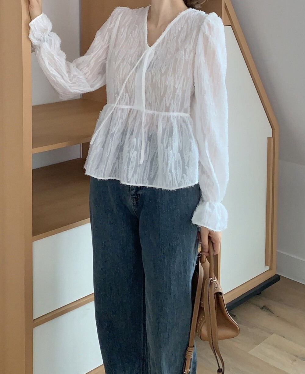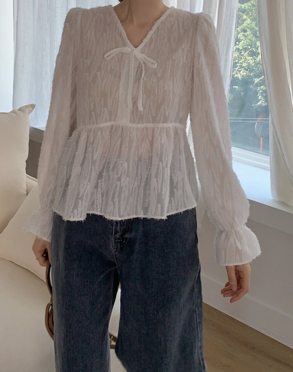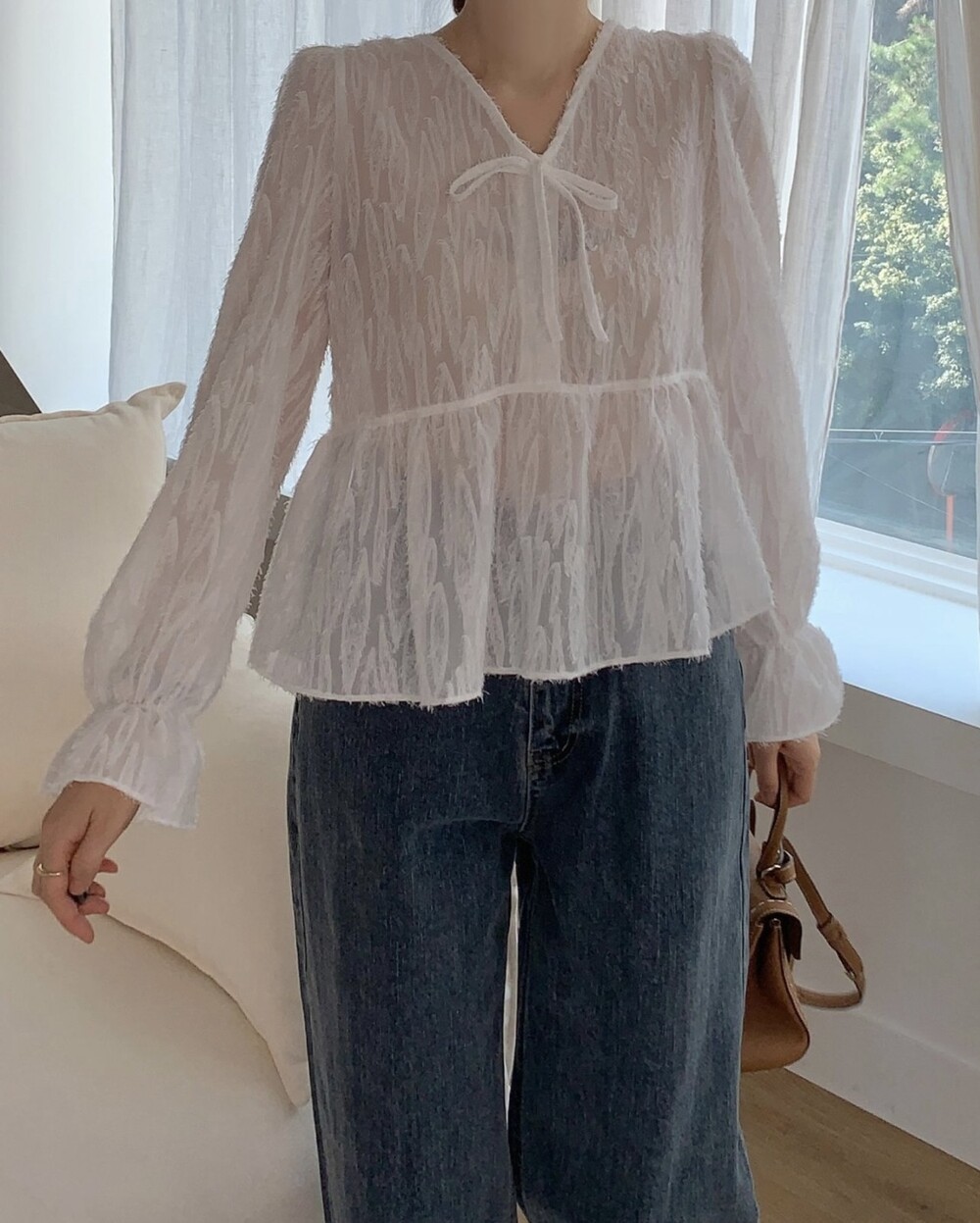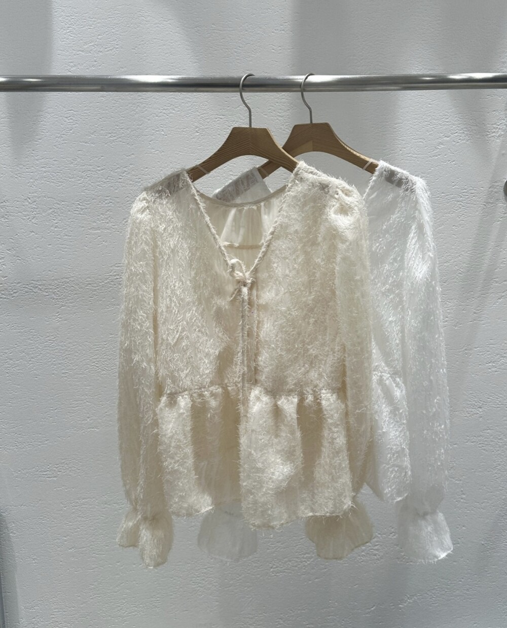 깃털 리본 끈 플레어 시스루 블라우스 (페미닌룩 데이트룩 파티룩)