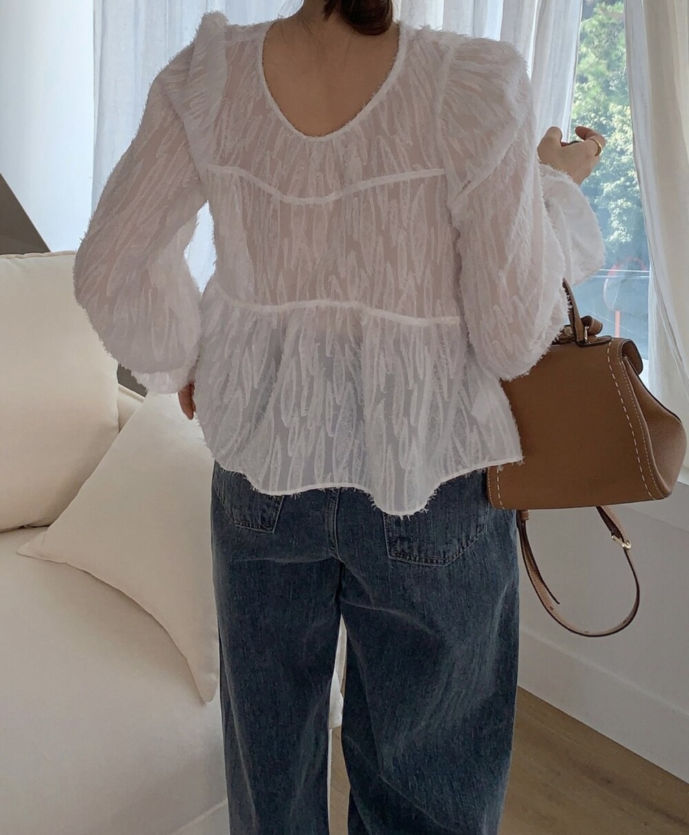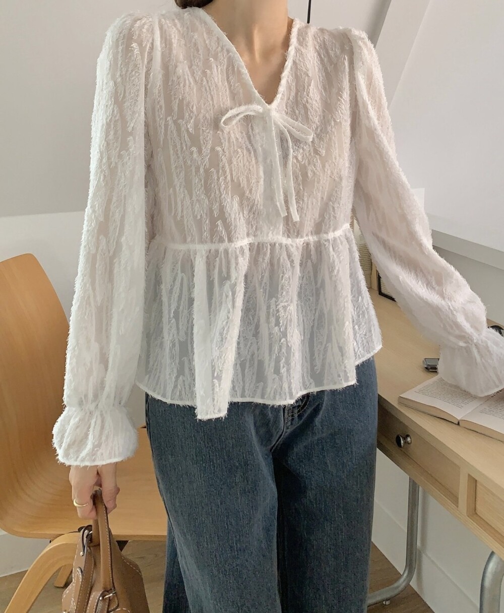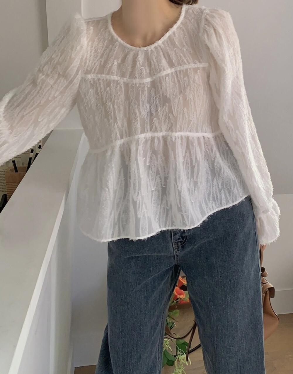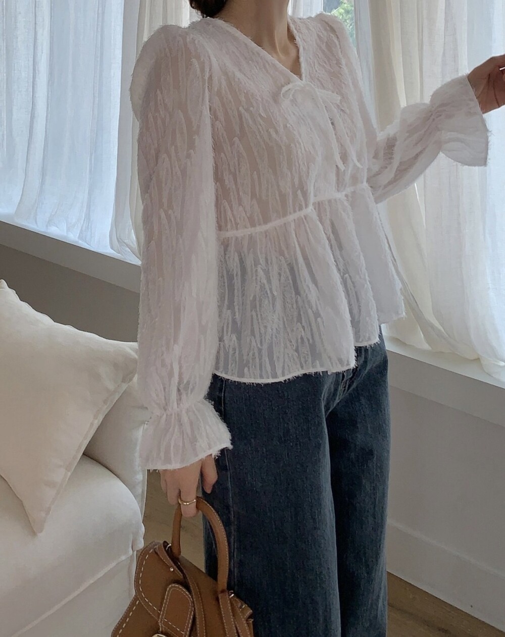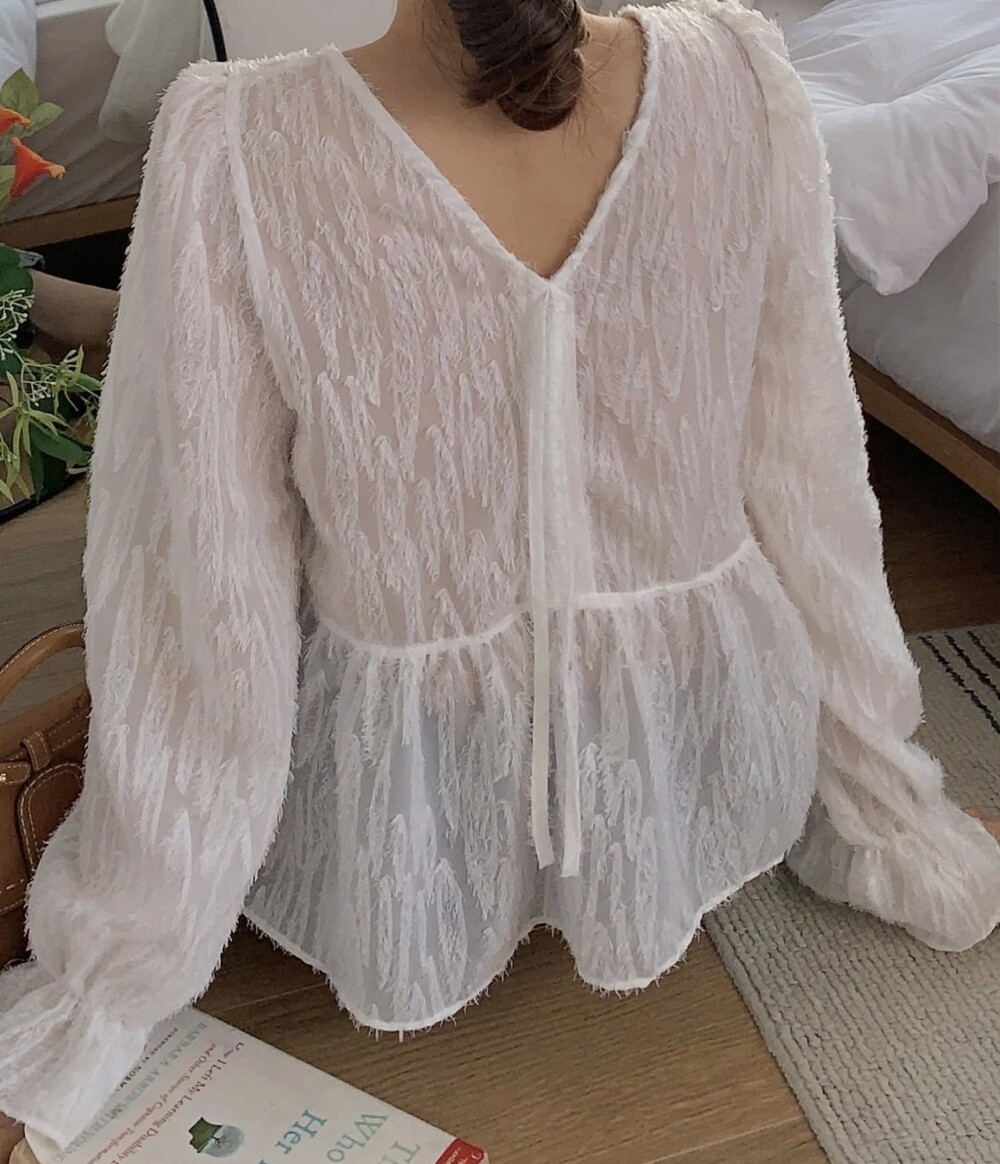 깃털 리본 끈 플레어 시스루 블라우스 (페미닌룩 데이트룩 파티룩)