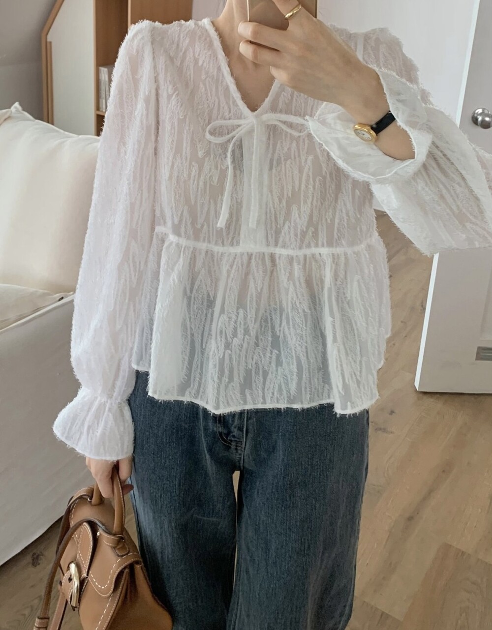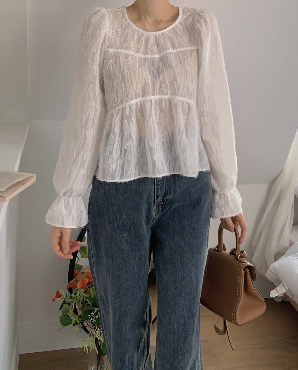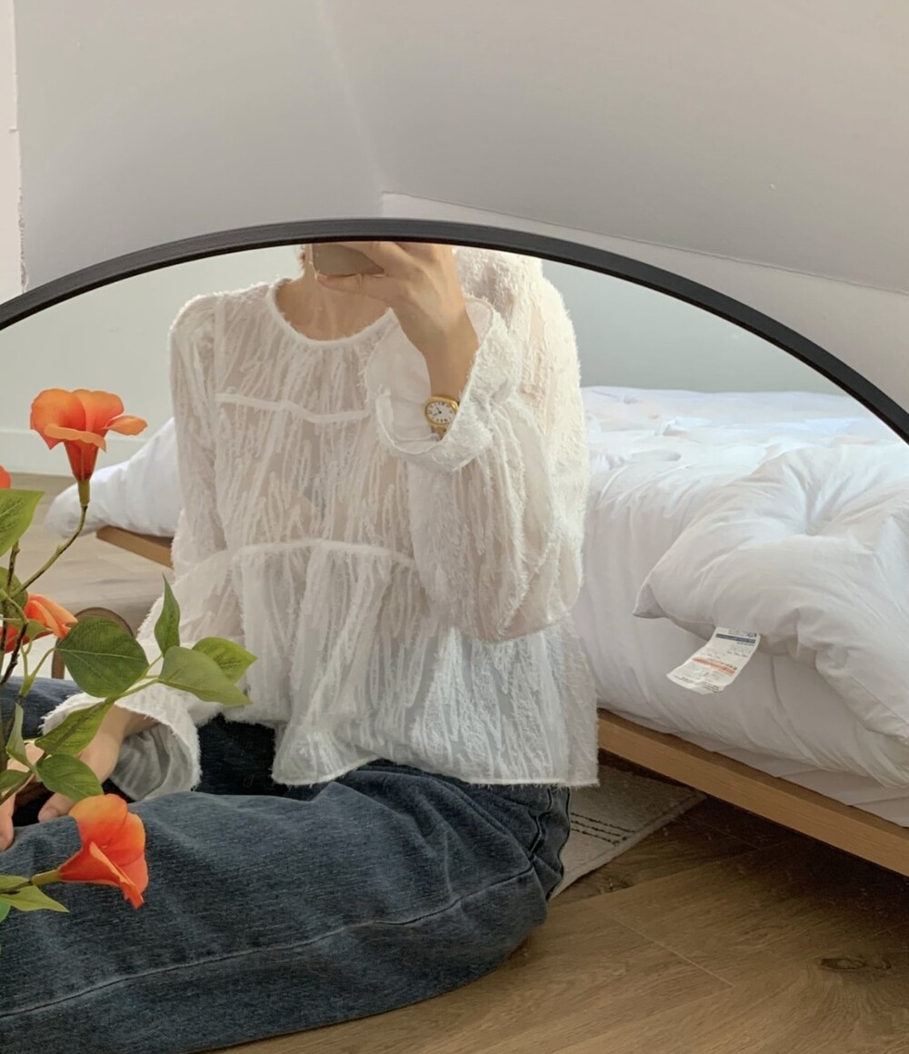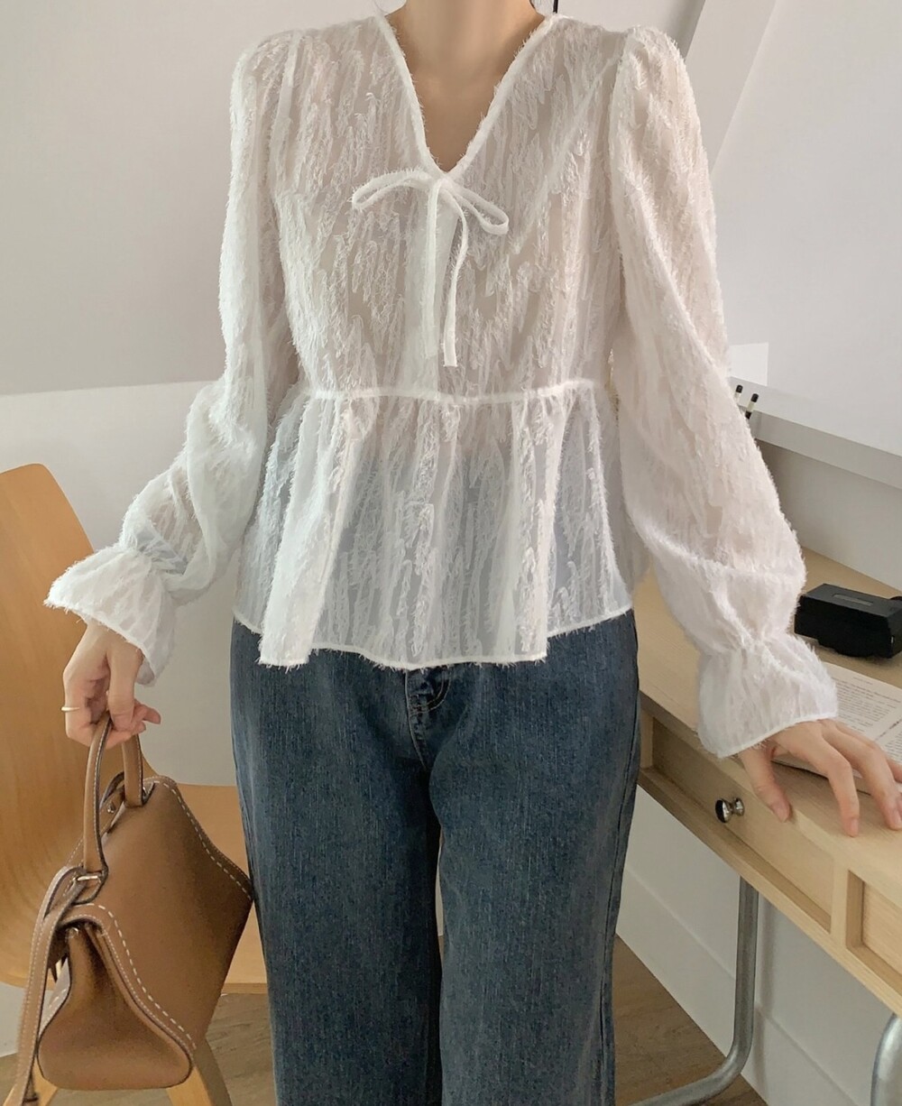 깃털 리본 끈 플레어 시스루 블라우스 (페미닌룩 데이트룩 파티룩)