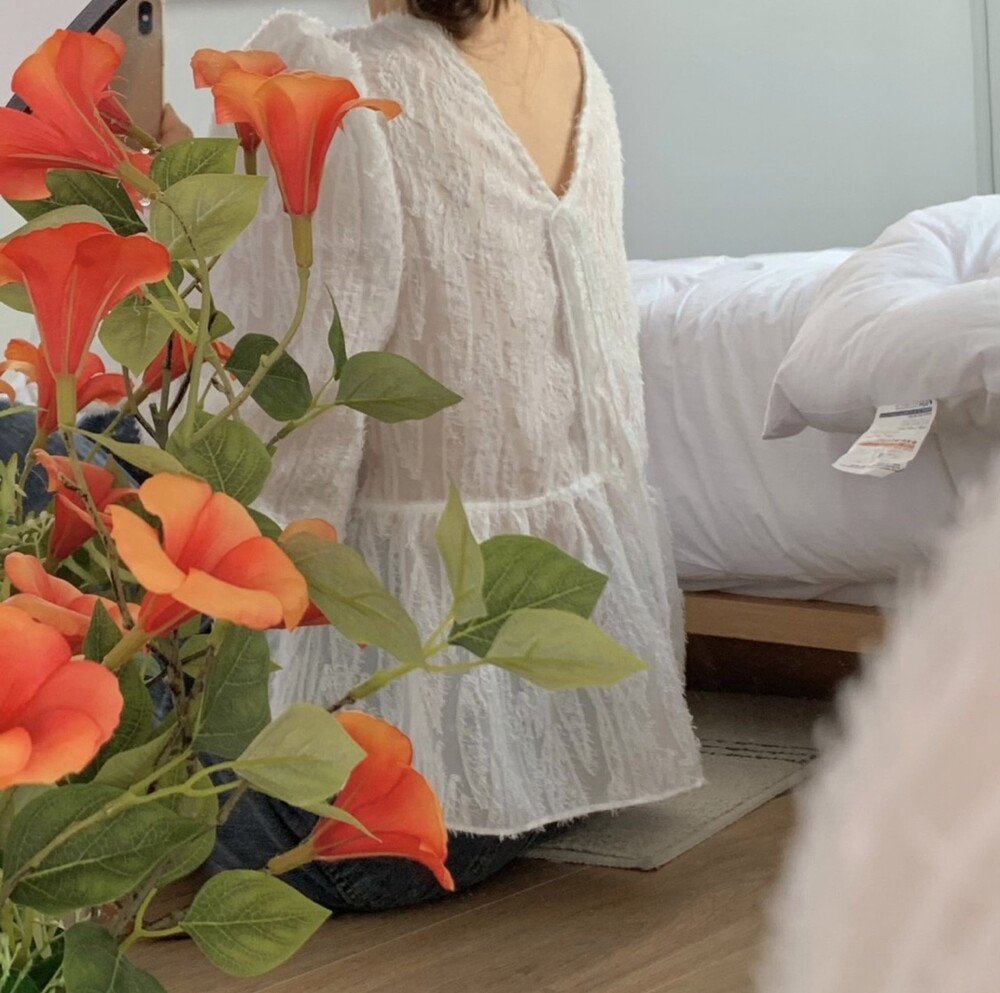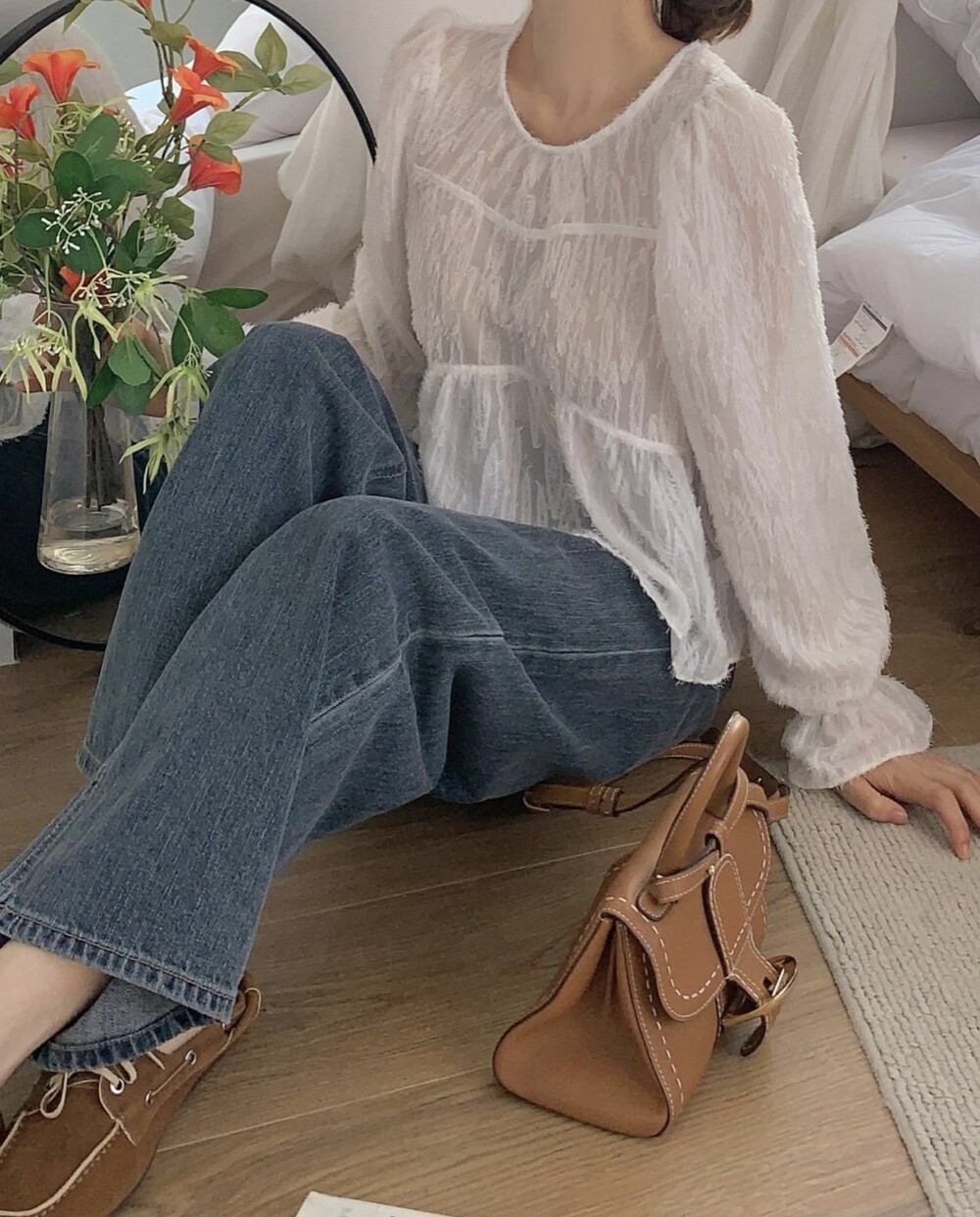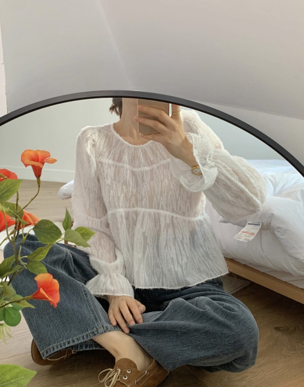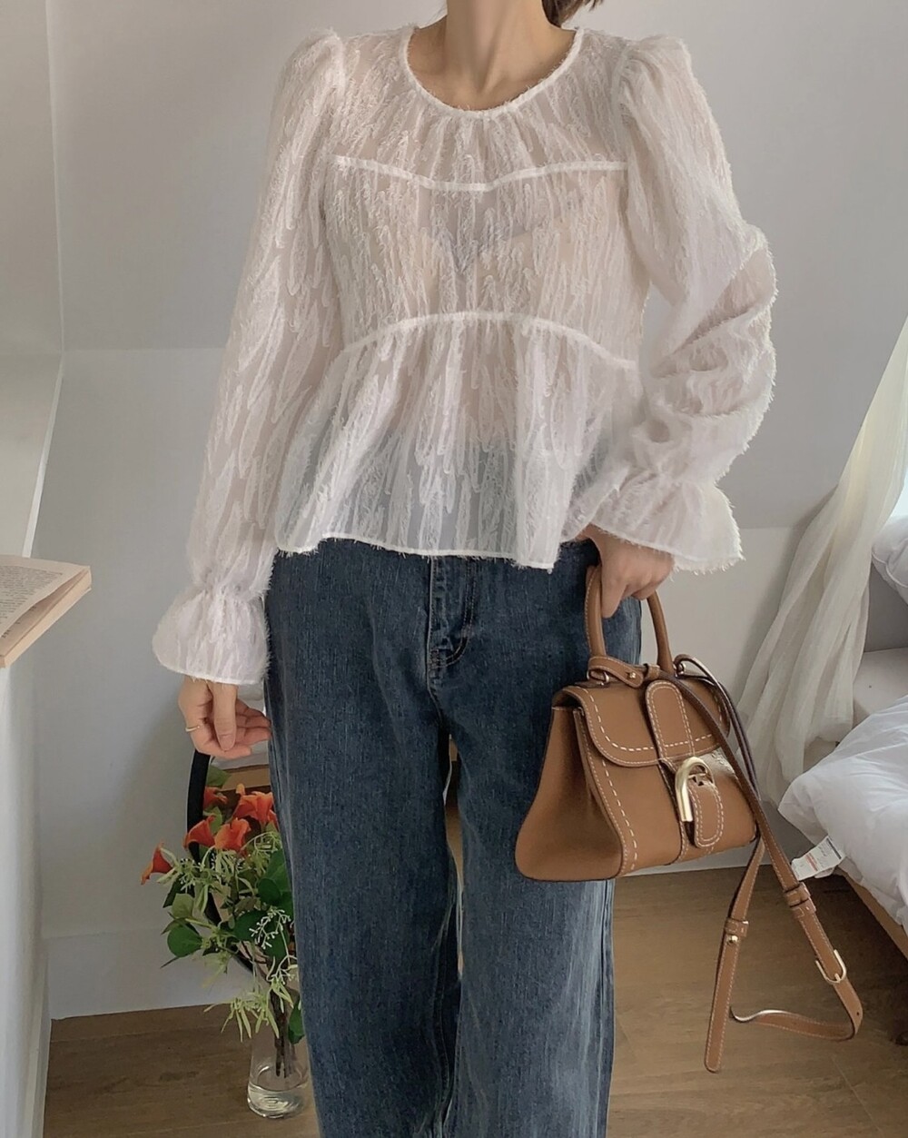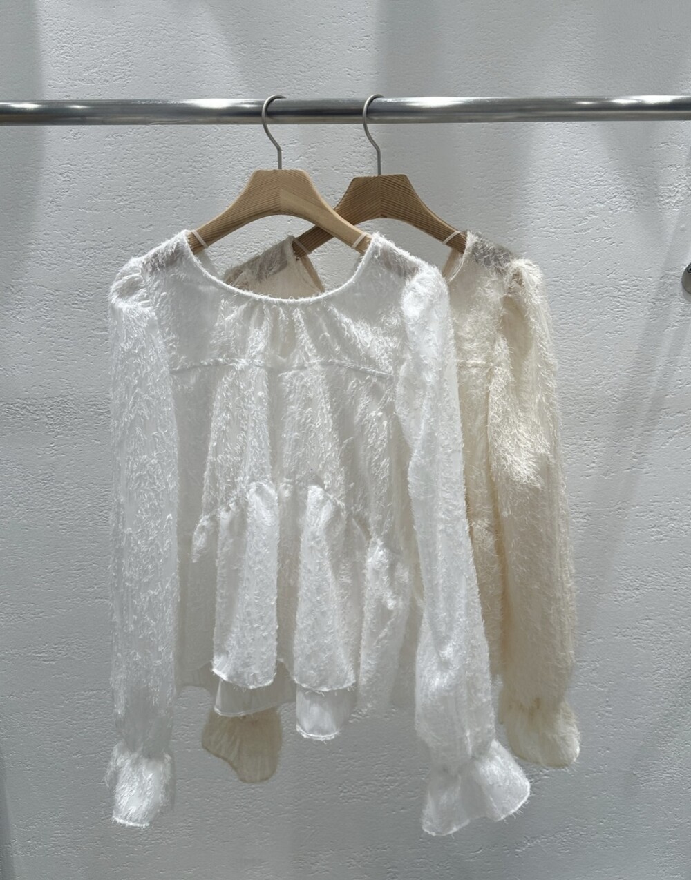 깃털 리본 끈 플레어 시스루 블라우스 (페미닌룩 데이트룩 파티룩)