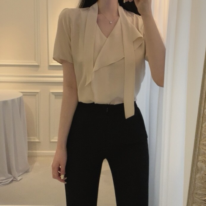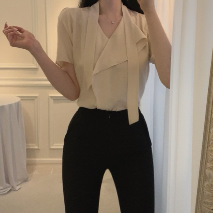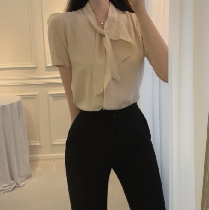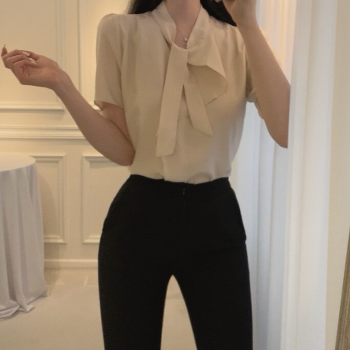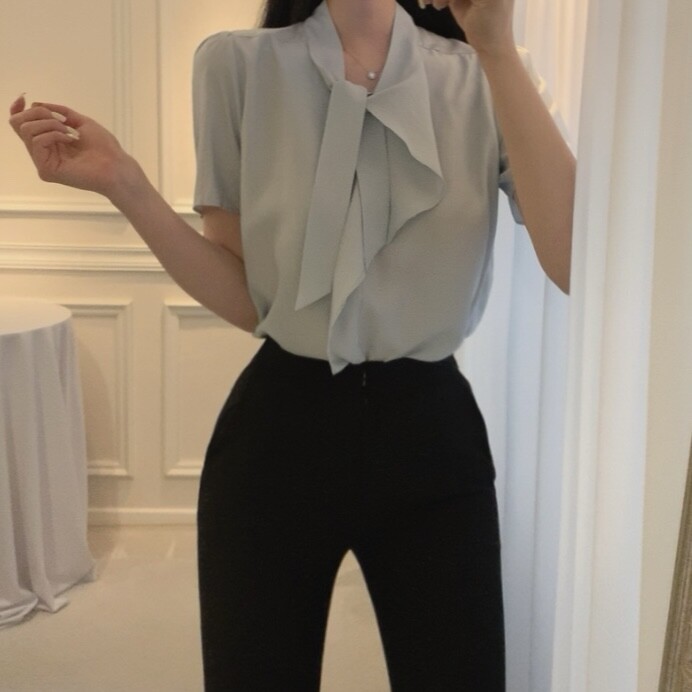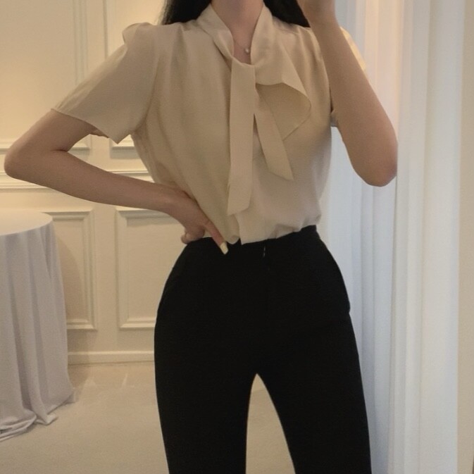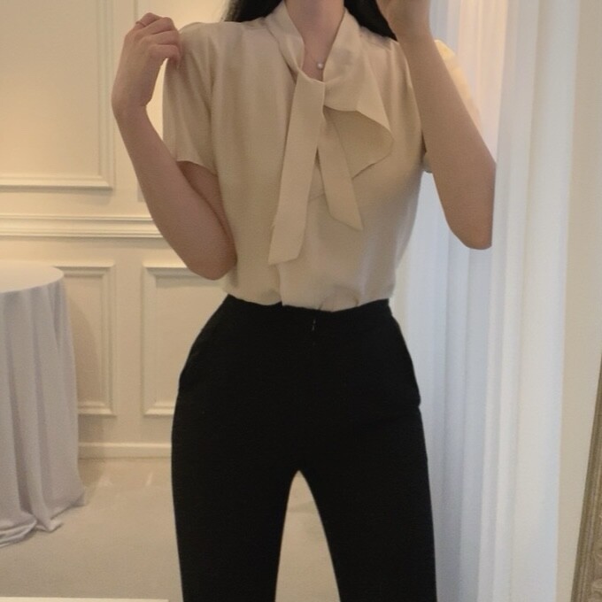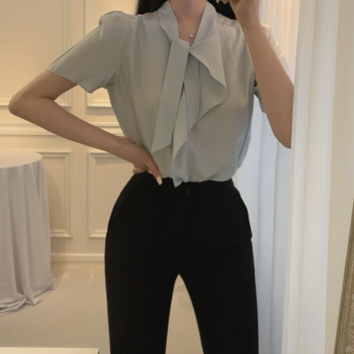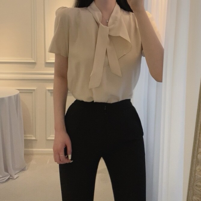 반팔 퍼프 소매 스카프 타이 셔링 프릴 러플 블라우스 (하객룩 결혼식 모임룩)