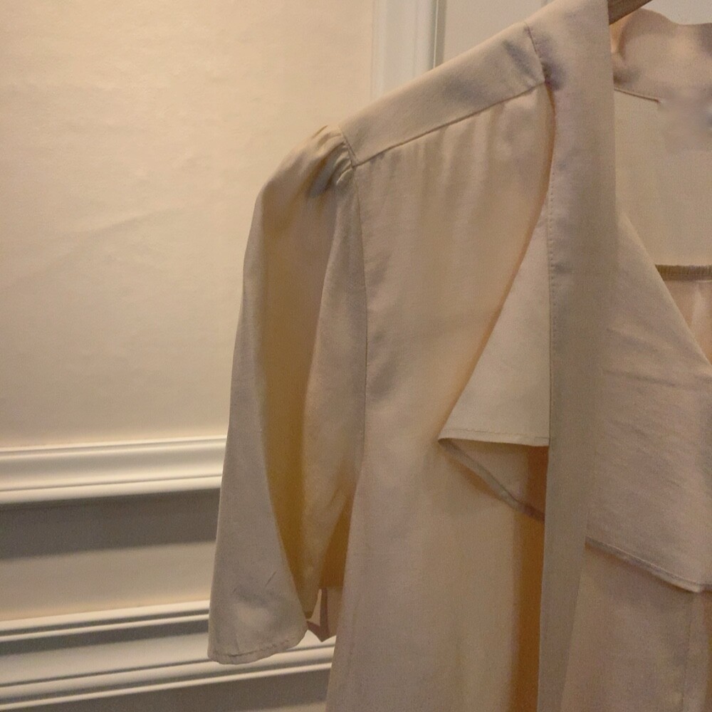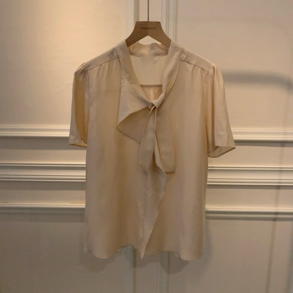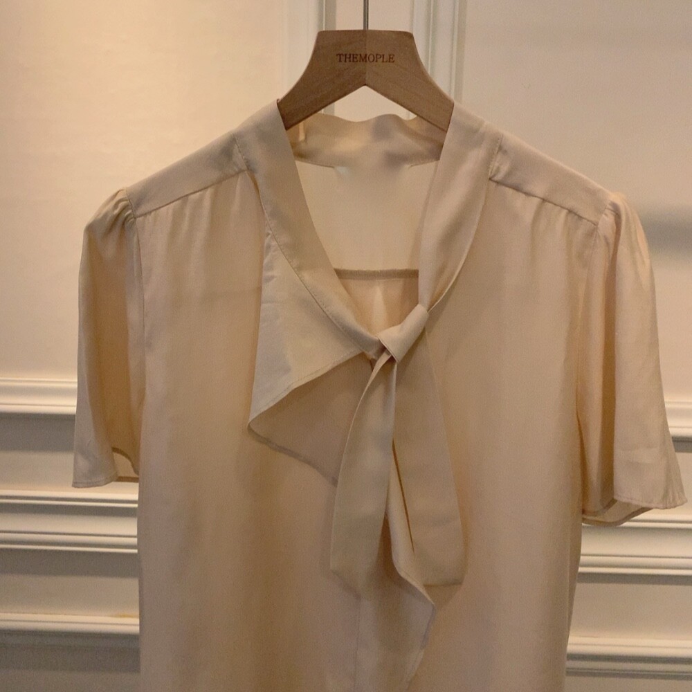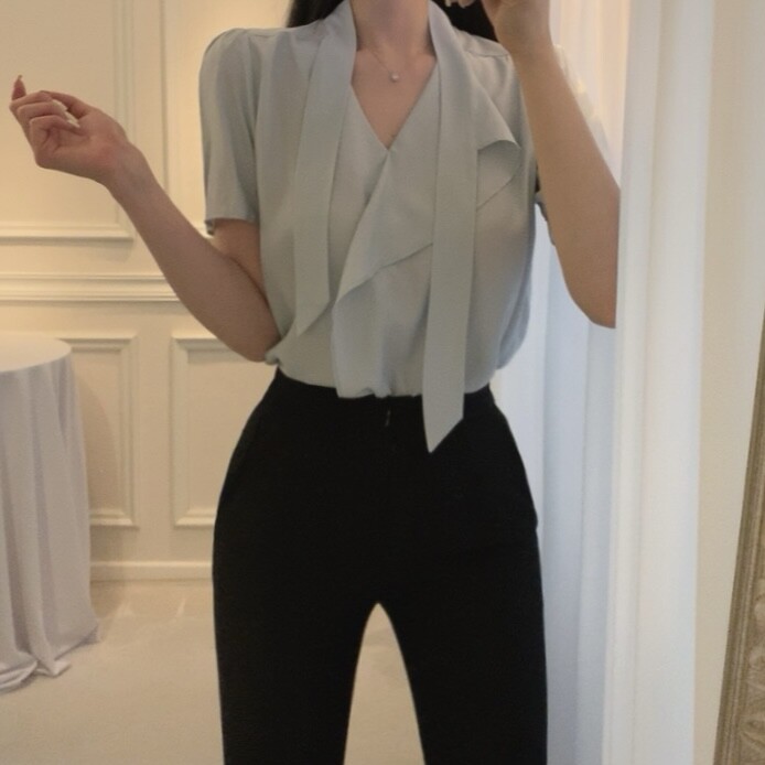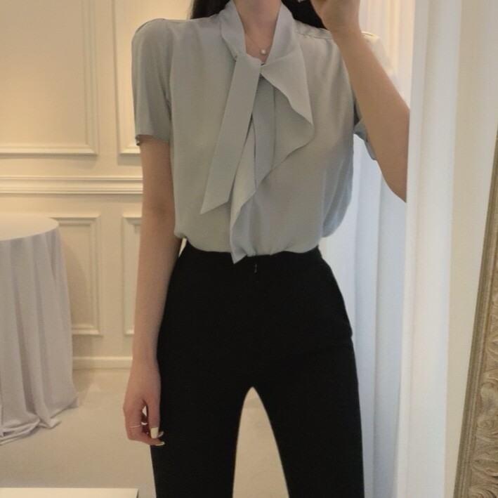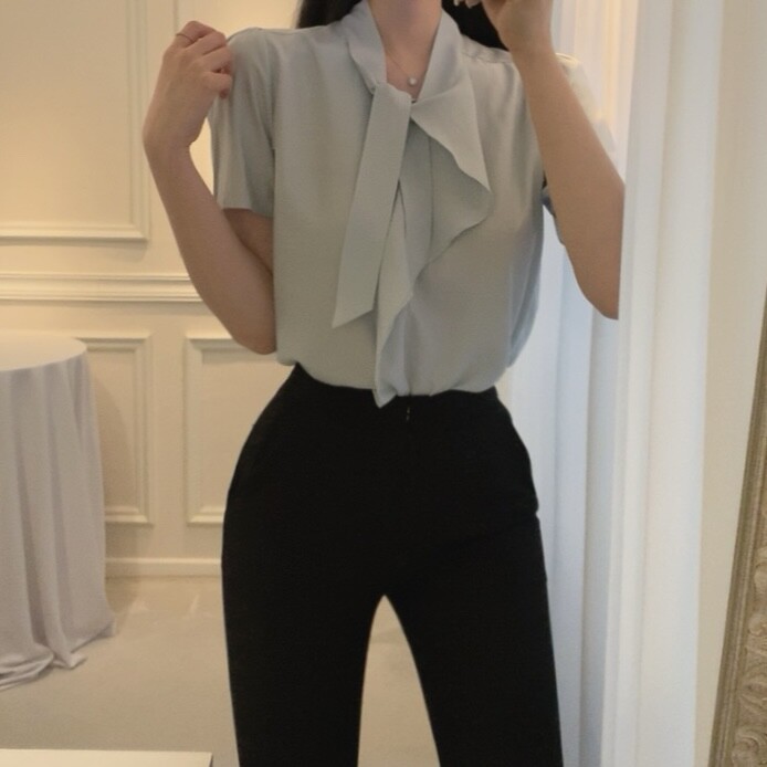 반팔 퍼프 소매 스카프 타이 셔링 프릴 러플 블라우스 (하객룩 결혼식 모임룩)