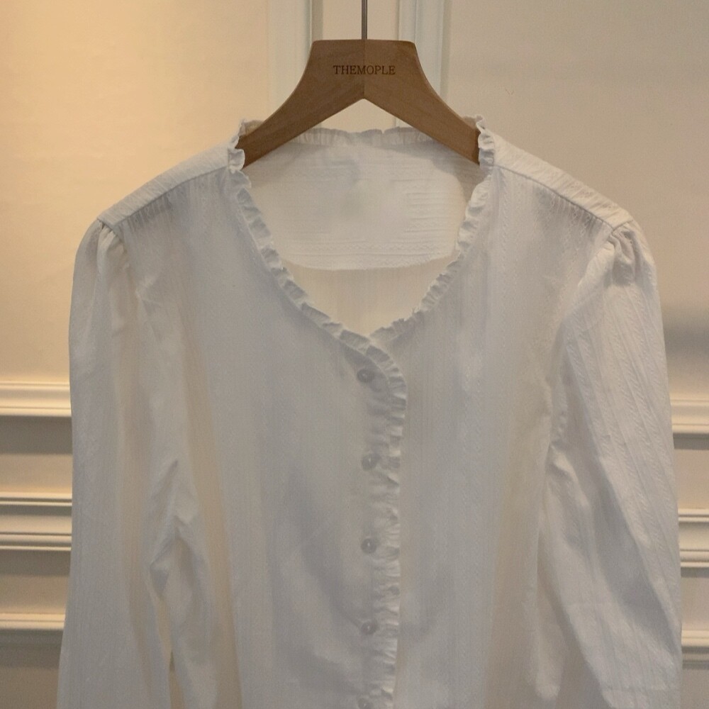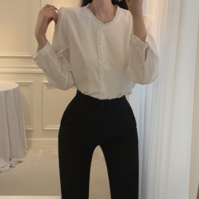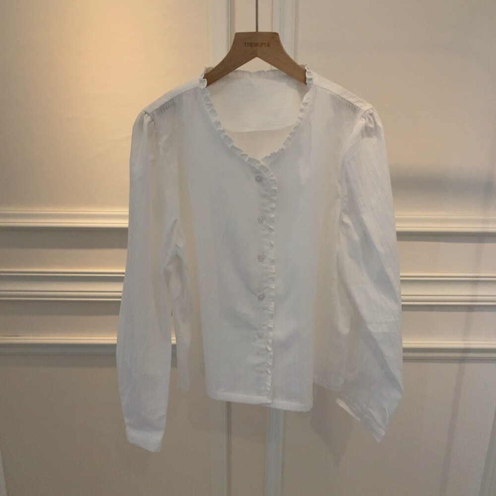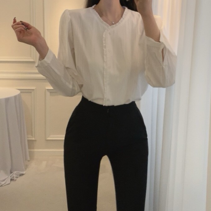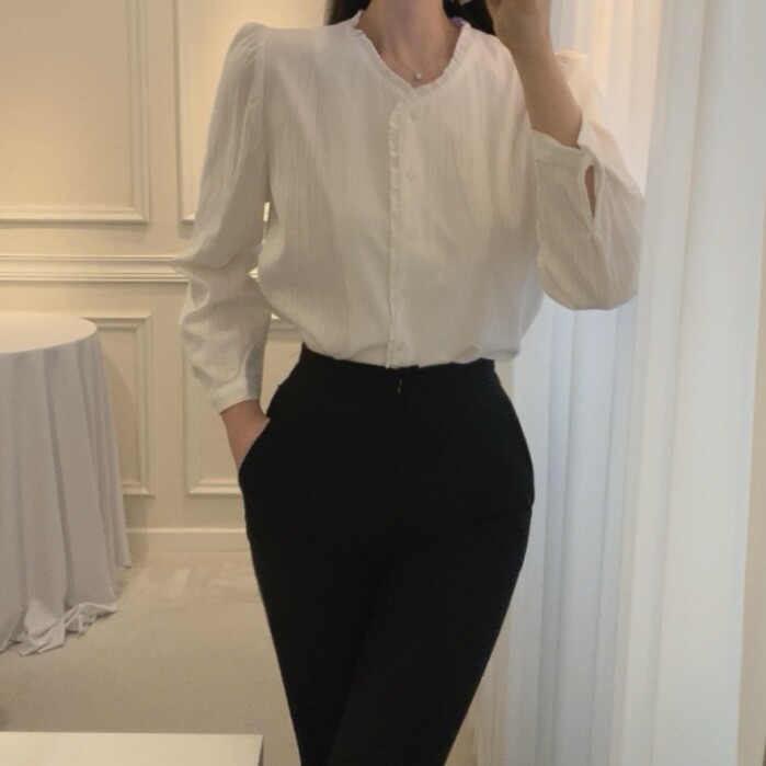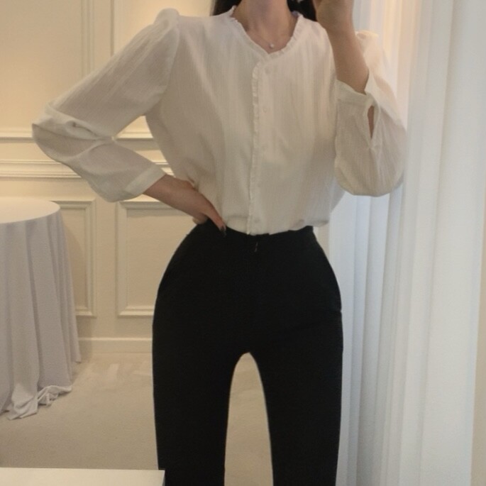 프릴 레이스 단추 핀턱 퍼프 소매 루즈핏 블라우스 (하객룩 데이트룩 여행코디)