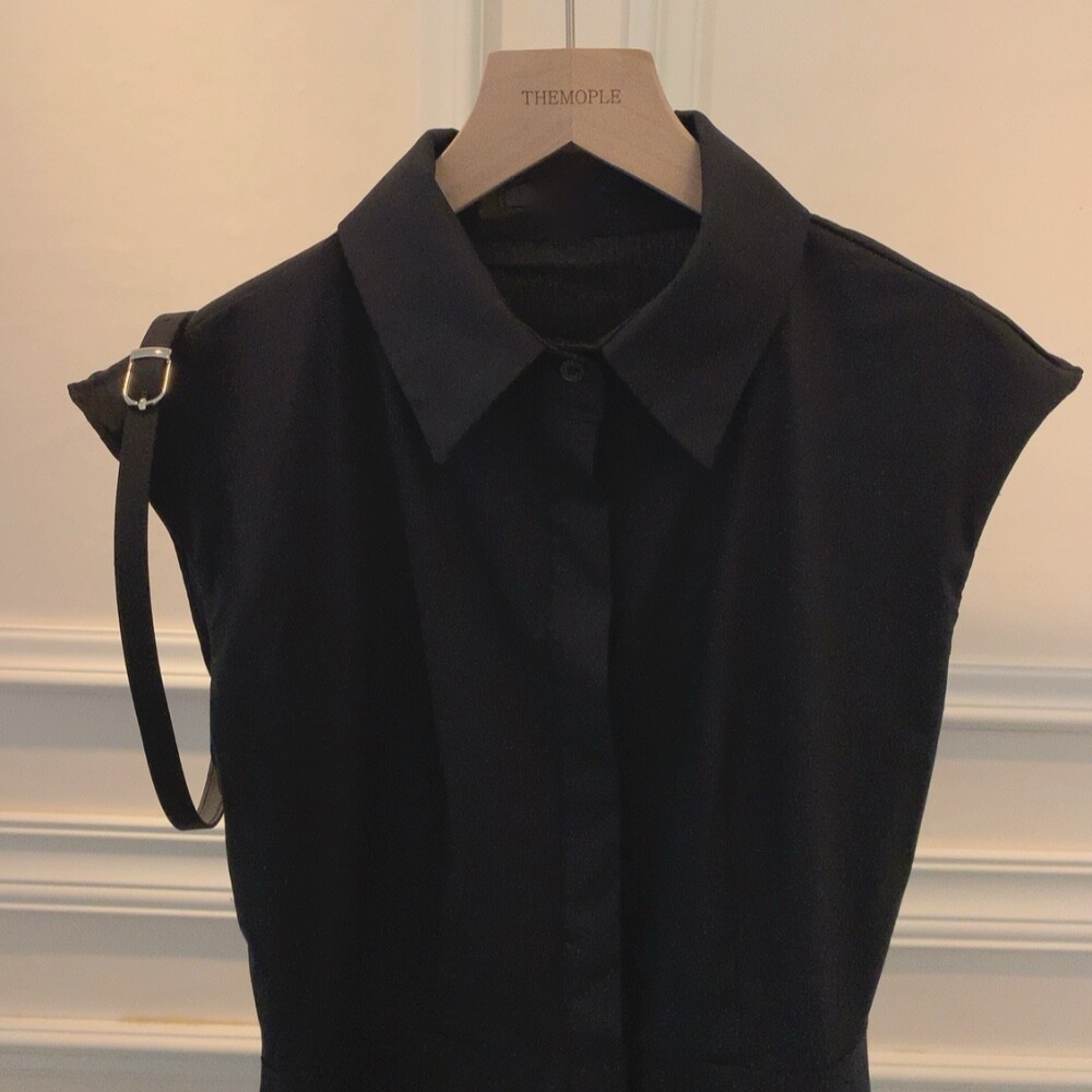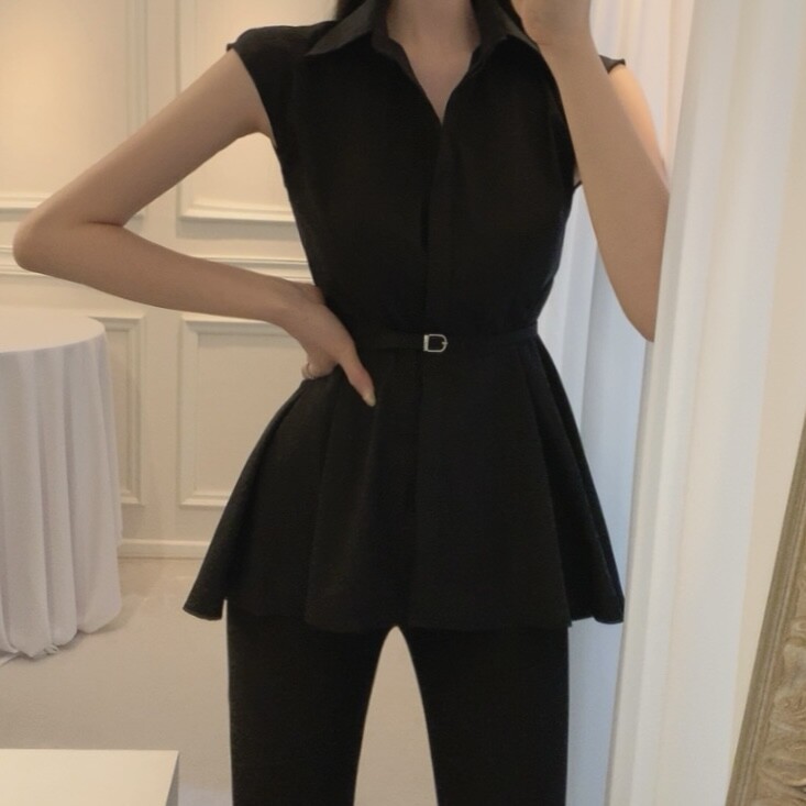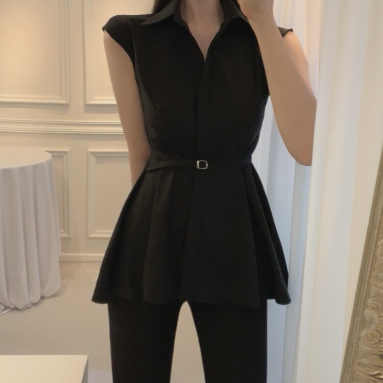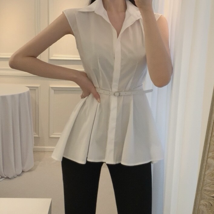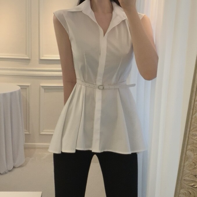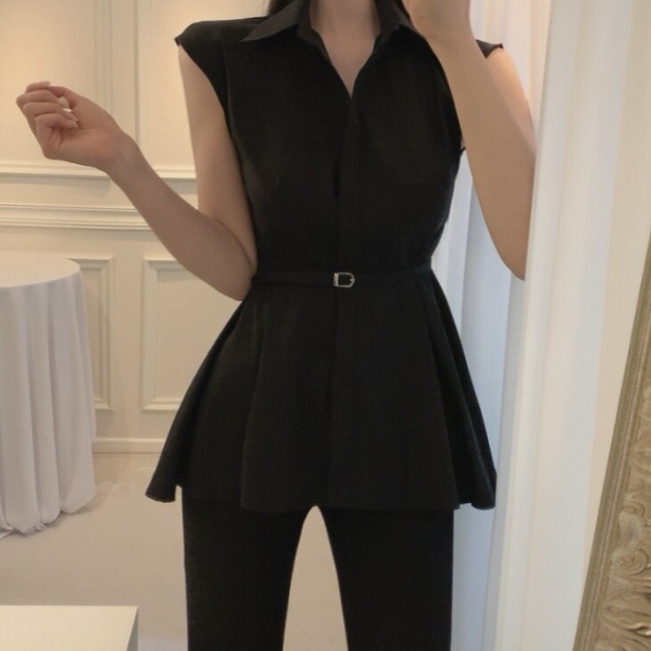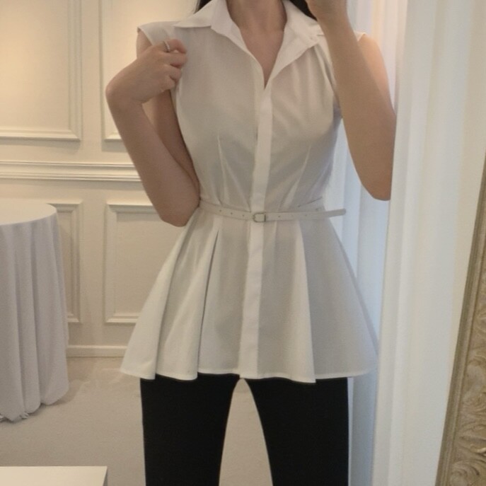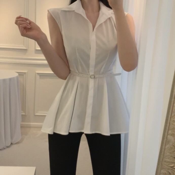 셔츠 카라 민소매 나시 벨트세트 플레어 블라우스 (하객룩 데이트룩 페미닌룩)