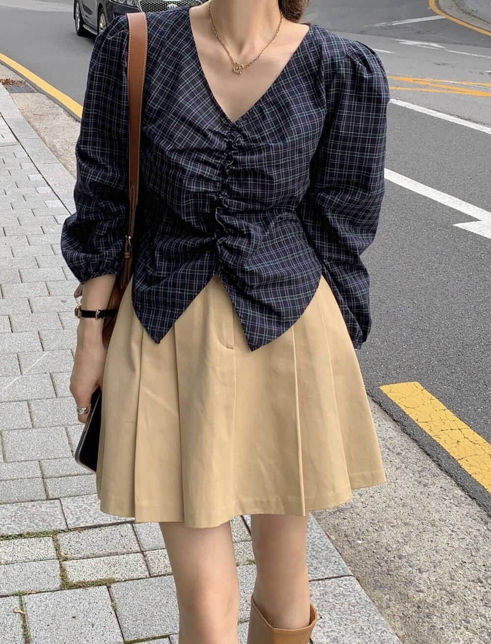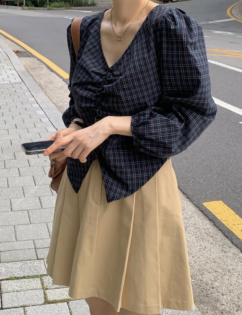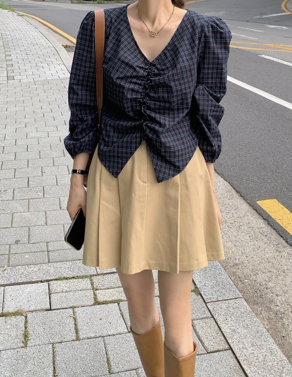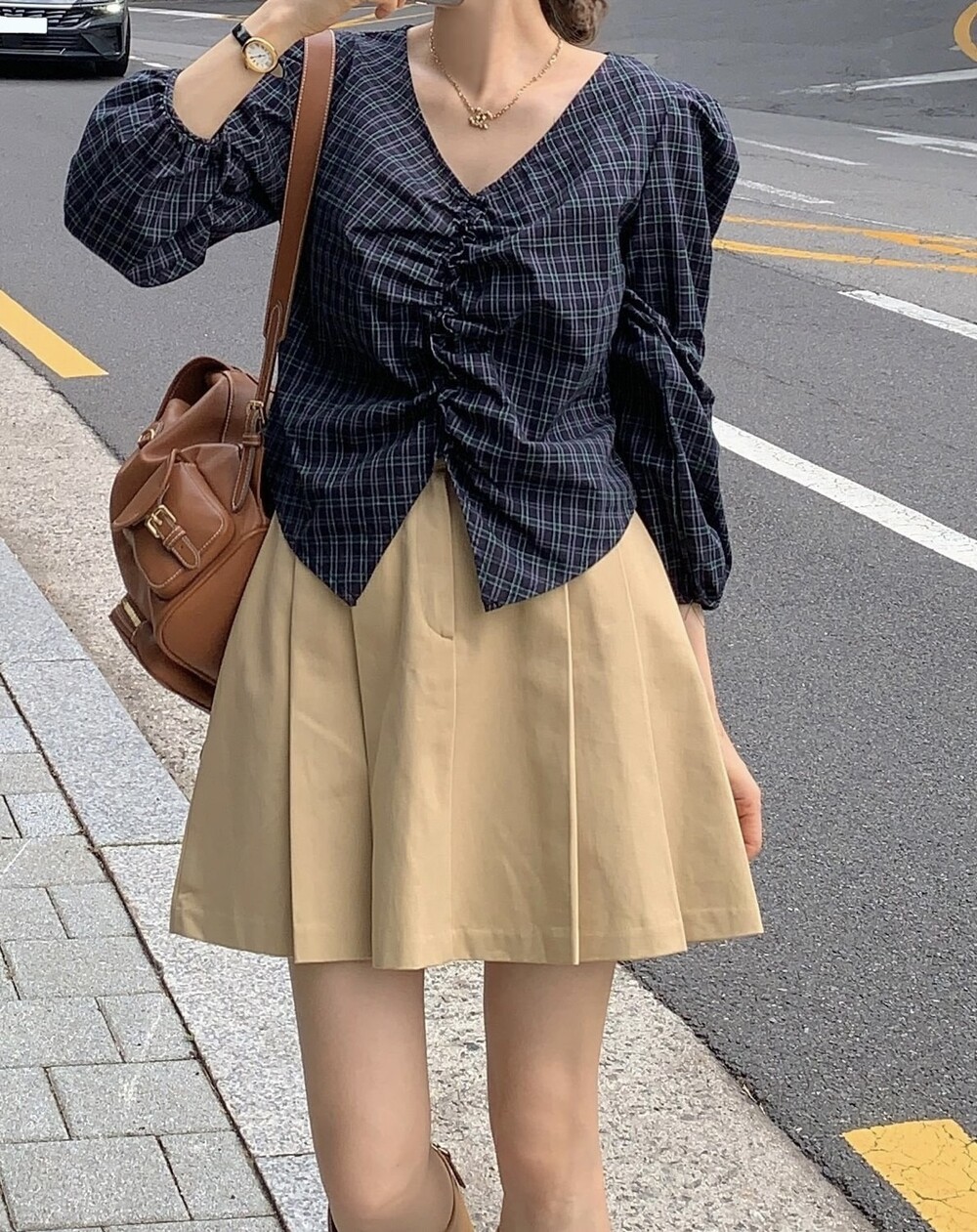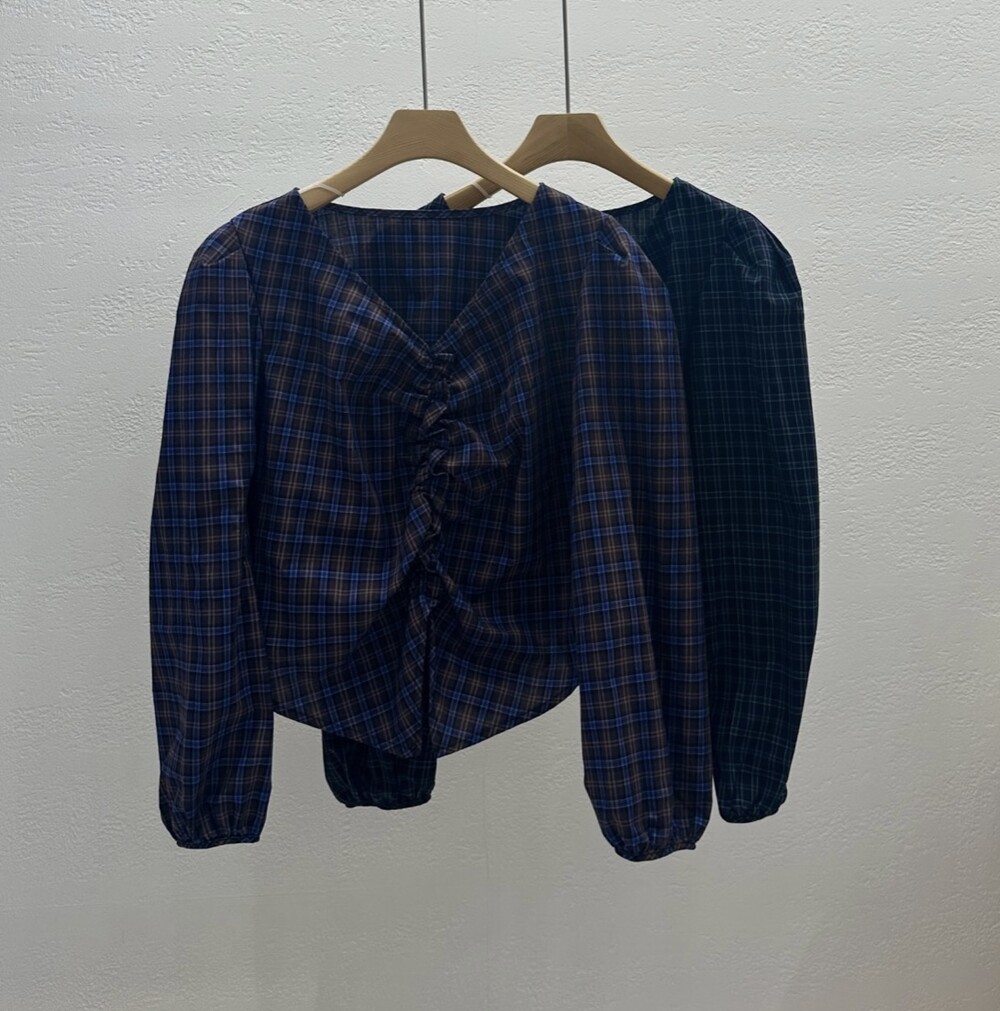 체크 셔링 볼륨 주름 긴팔 블라우스 (데이트룩 데일리 하객룩)