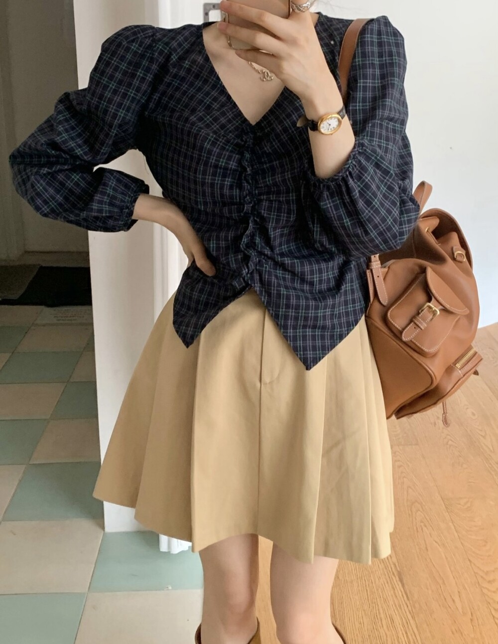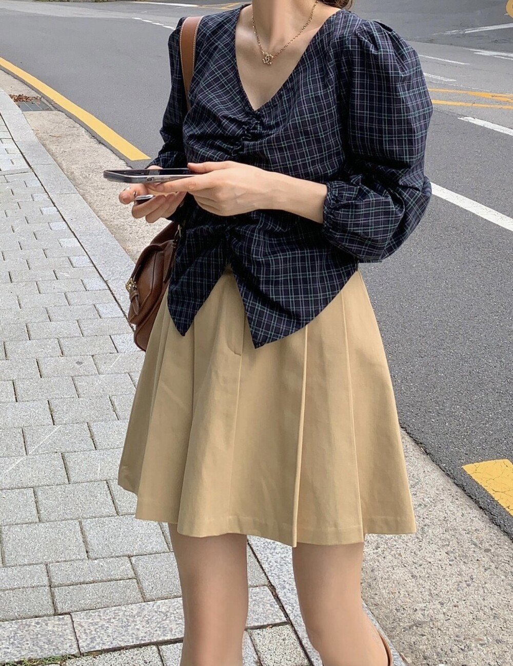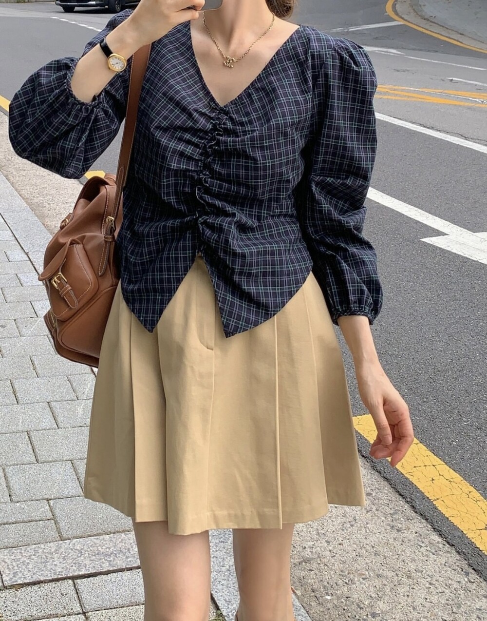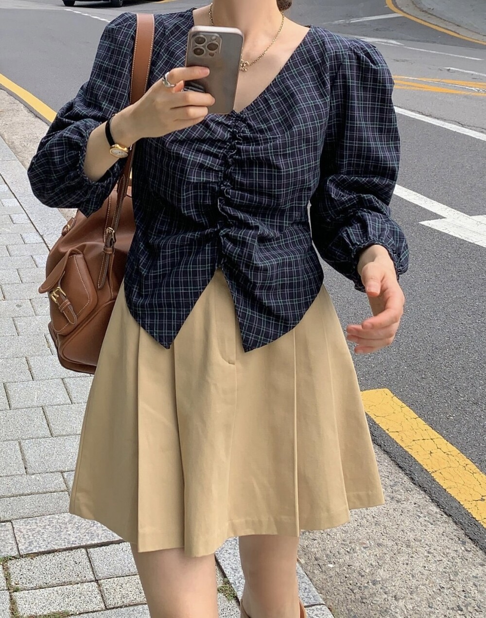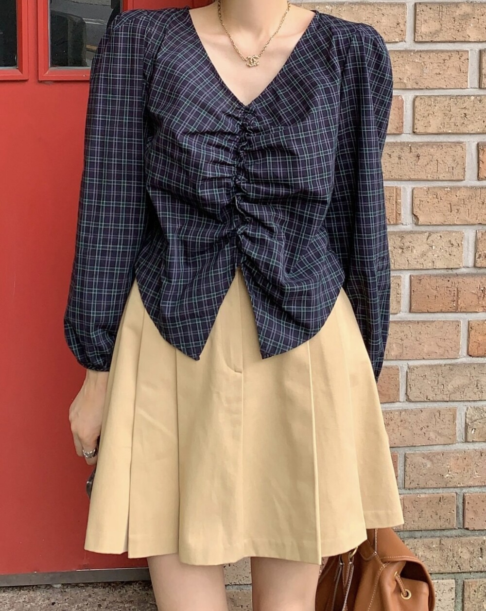 체크 셔링 볼륨 주름 긴팔 블라우스 (데이트룩 데일리 하객룩)