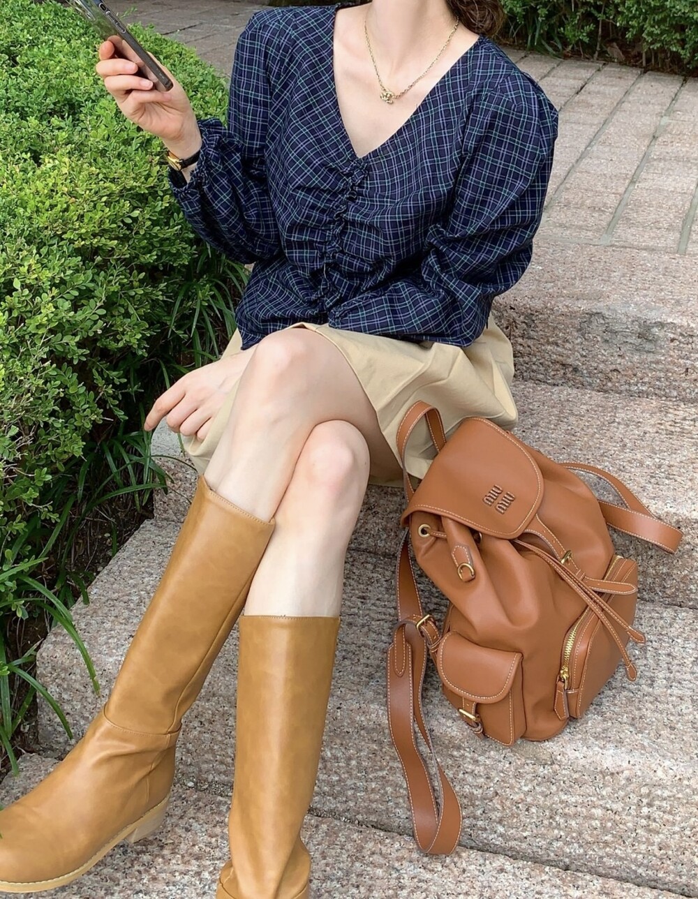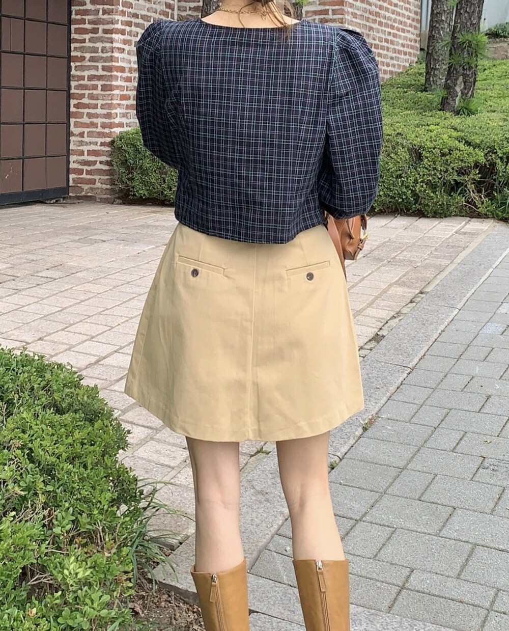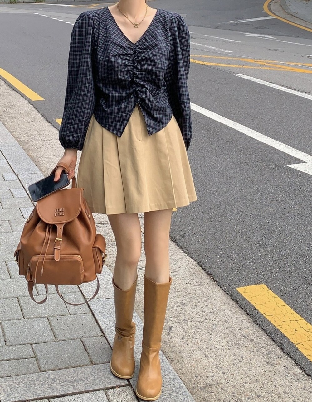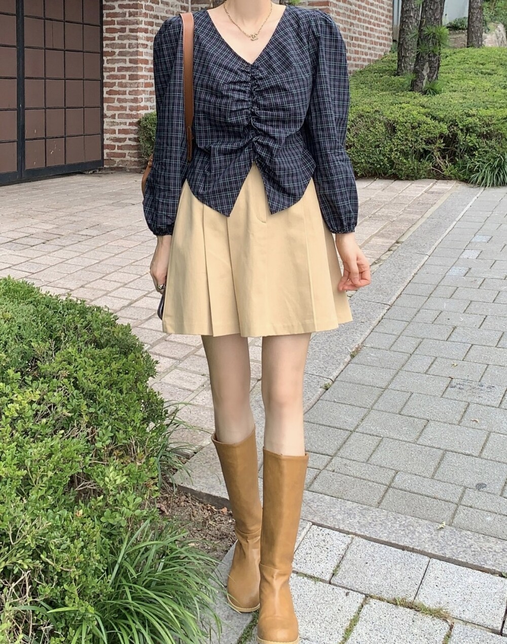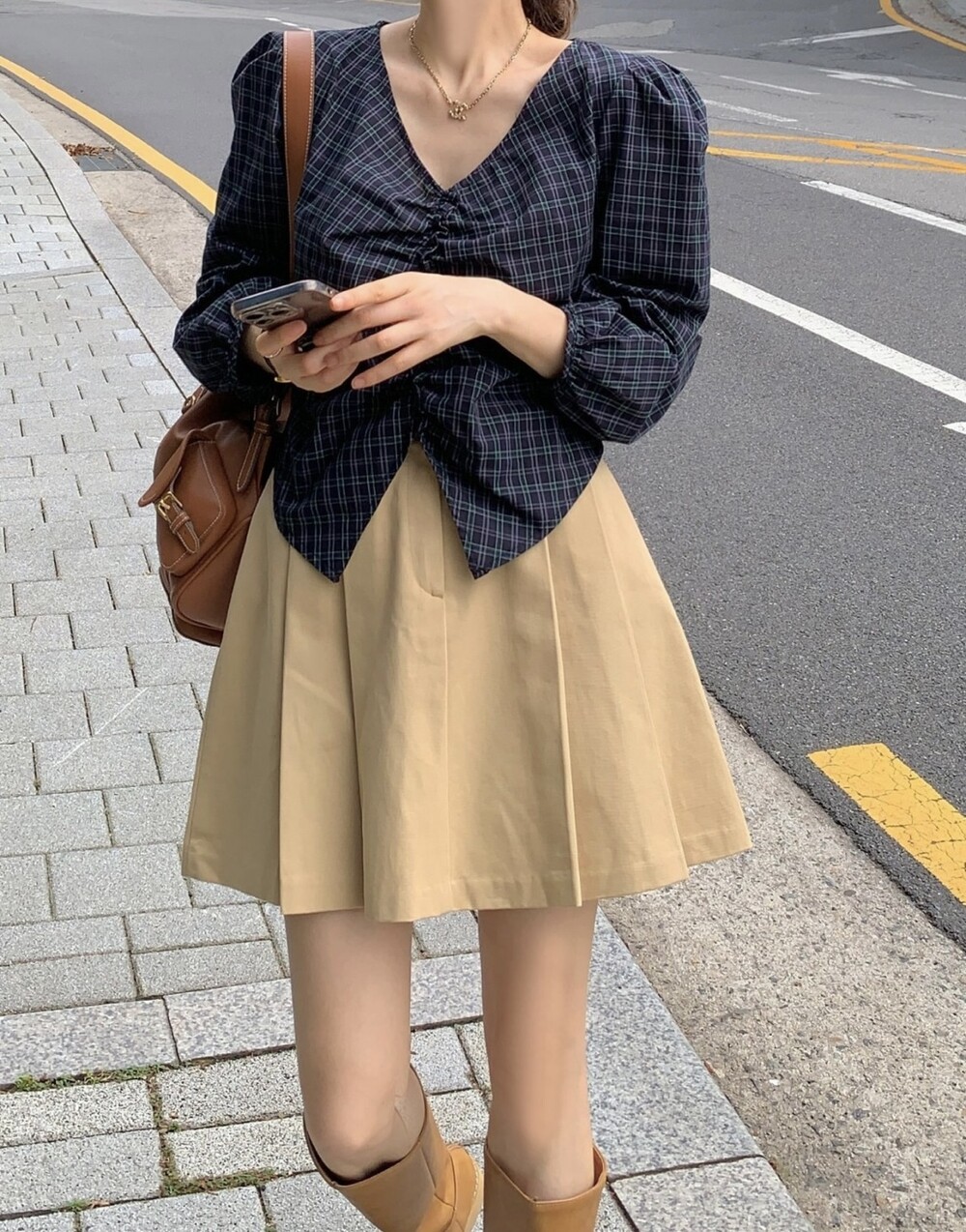 체크 셔링 볼륨 주름 긴팔 블라우스 (데이트룩 데일리 하객룩)