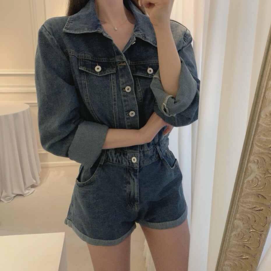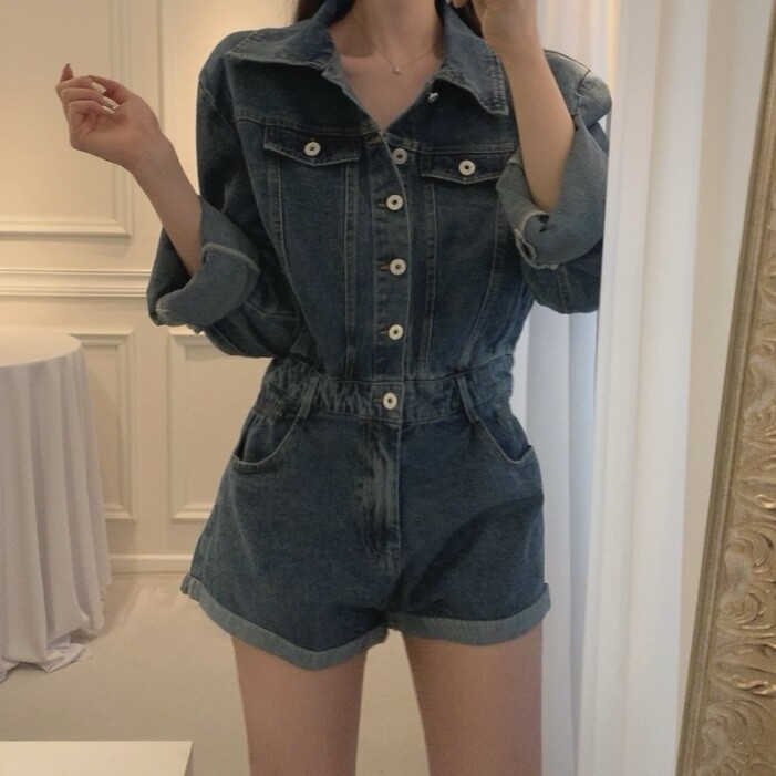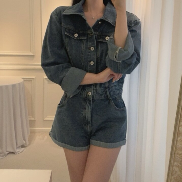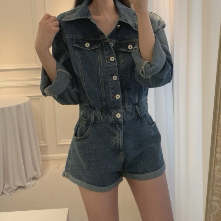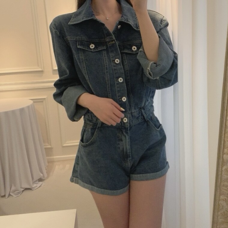 (고퀄리티) 데님 청 긴팔 루즈핏 허리 밴딩 롤업 반바지 점프수트