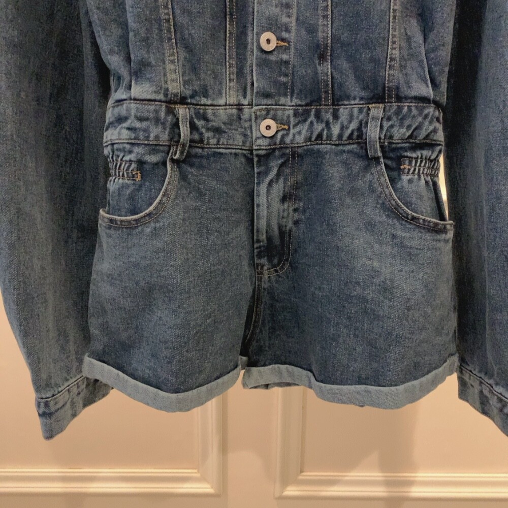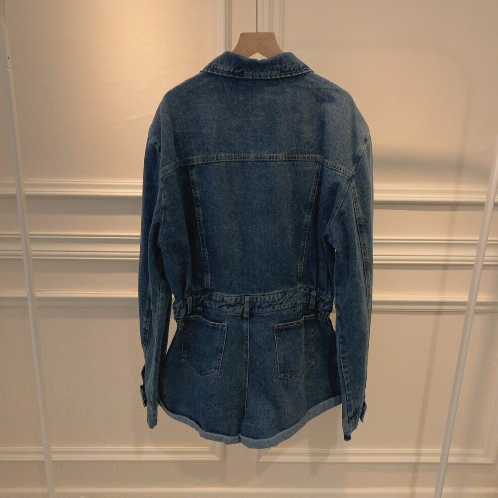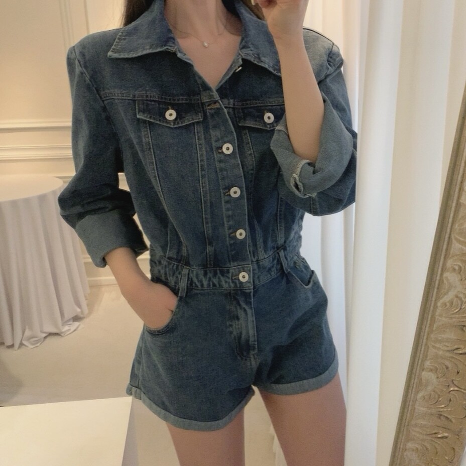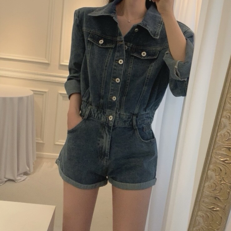 (고퀄리티) 데님 청 긴팔 루즈핏 허리 밴딩 롤업 반바지 점프수트