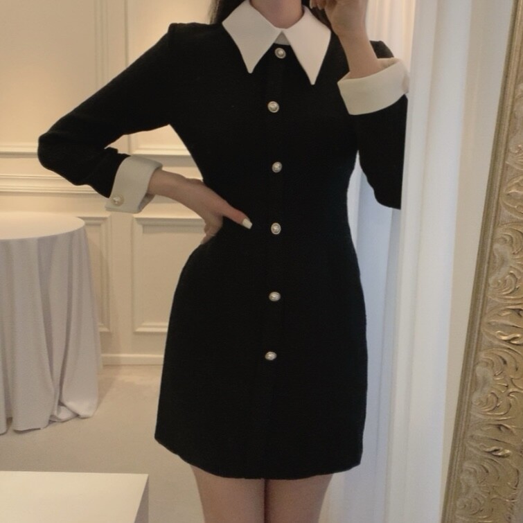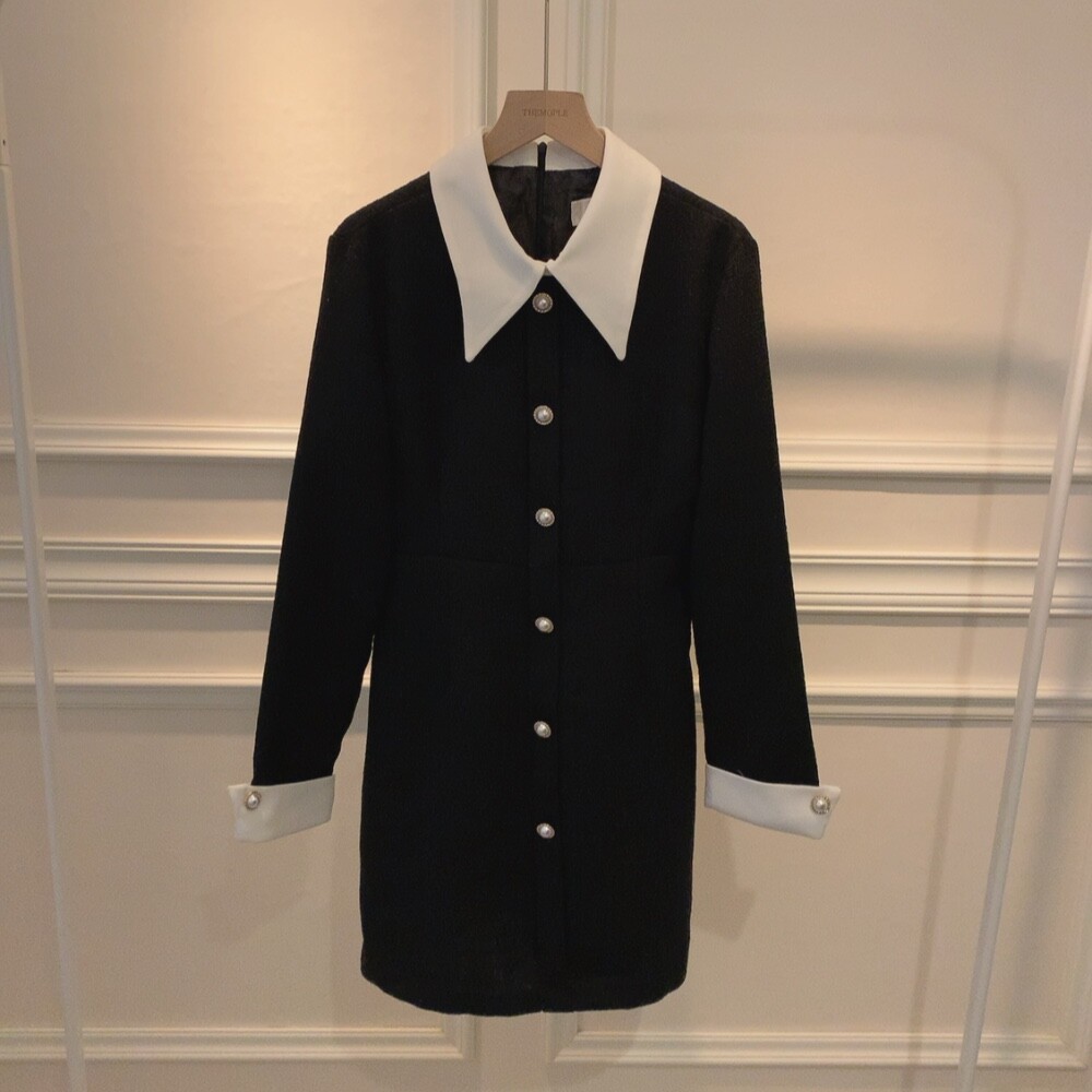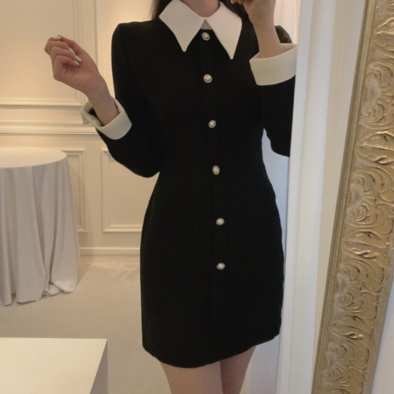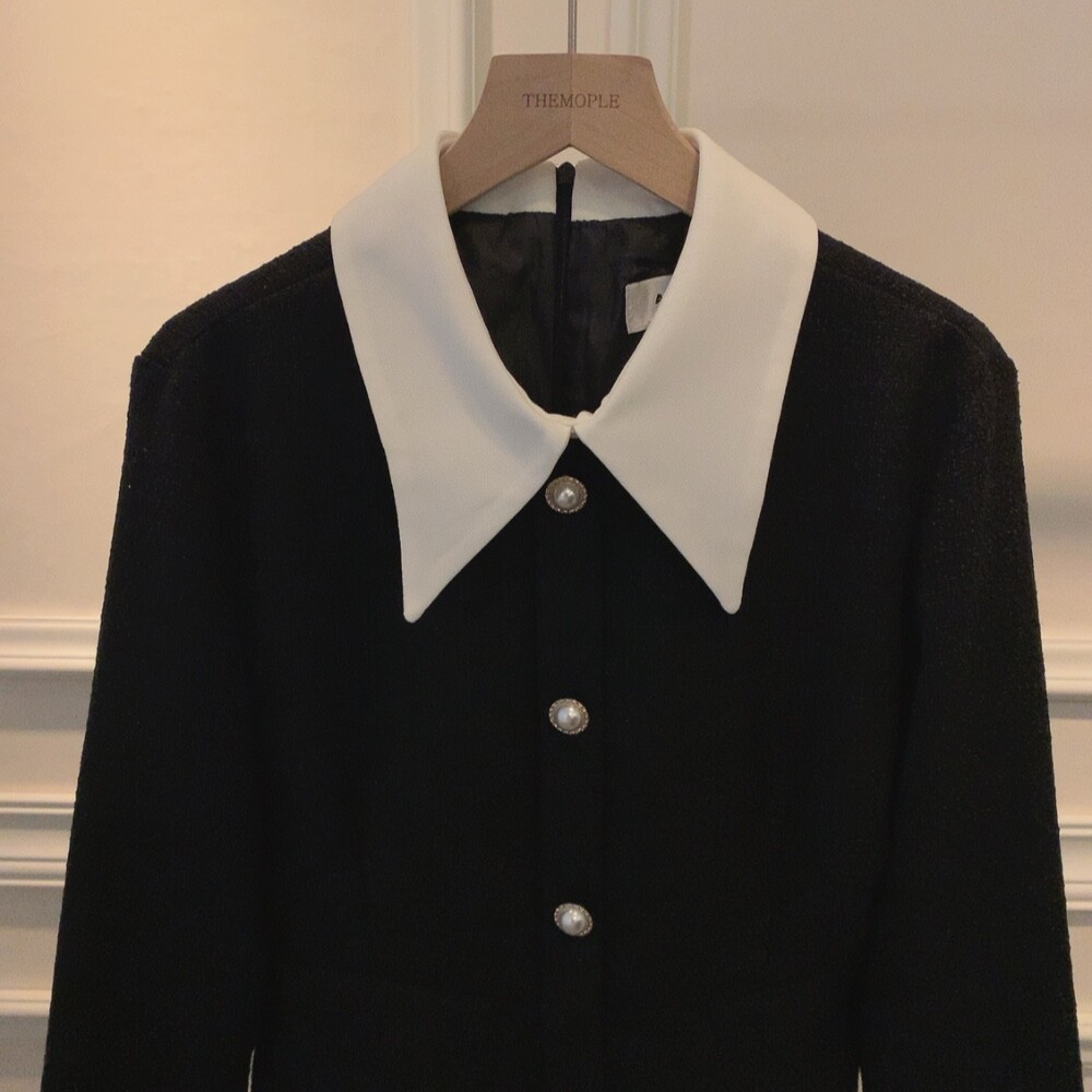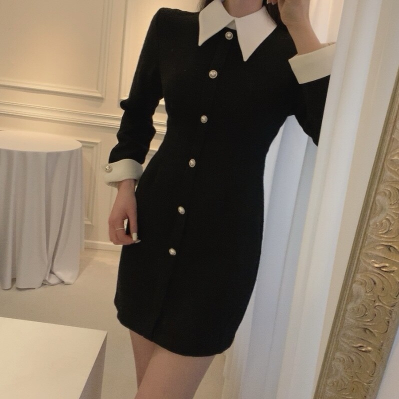 트위드 카라 배색 진주 버튼 슬림핏 미니원피스 (하객룩 결혼식 격식있는룩)