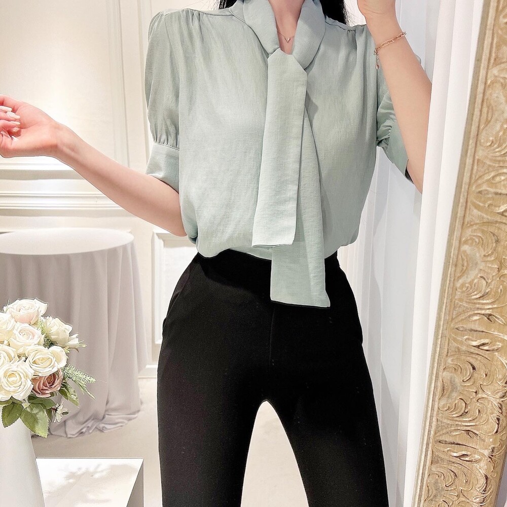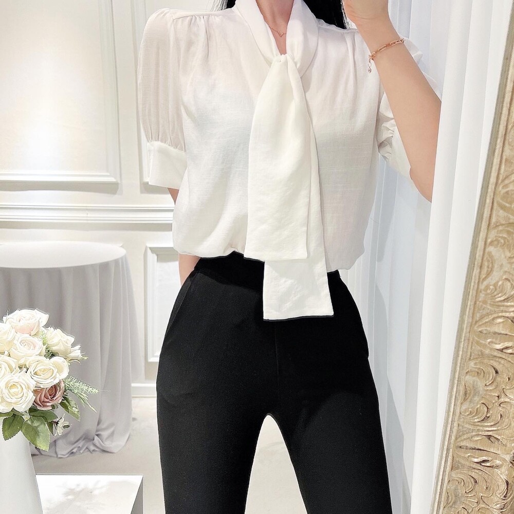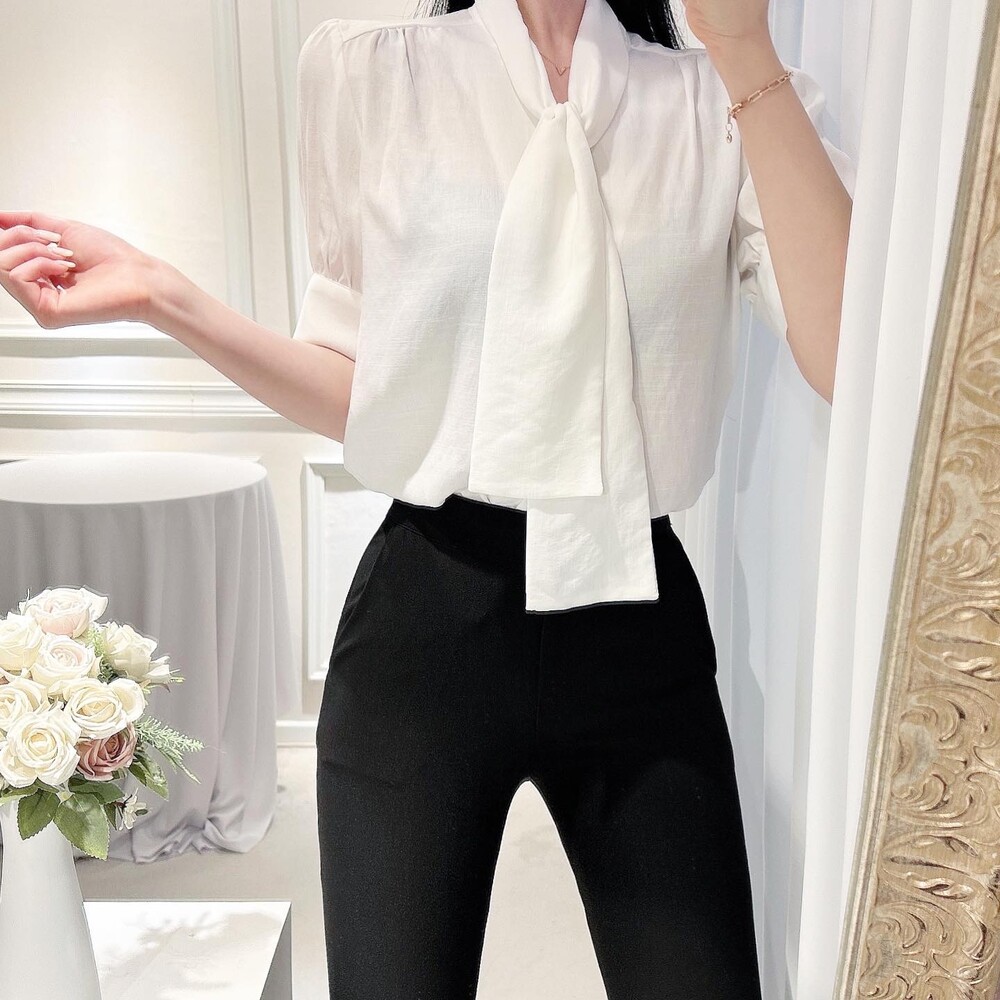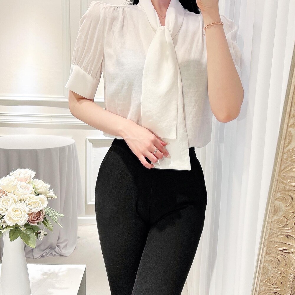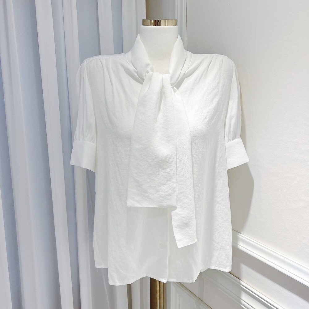 [SALE 원가이하 세일] 린넨 여름 반팔 스카프 타이 리본 퍼프 소매 블라우스 (하객룩 데이트룩 오피스룩)