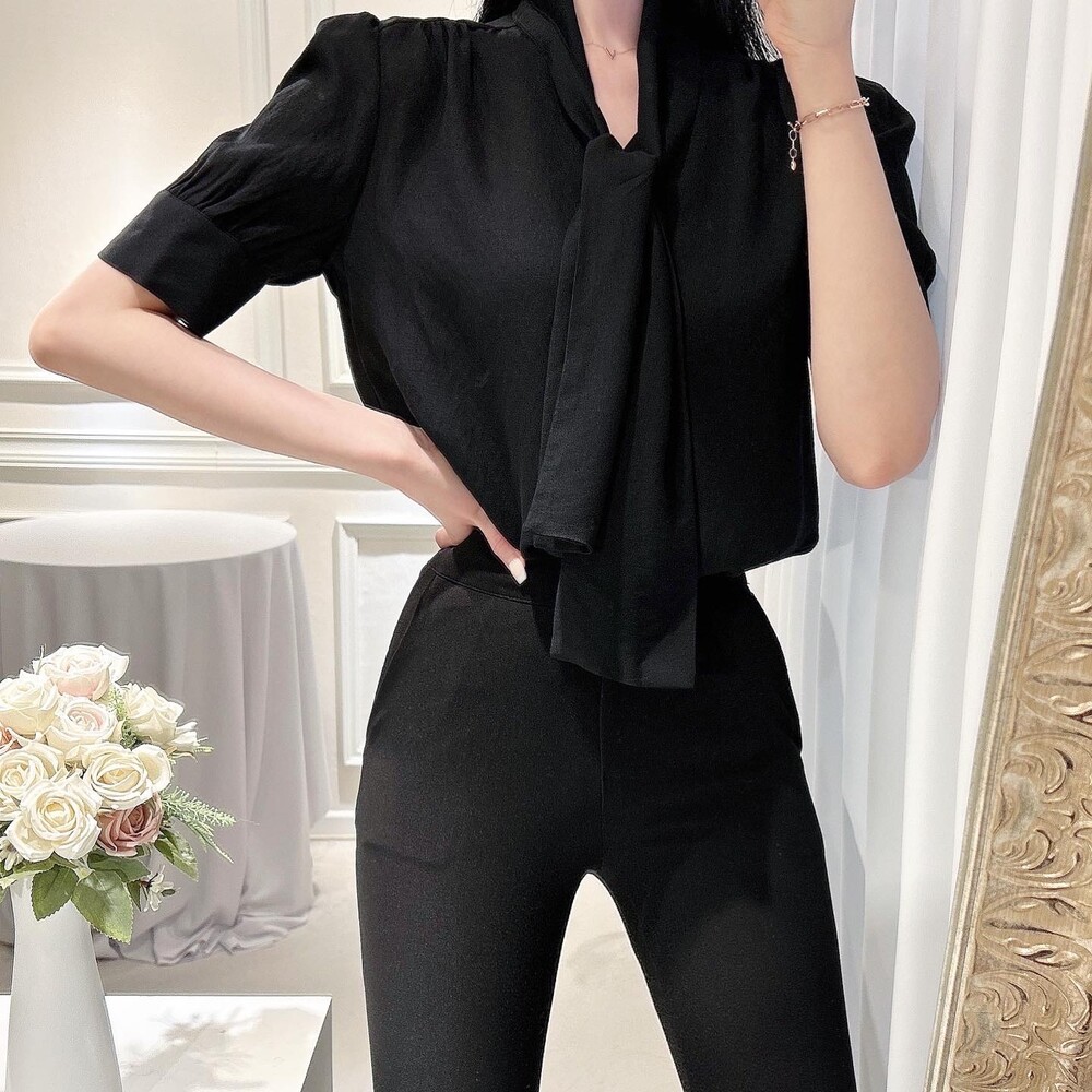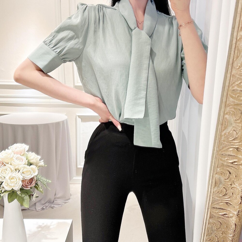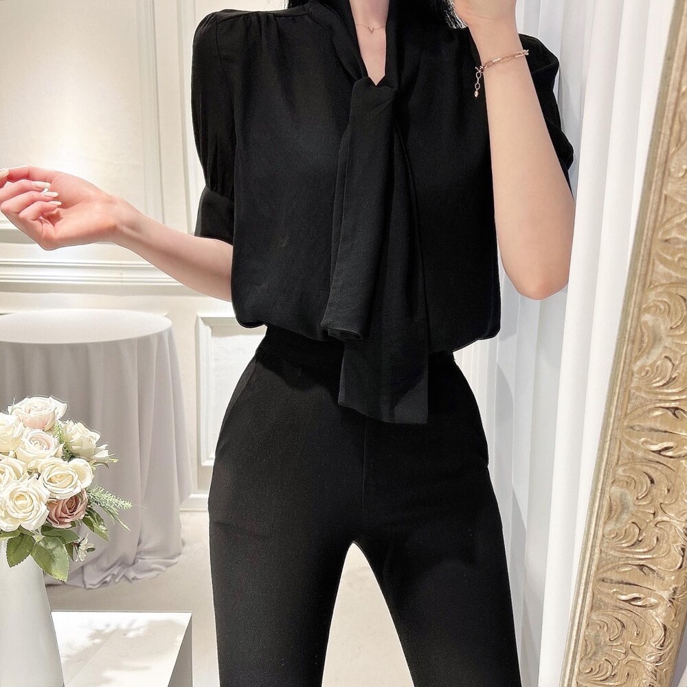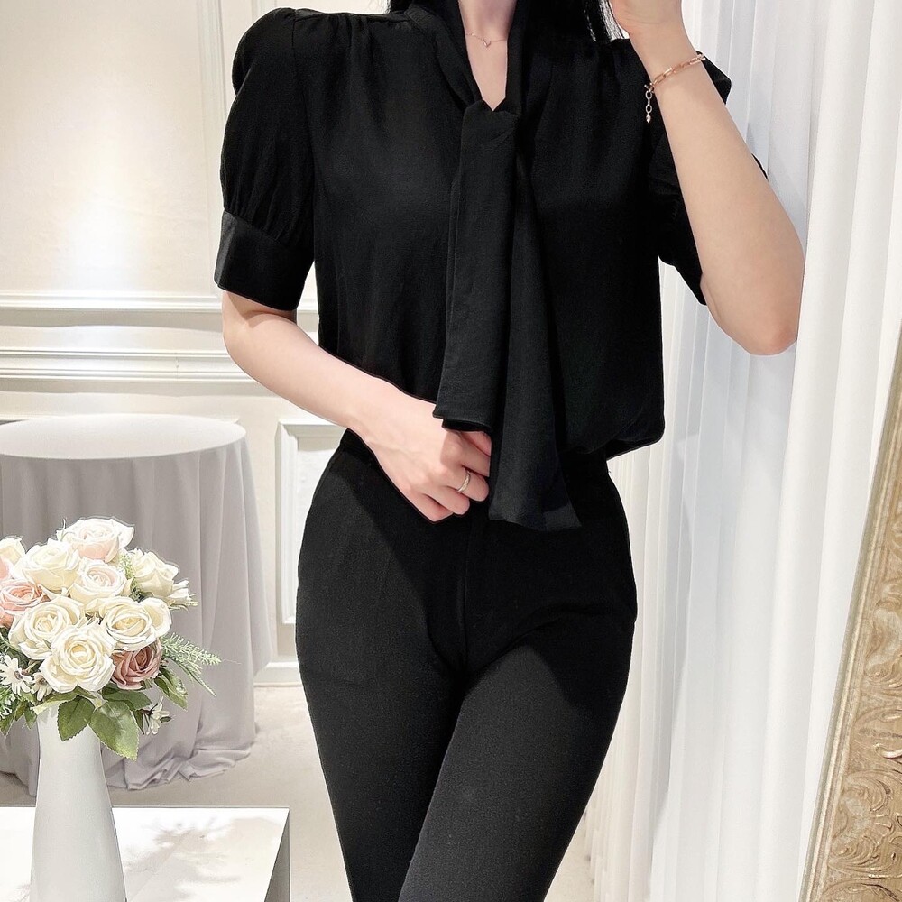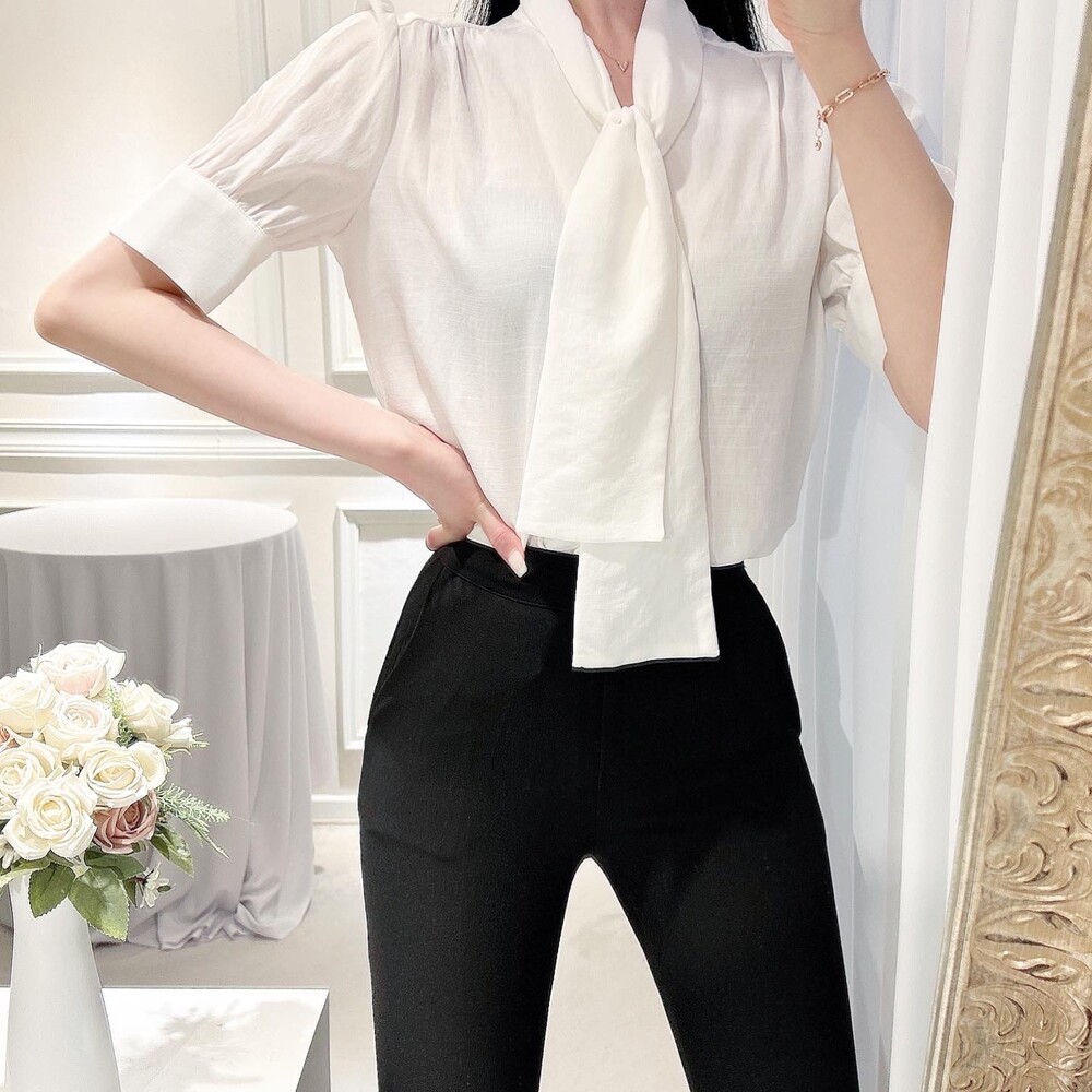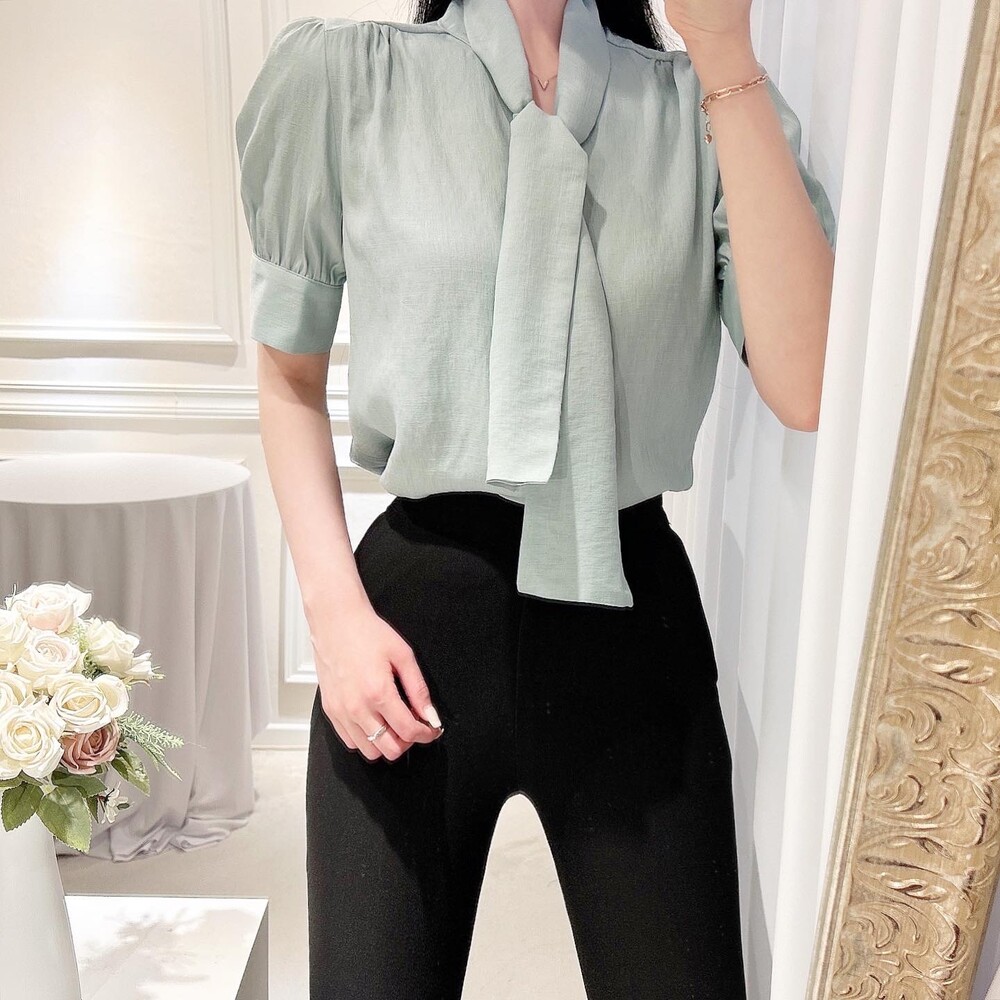 [SALE 원가이하 세일] 린넨 여름 반팔 스카프 타이 리본 퍼프 소매 블라우스 (하객룩 데이트룩 오피스룩)