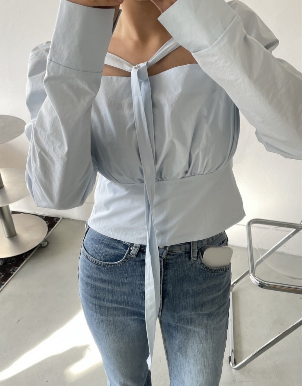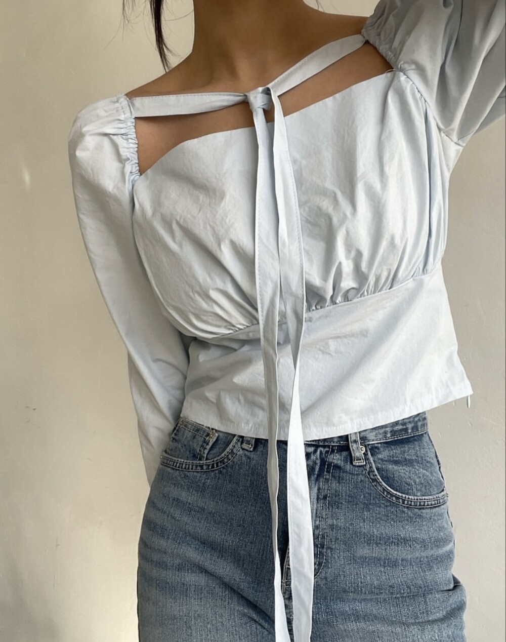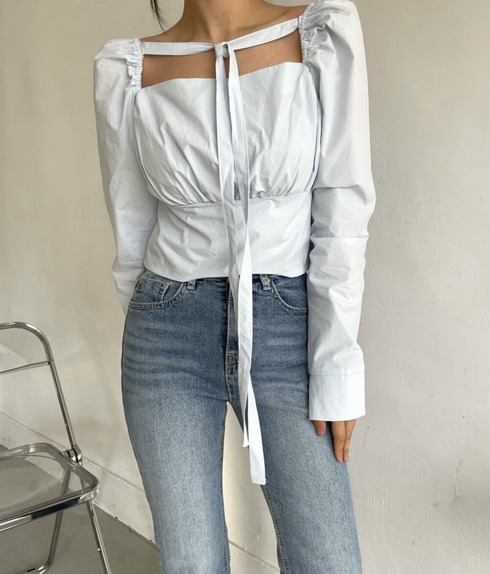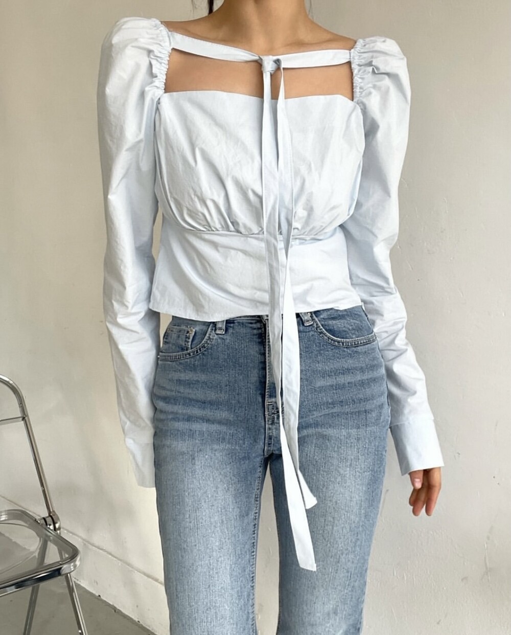 타이 끈 스퀘어넥 퍼프 소매 숏 블라우스