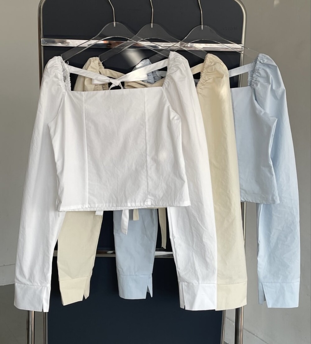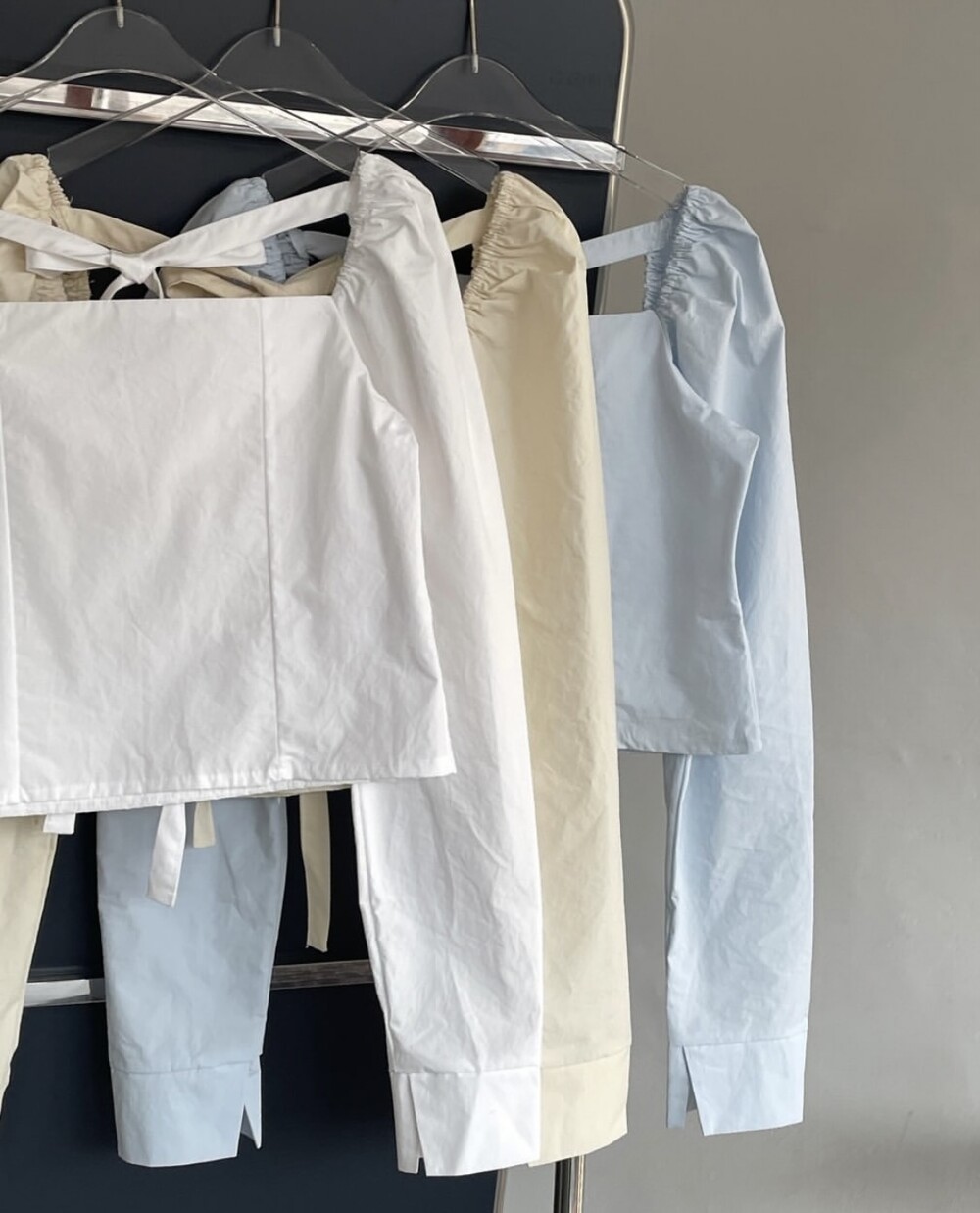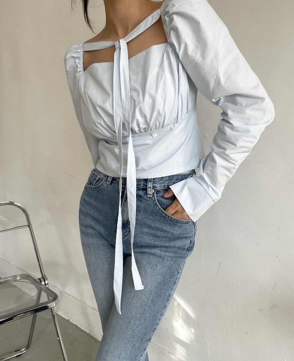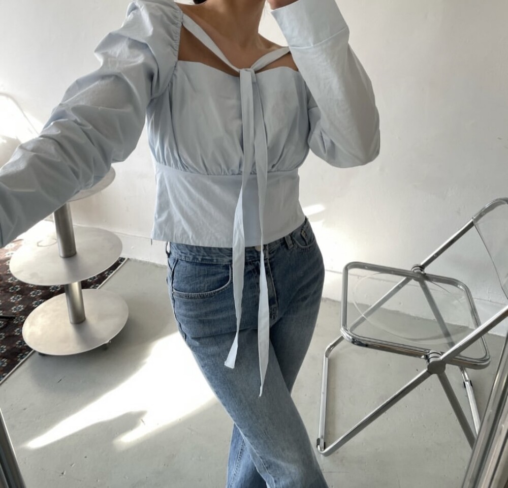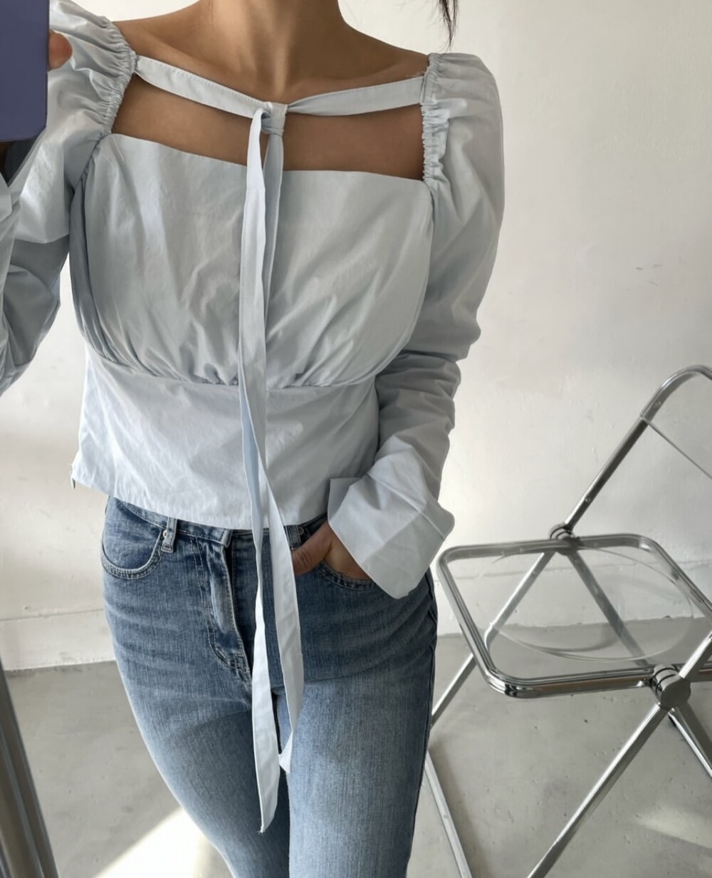 타이 끈 스퀘어넥 퍼프 소매 숏 블라우스