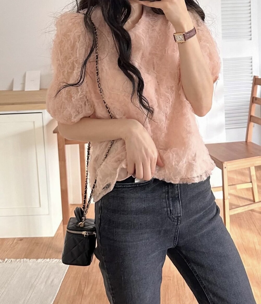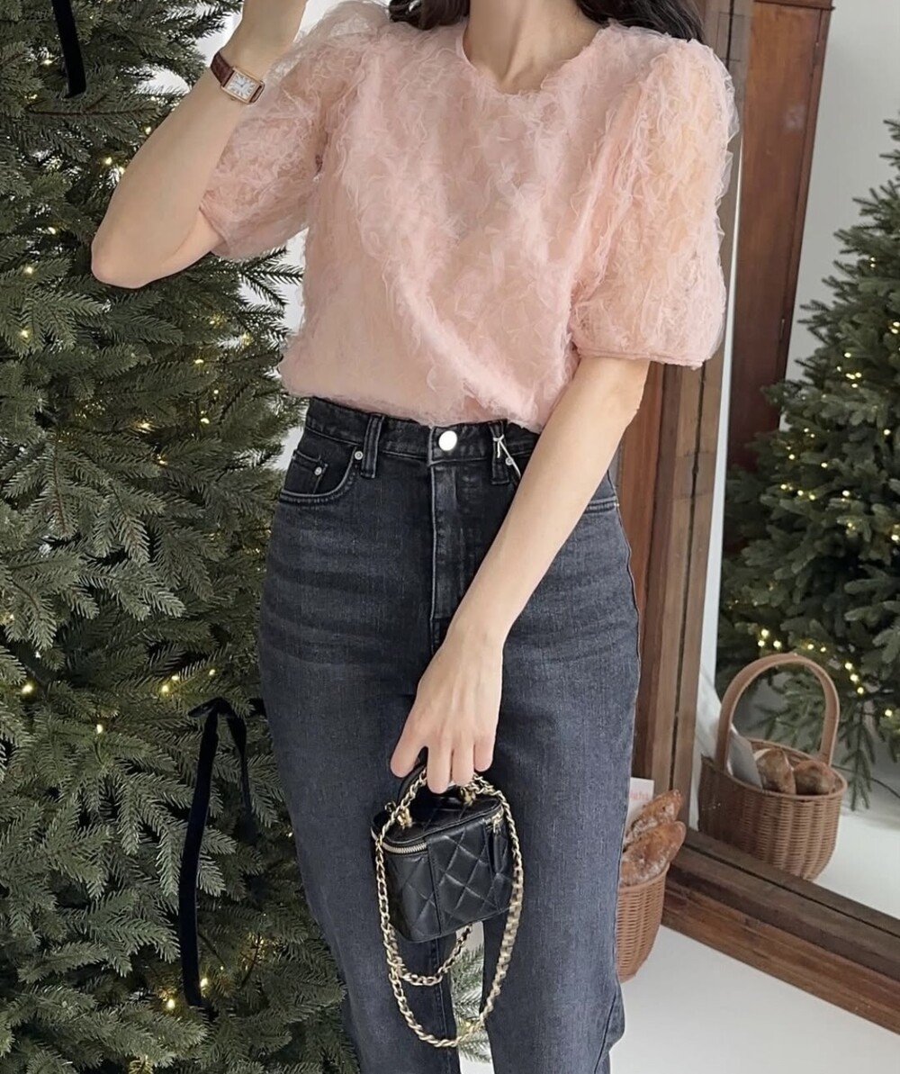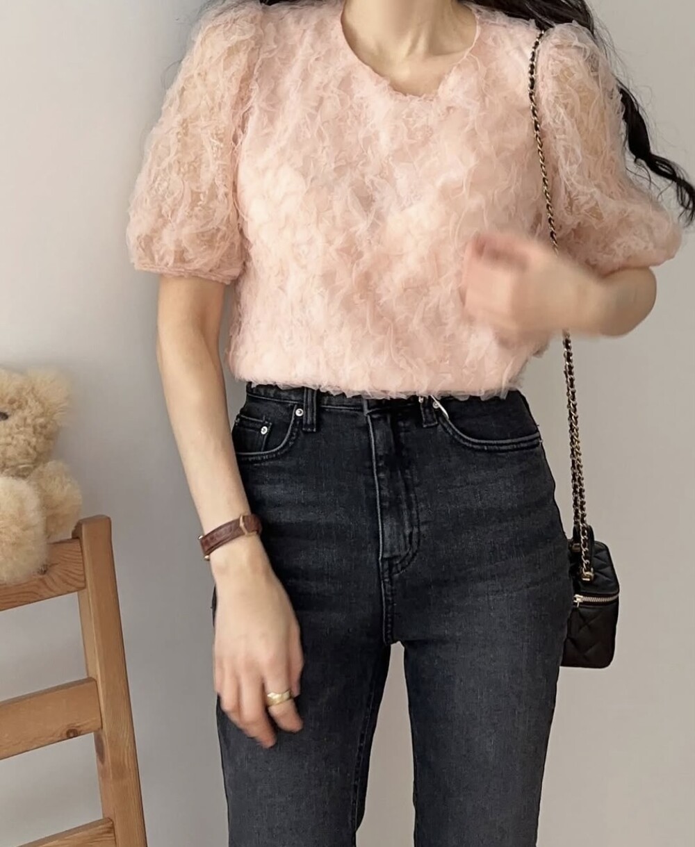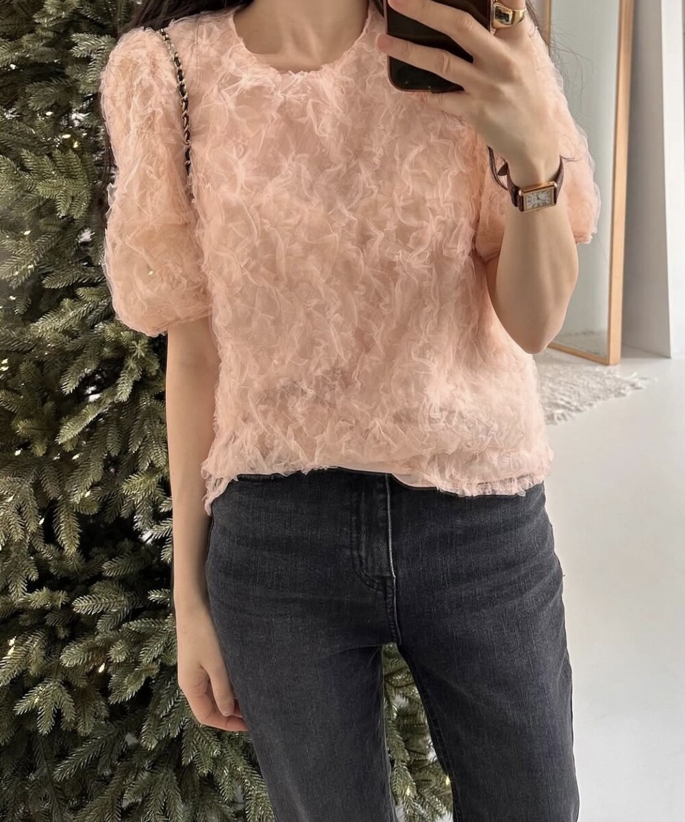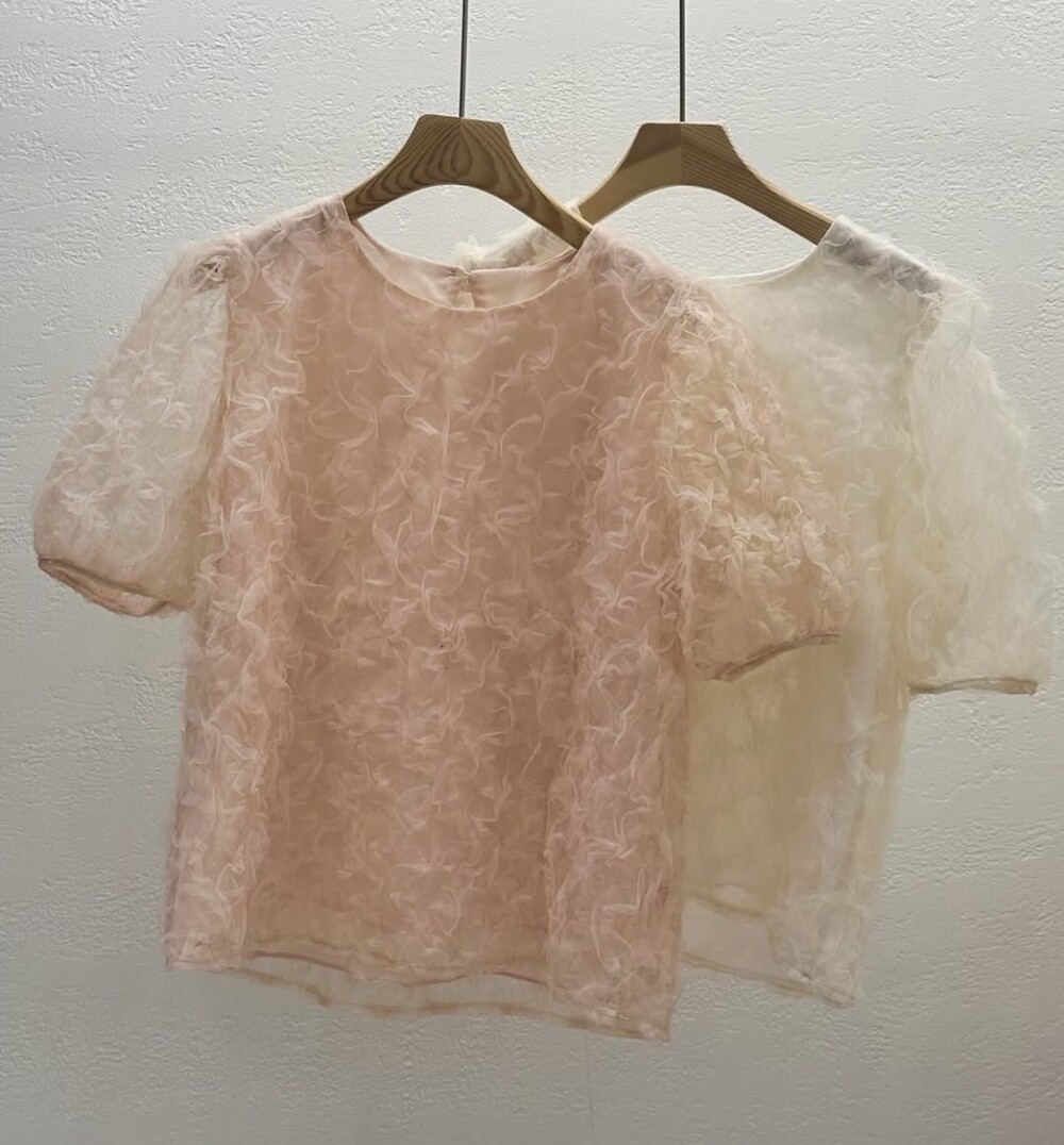플라워 꽃 망사 퍼프 반팔 소매 블라우스 (하객룩 데이트룩 데일리)