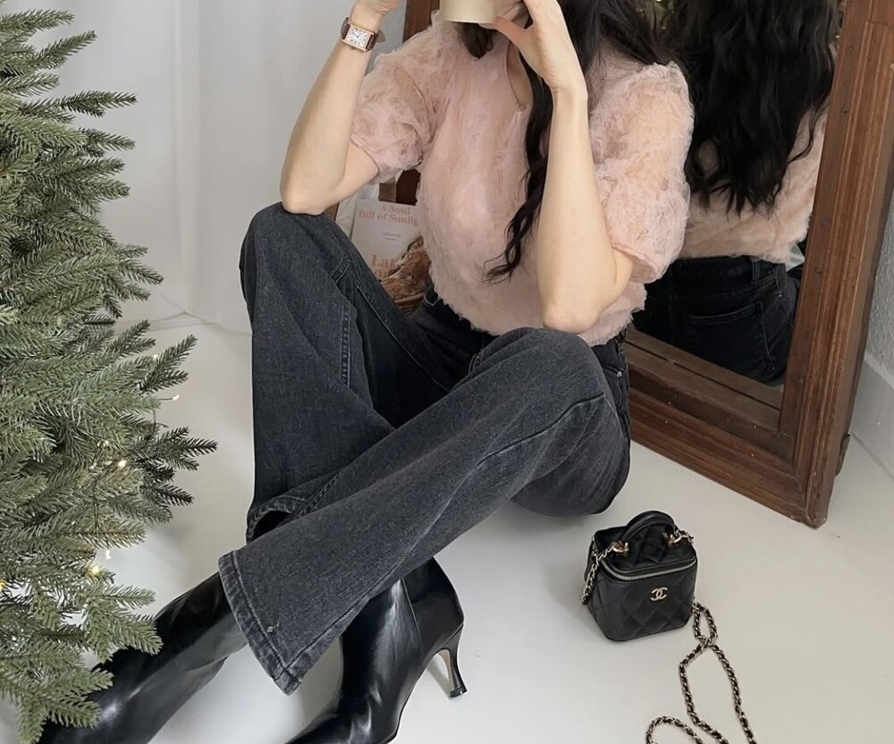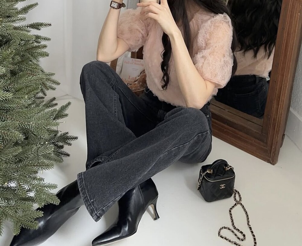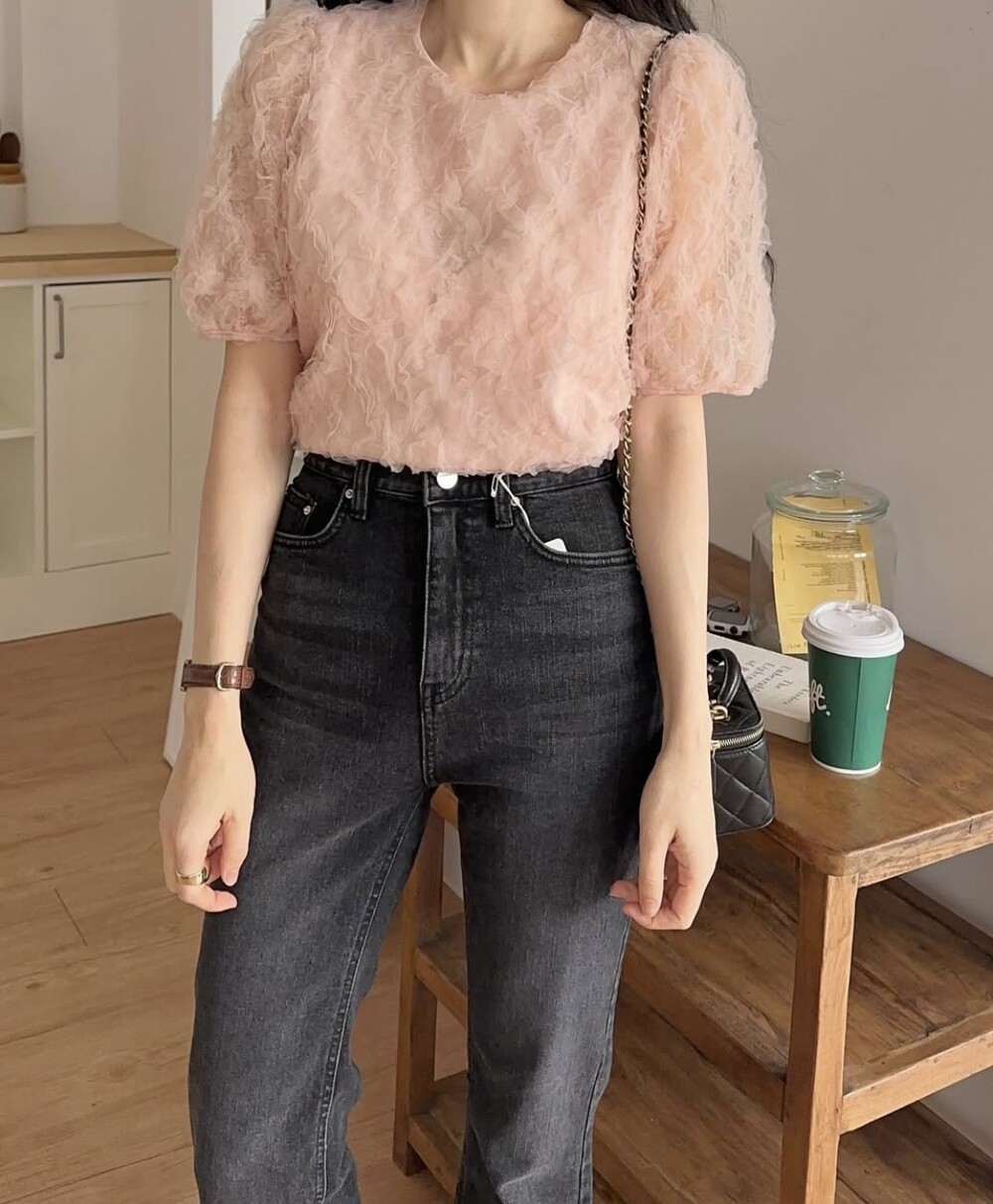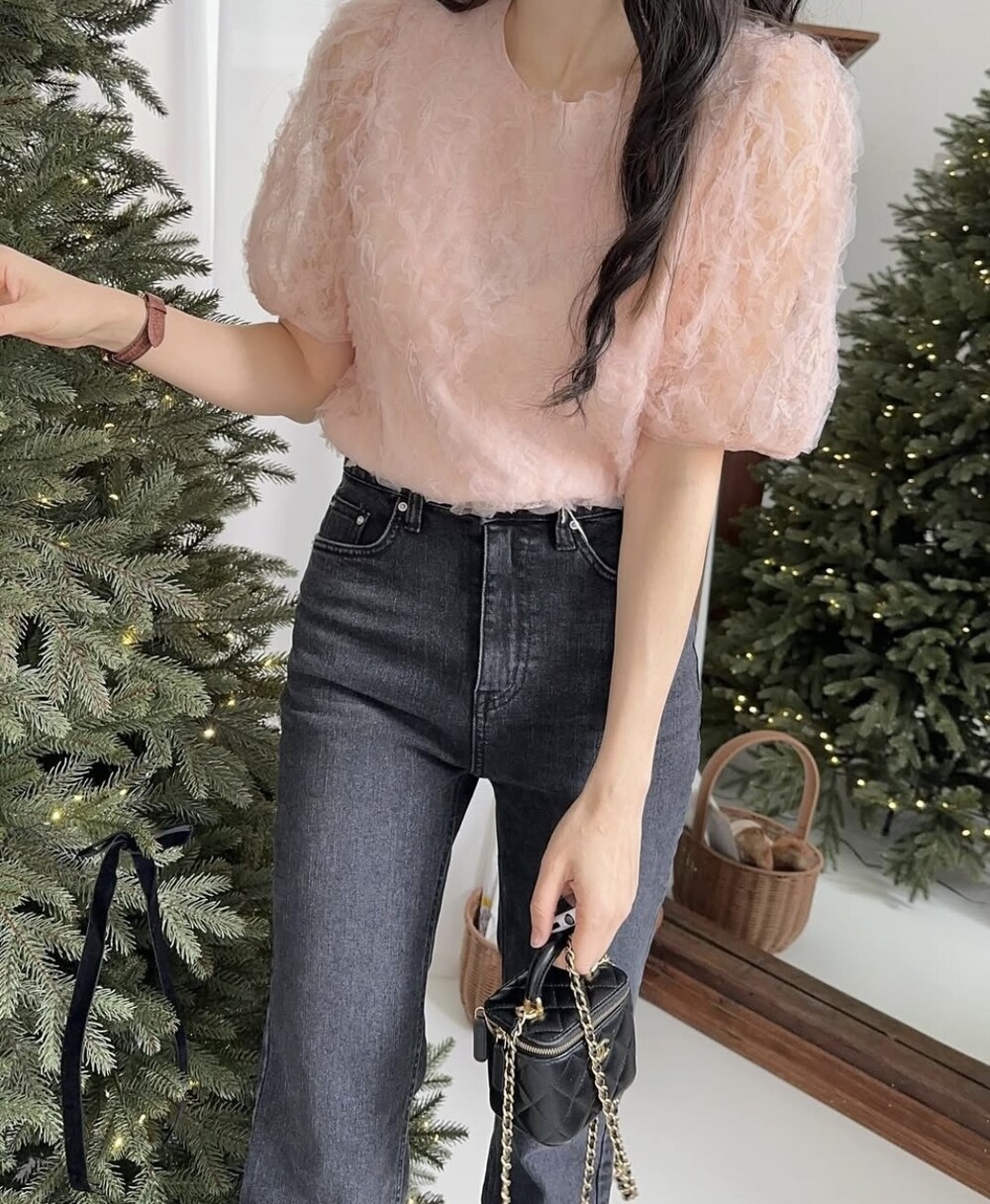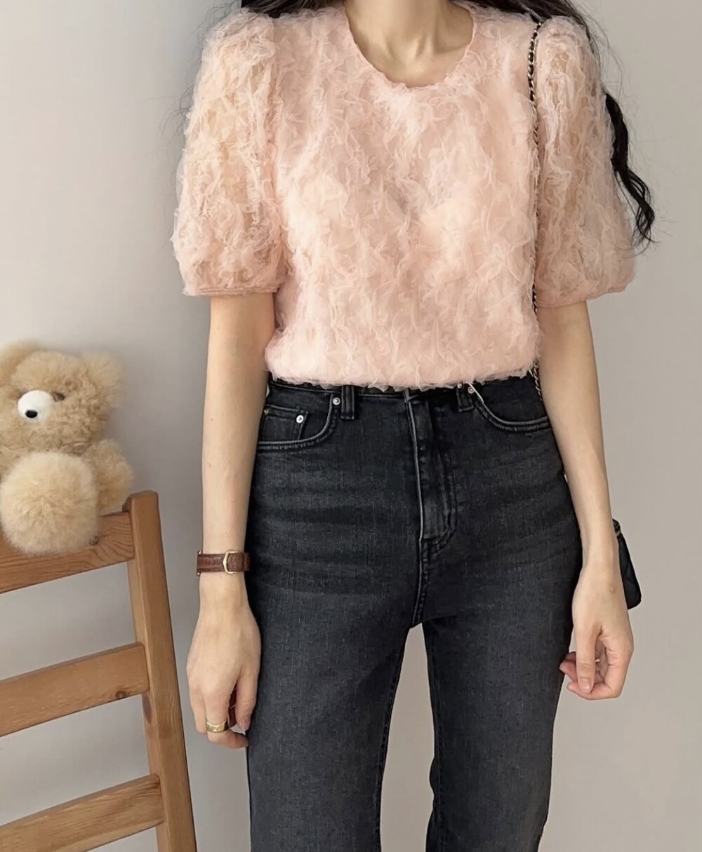 플라워 꽃 망사 퍼프 반팔 소매 블라우스 (하객룩 데이트룩 데일리)