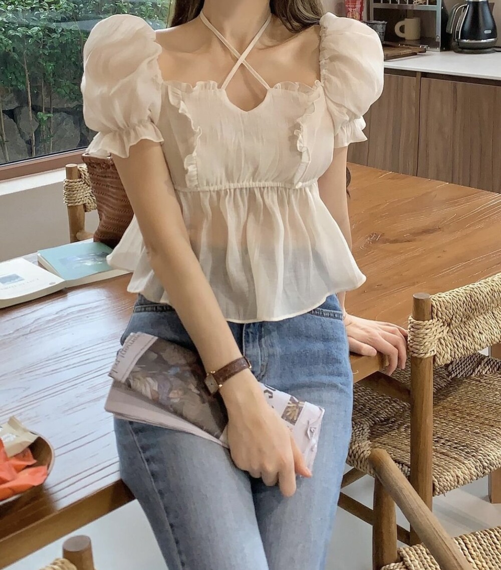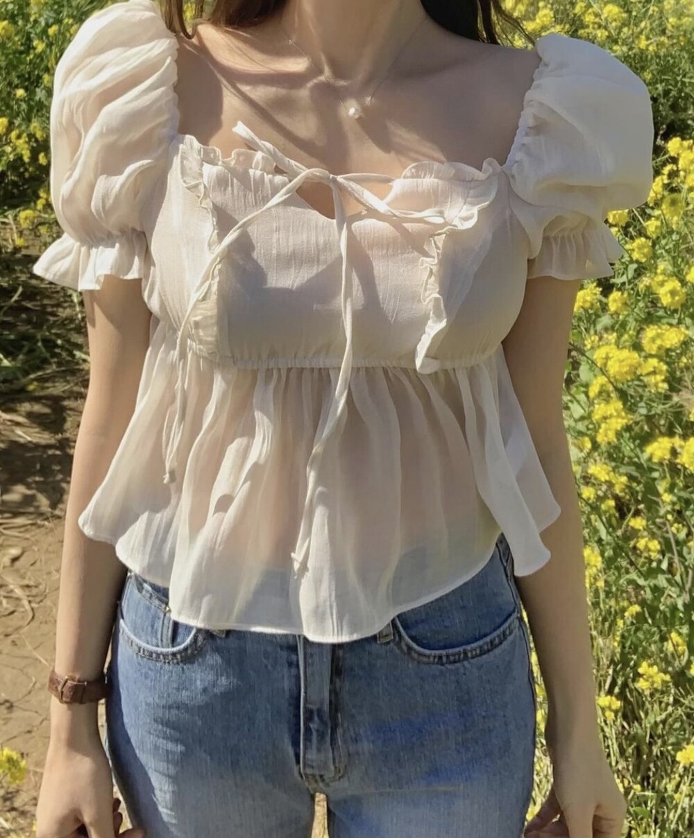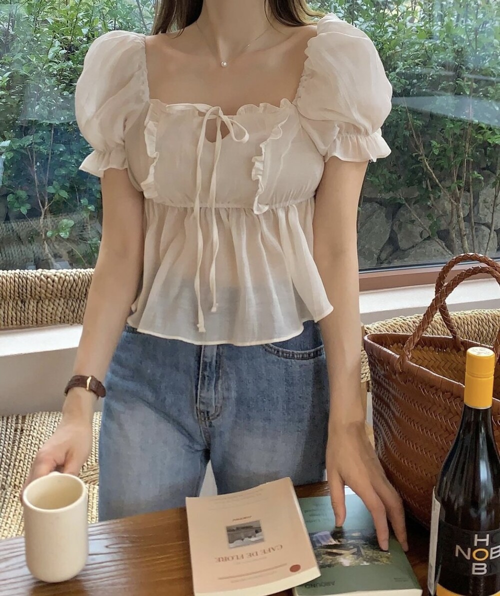 셔링 주름 프릴 리본 밴딩 숏 반팔 여신 블라우스