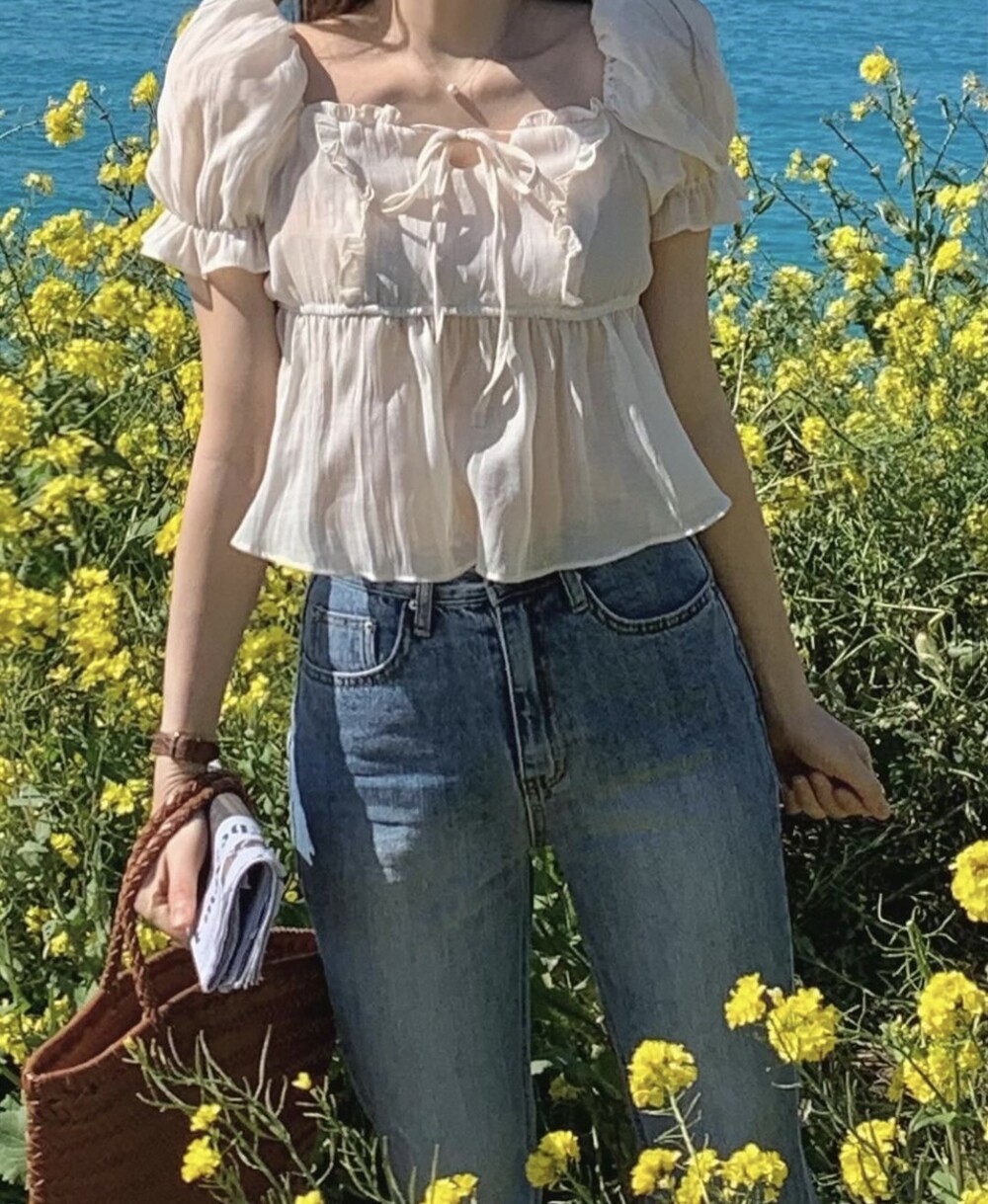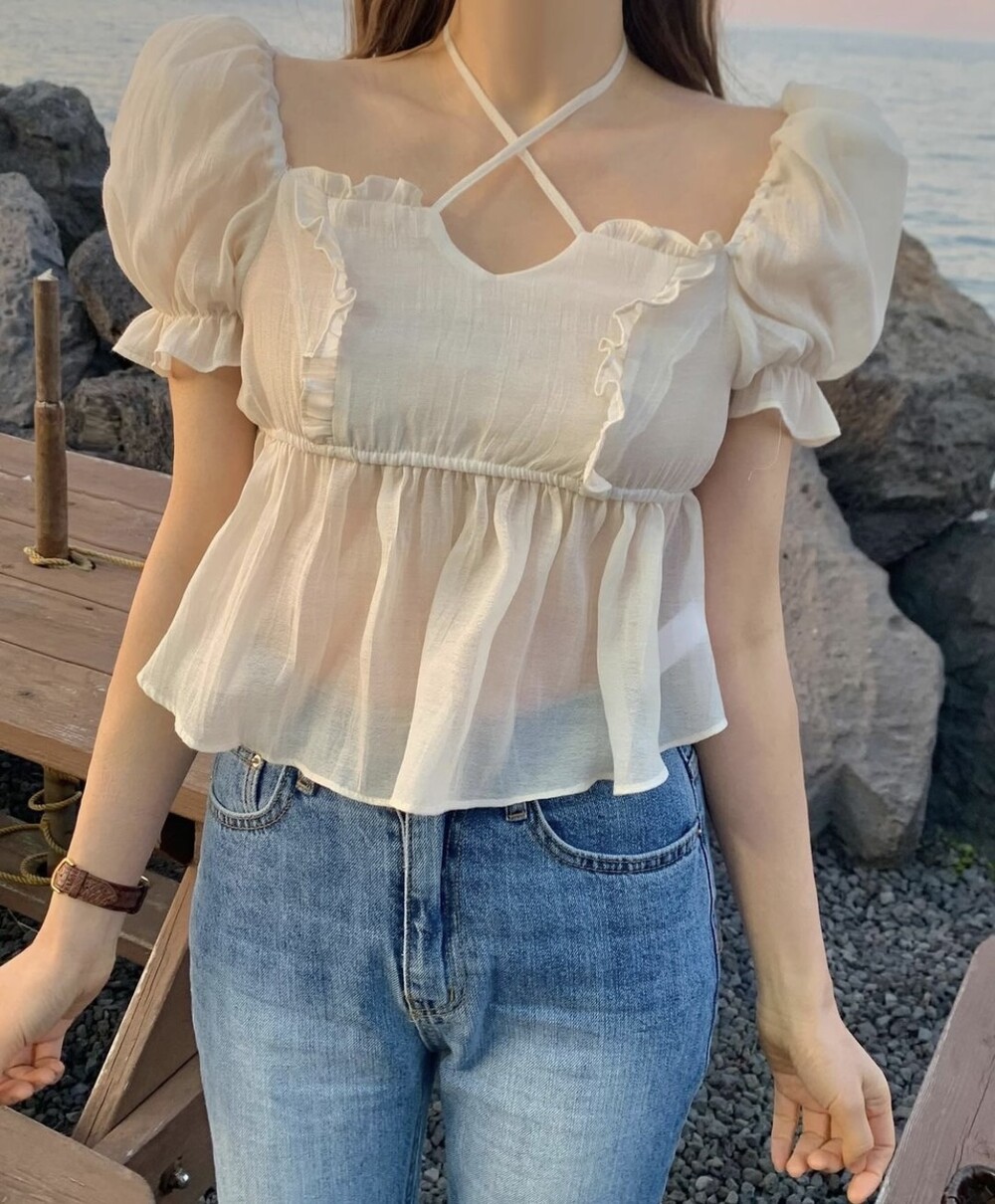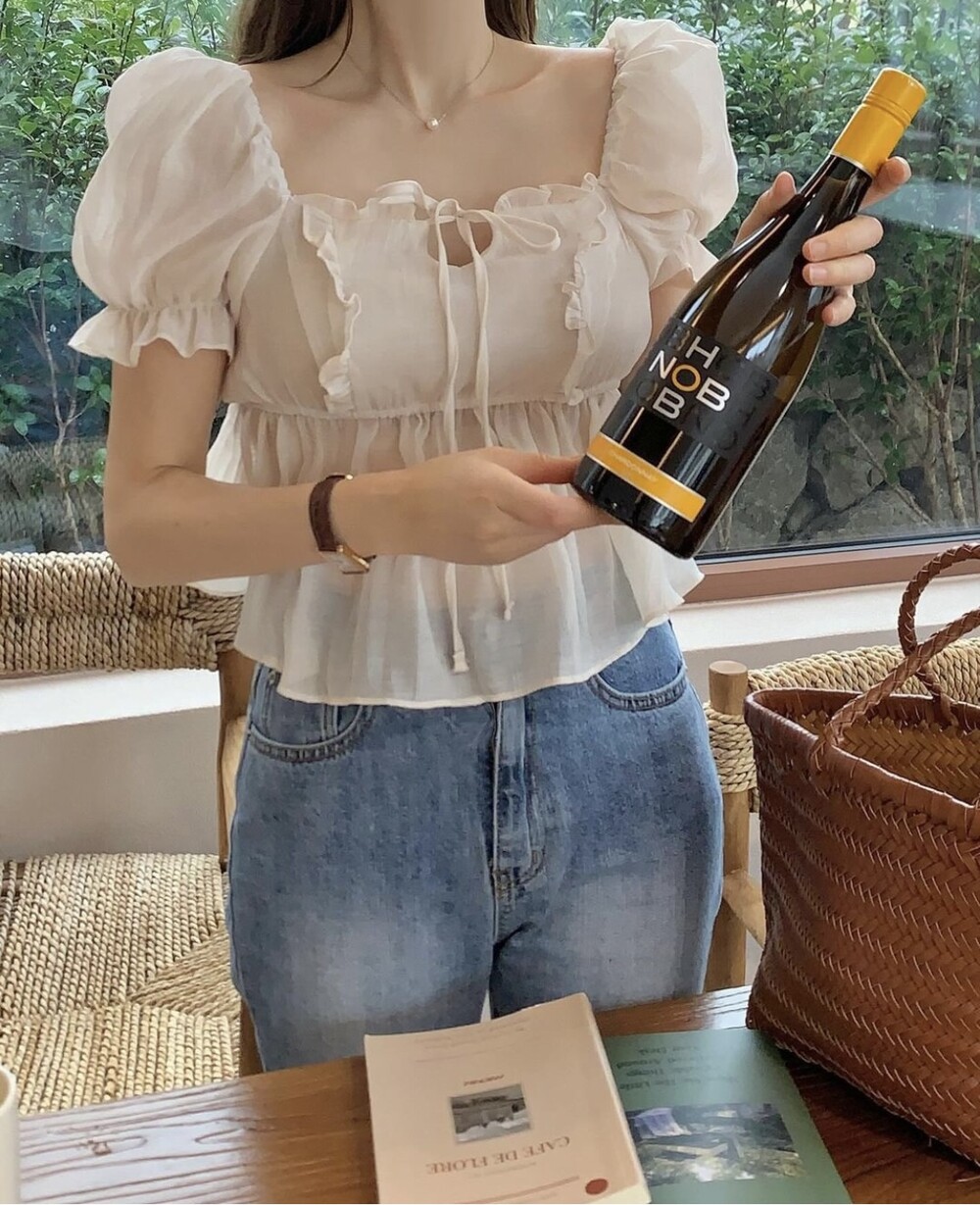 셔링 주름 프릴 리본 밴딩 숏 반팔 여신 블라우스