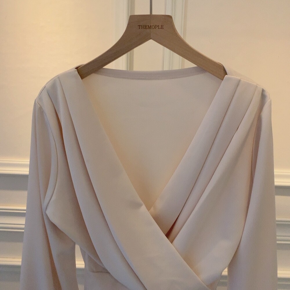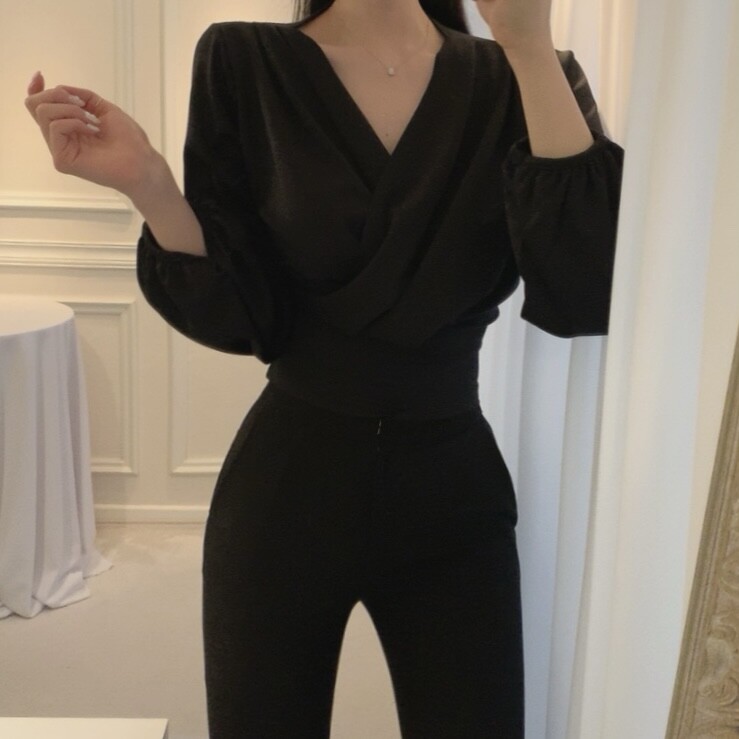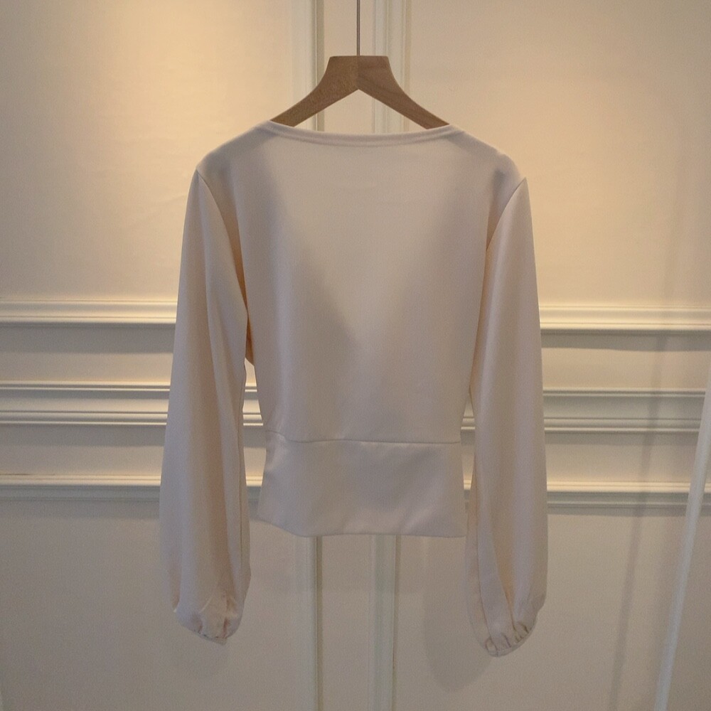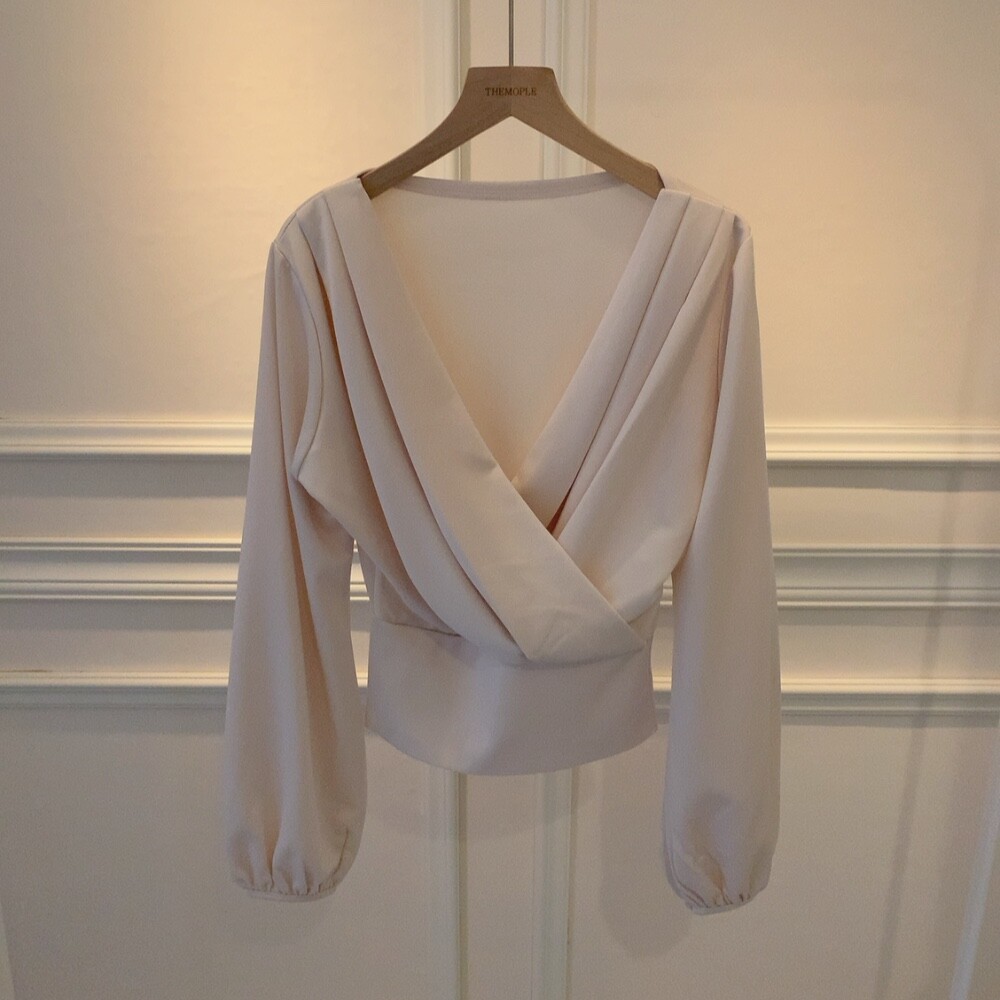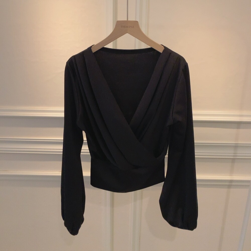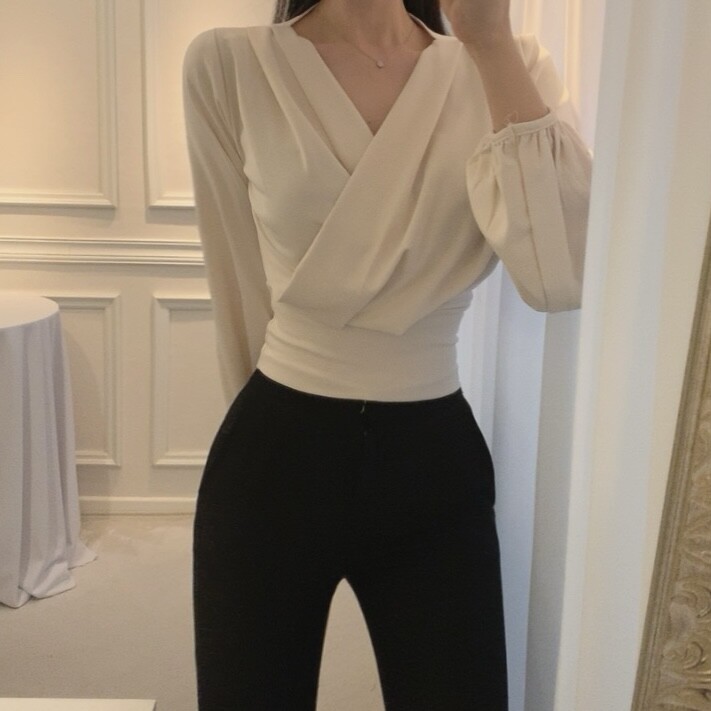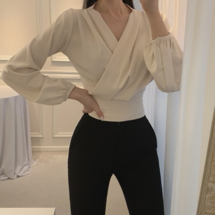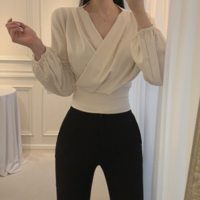 크롭 랩 셔링 드레이프 벌룬 소매 긴팔 블라우스 티셔츠