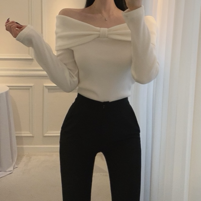자연스럽게 쇄골 라인이 드러나는 오프숄더 스타일에