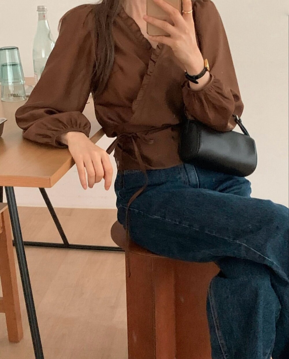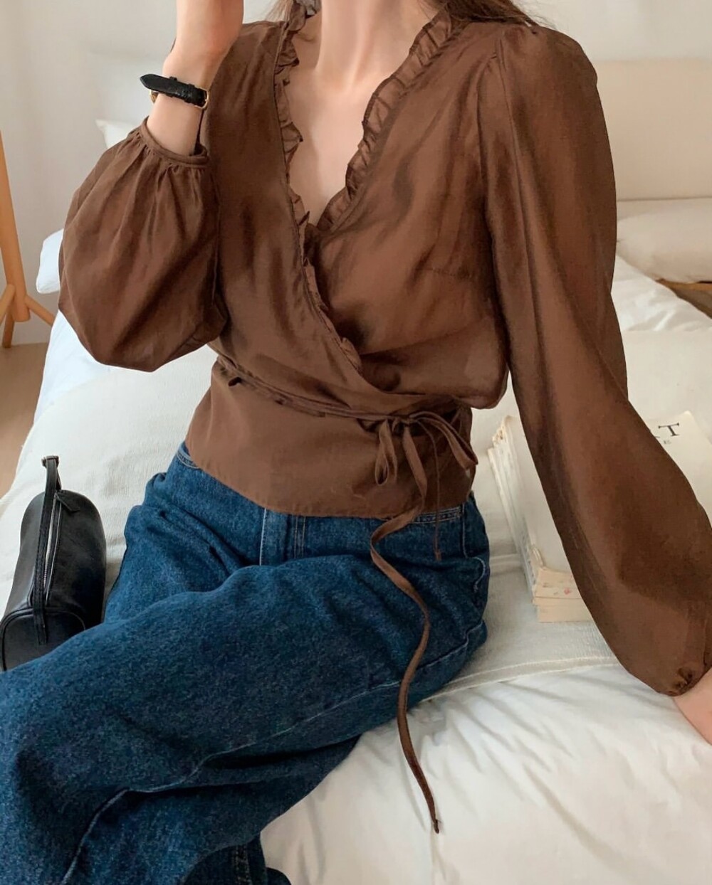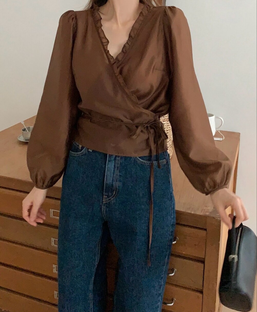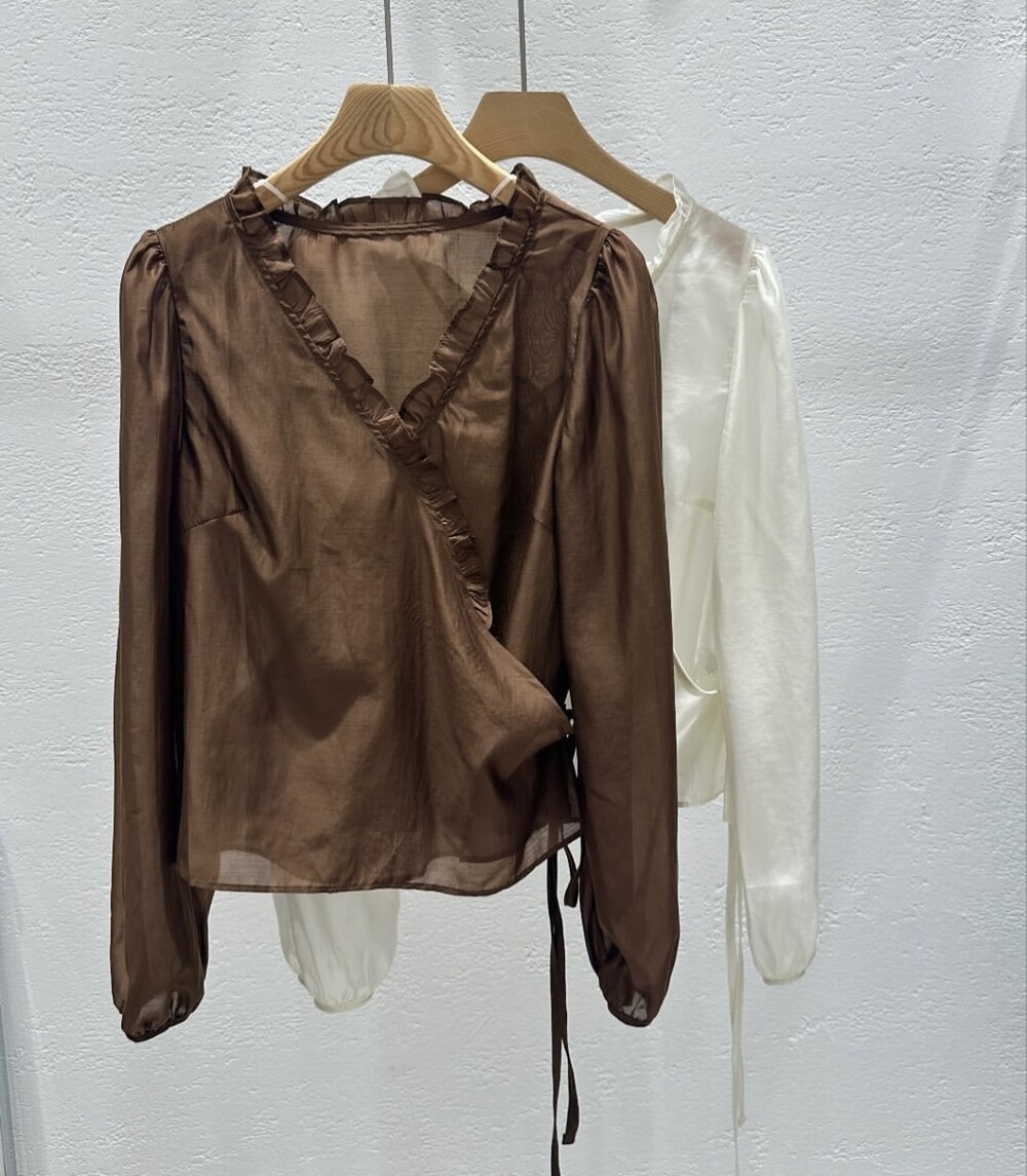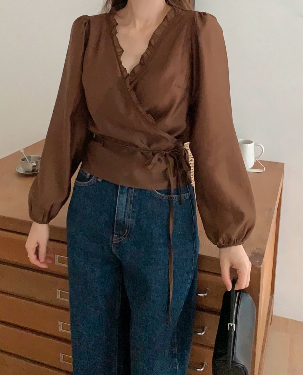 새틴 광택 랩 프릴 레이스 끈 리본 블라우스