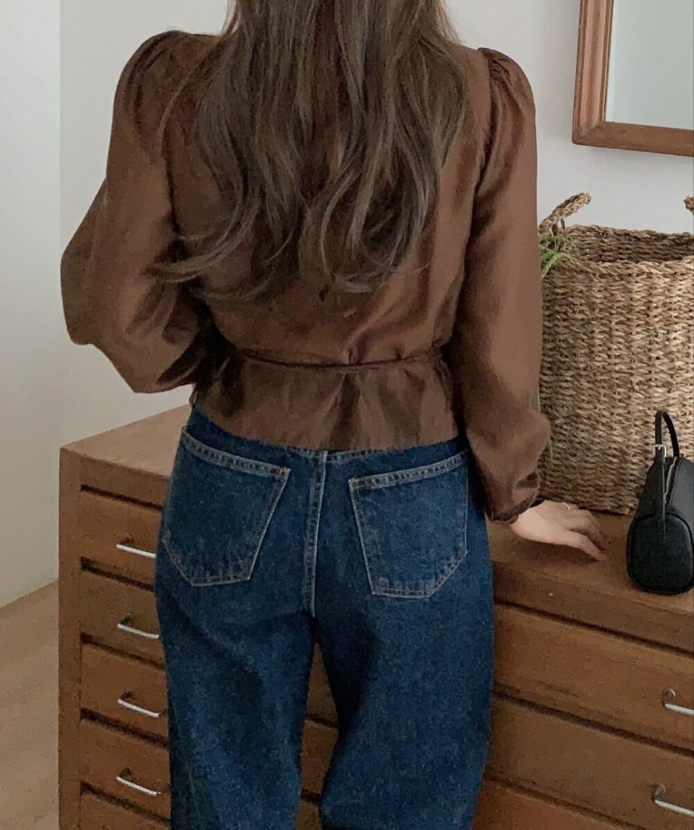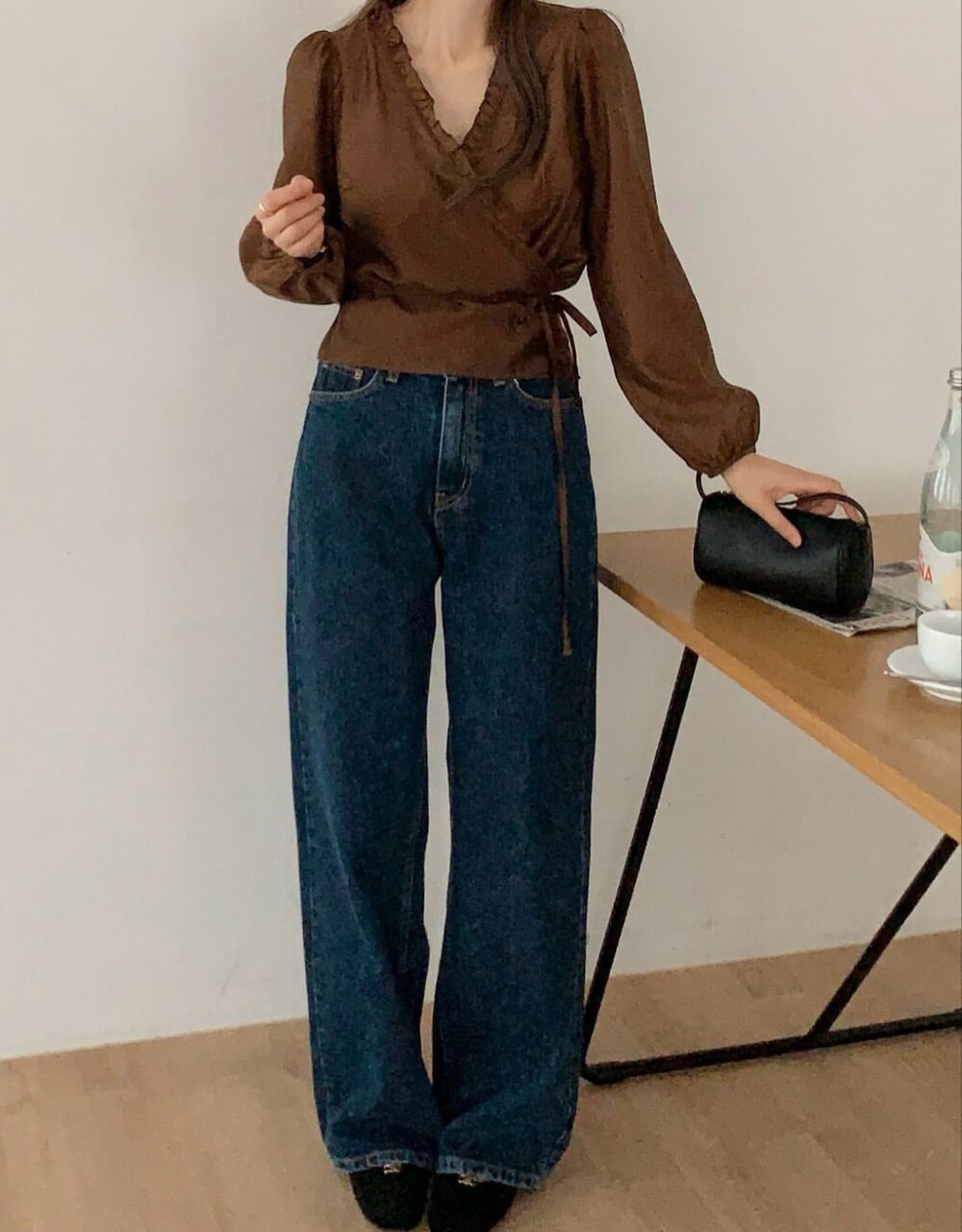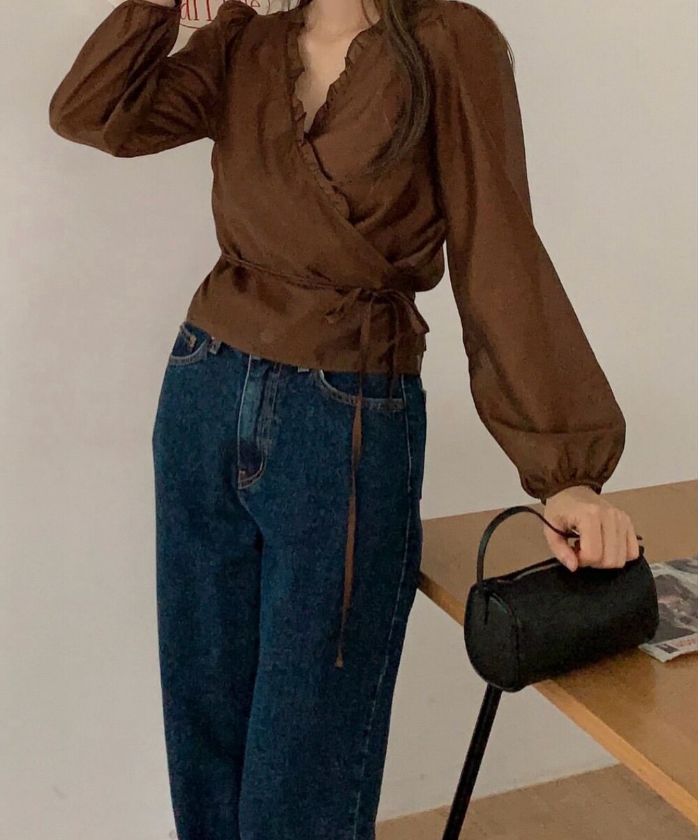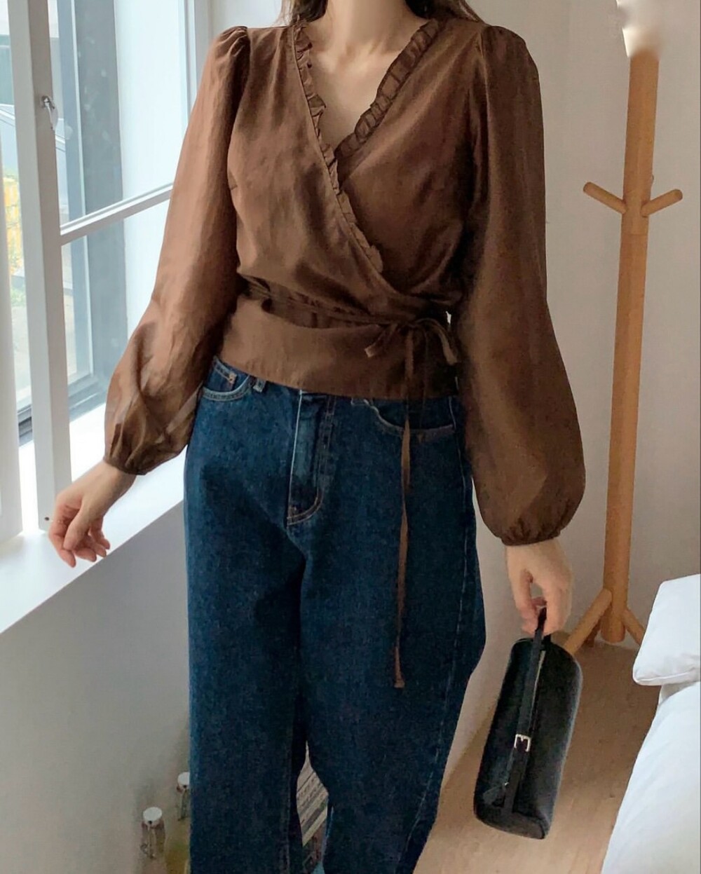 새틴 광택 랩 프릴 레이스 끈 리본 블라우스