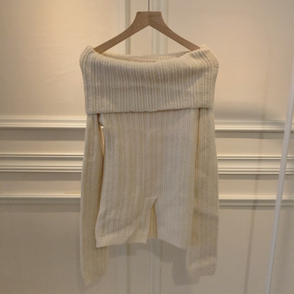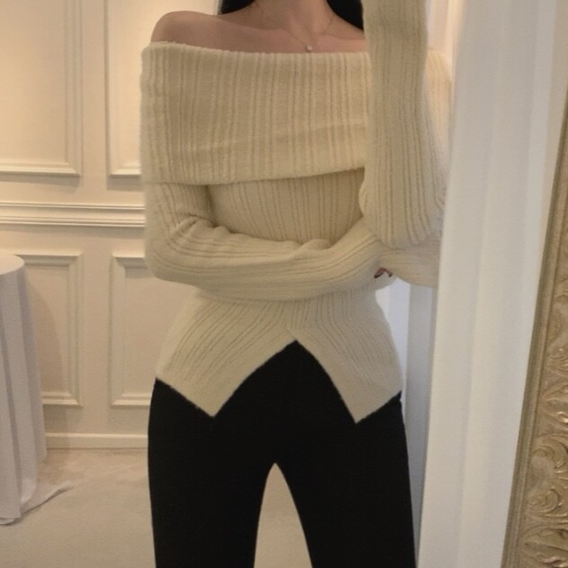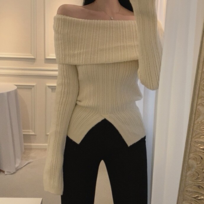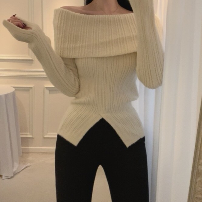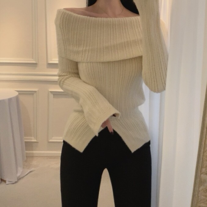 세로 골지 오프숄더 트임 슬릿 겨울 니트 (데이트룩 파티룩 연말룩)