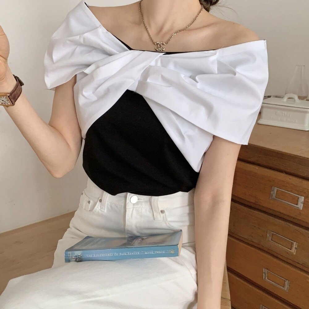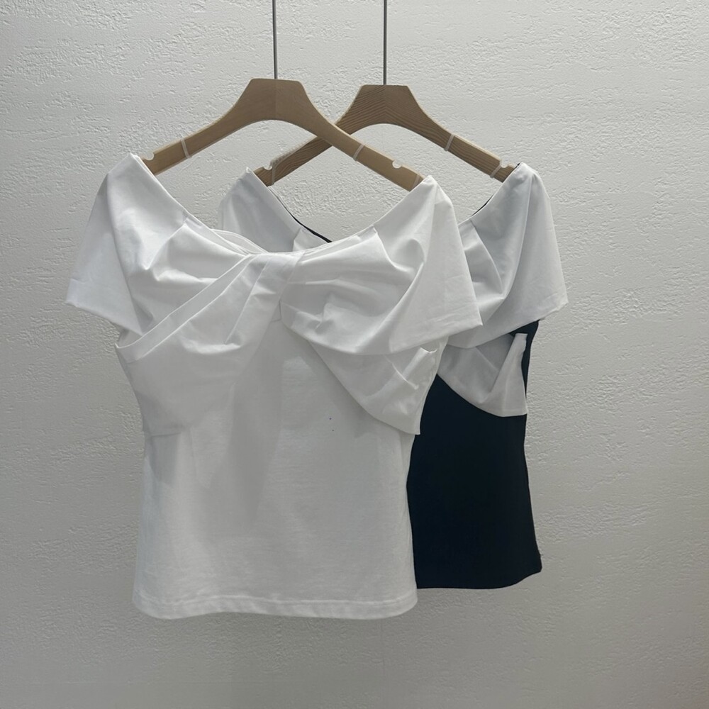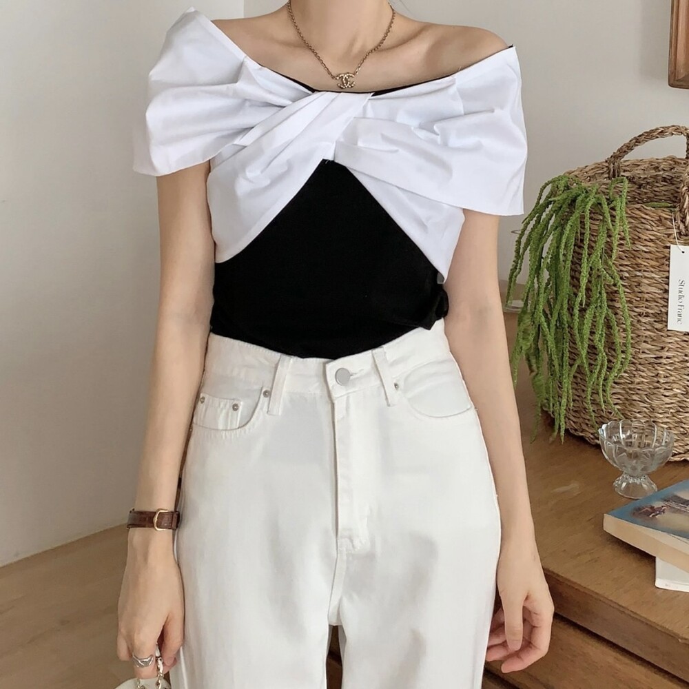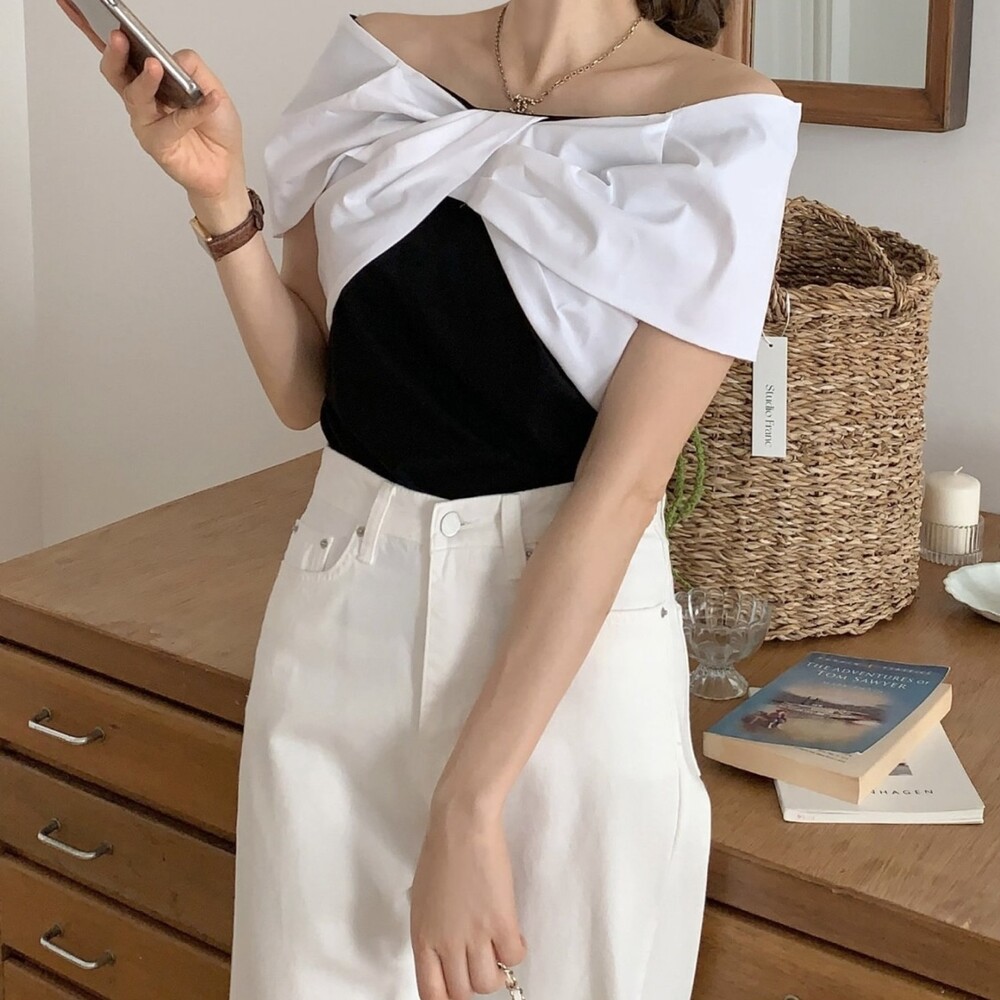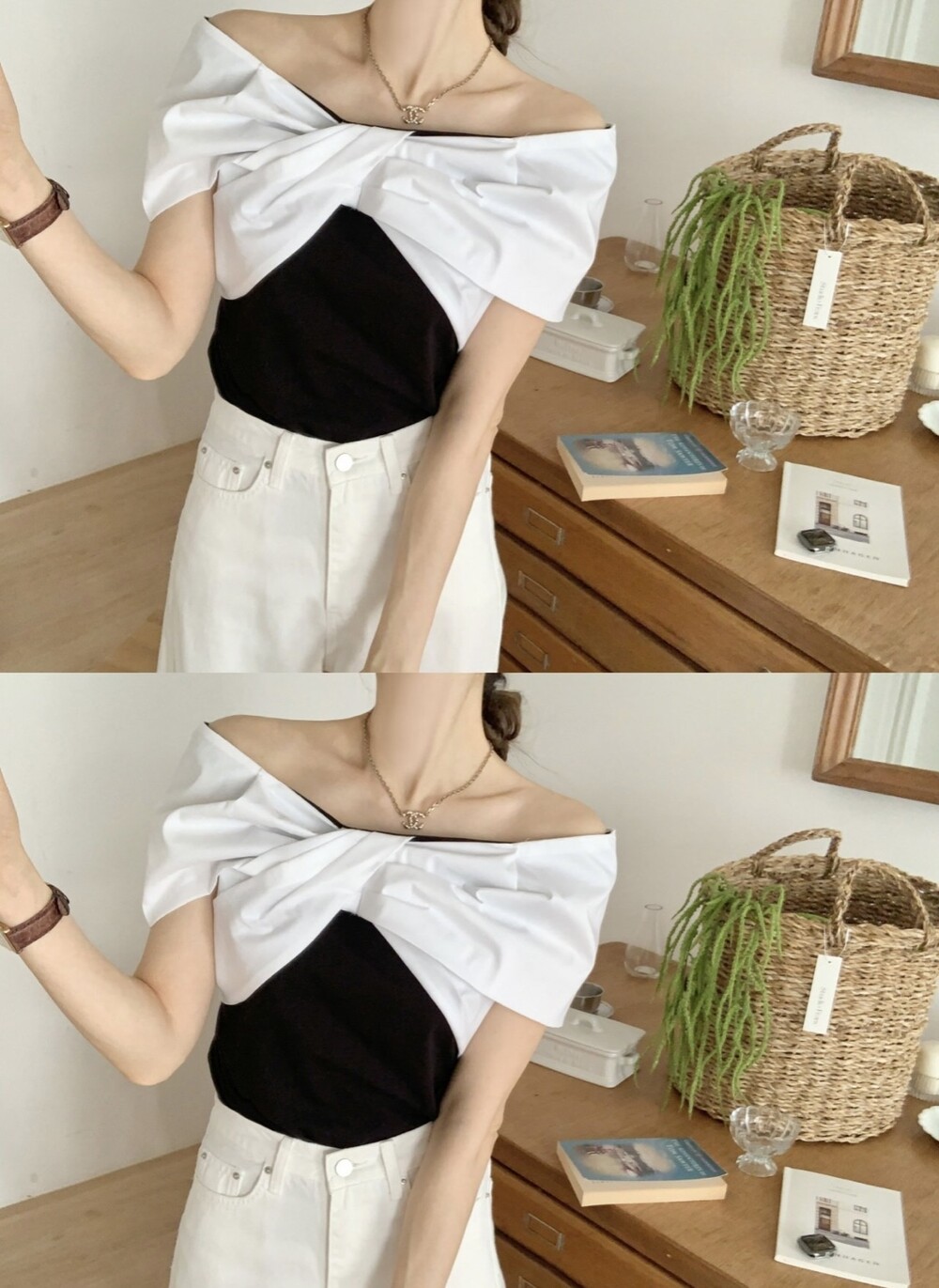 빅 리본 배색 오프숄더 반팔 블라우스 (데이트룩 여행룩)