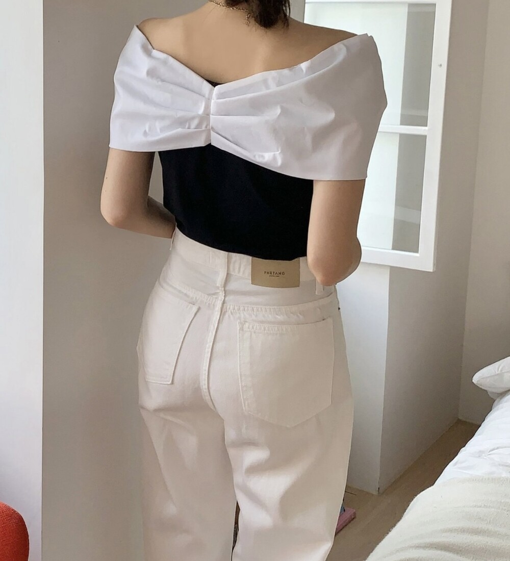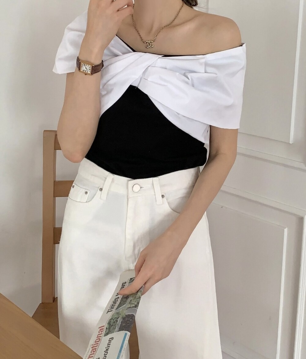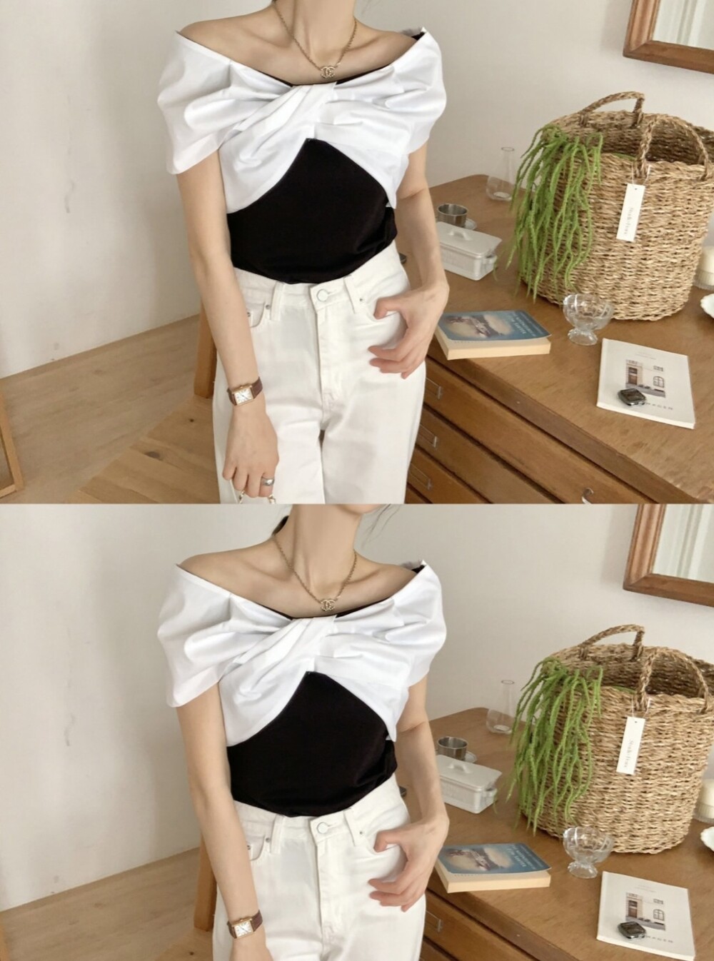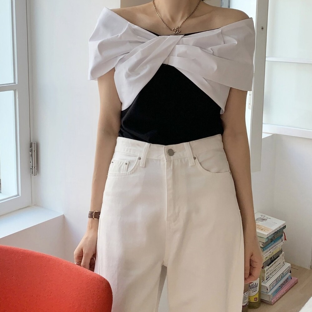 빅 리본 배색 오프숄더 반팔 블라우스 (데이트룩 여행룩)