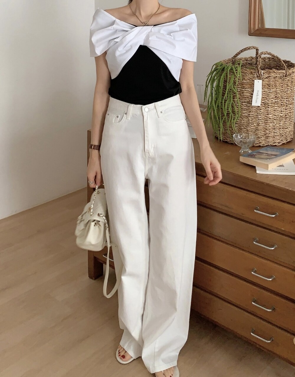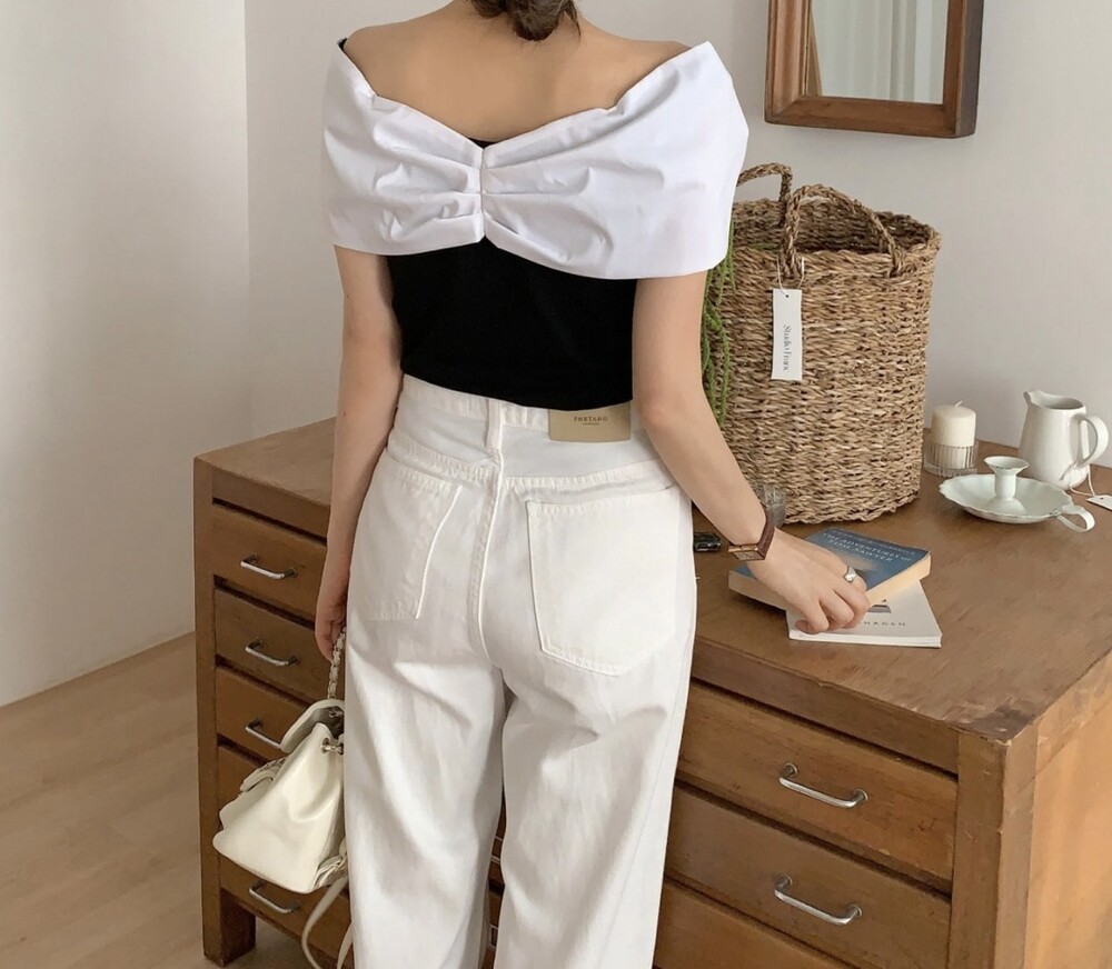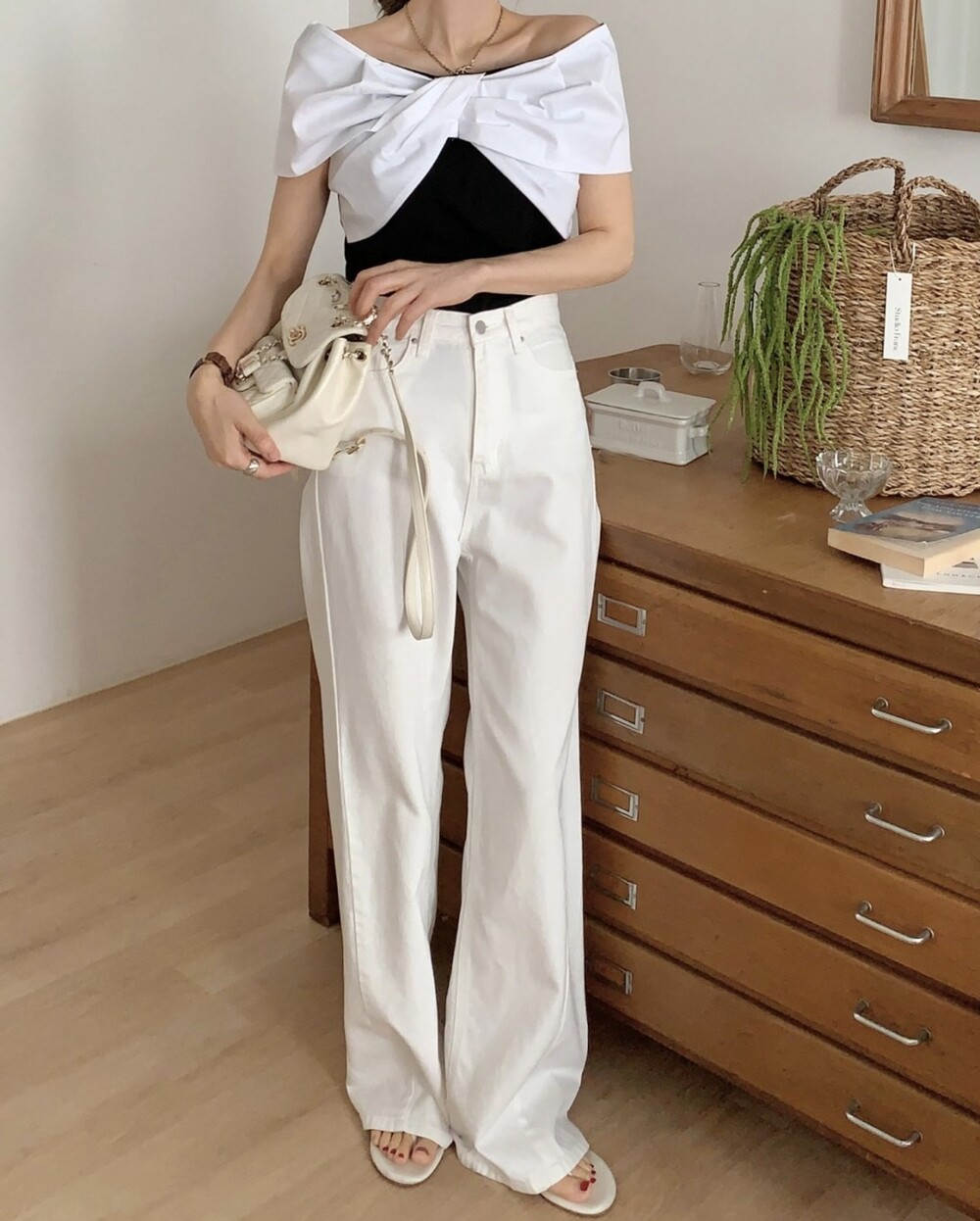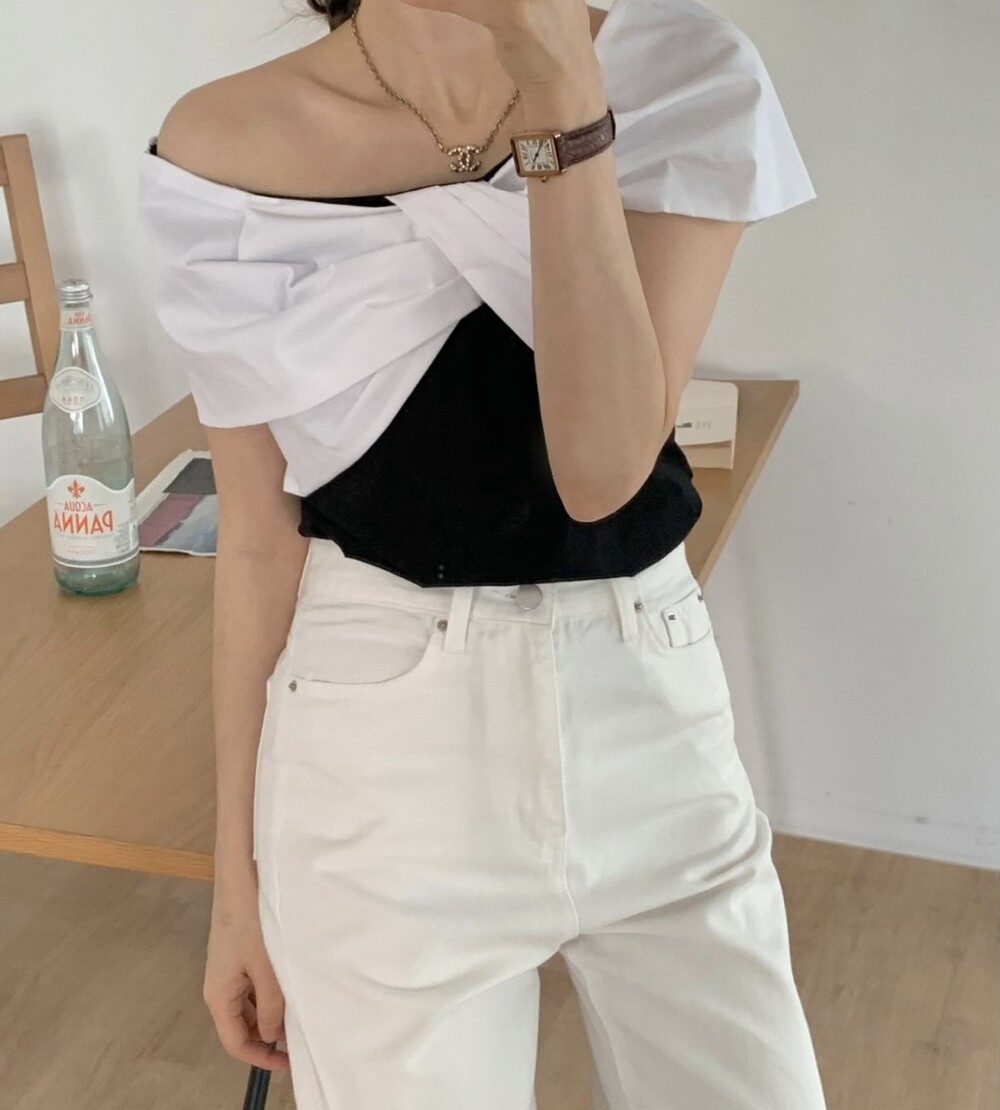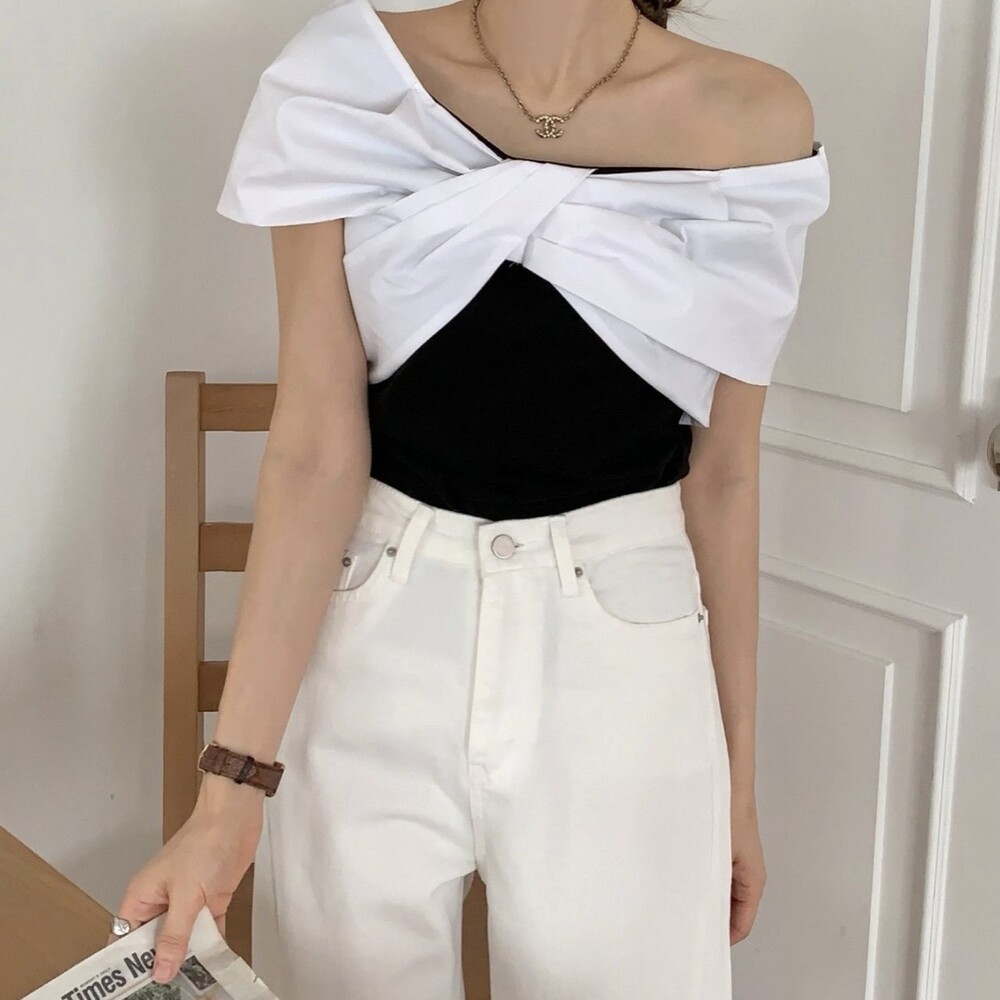 빅 리본 배색 오프숄더 반팔 블라우스 (데이트룩 여행룩)