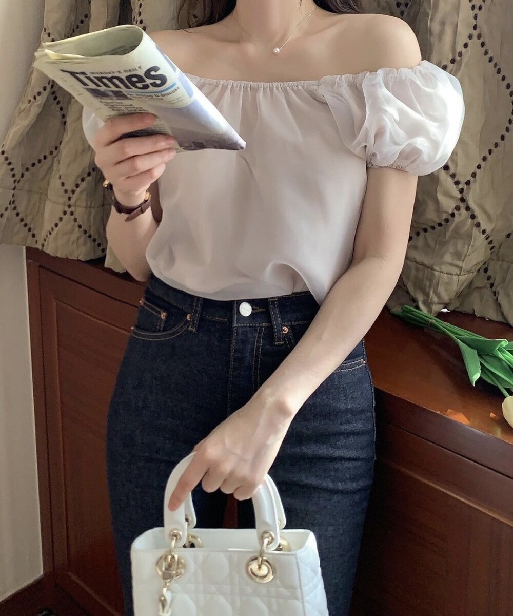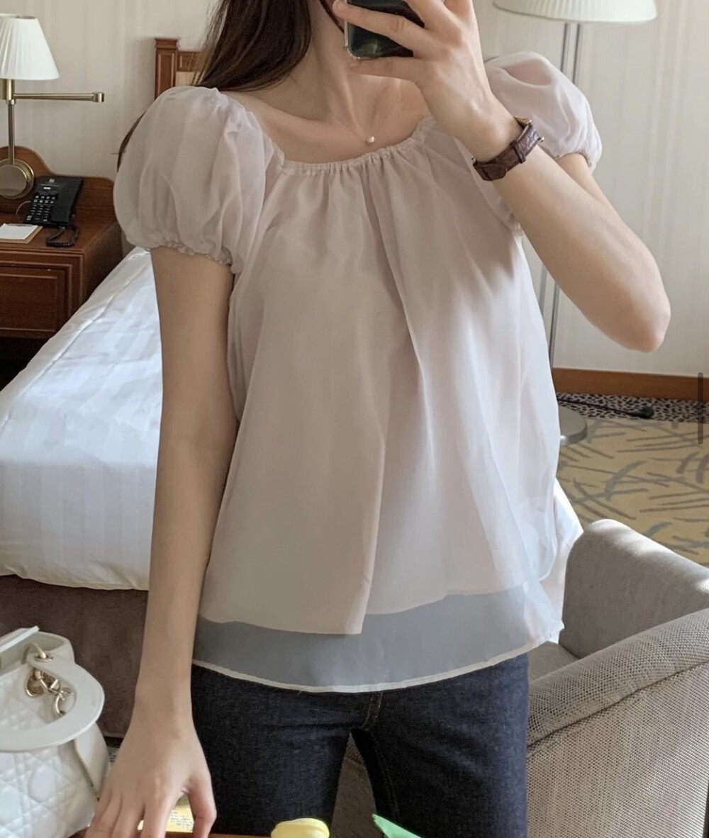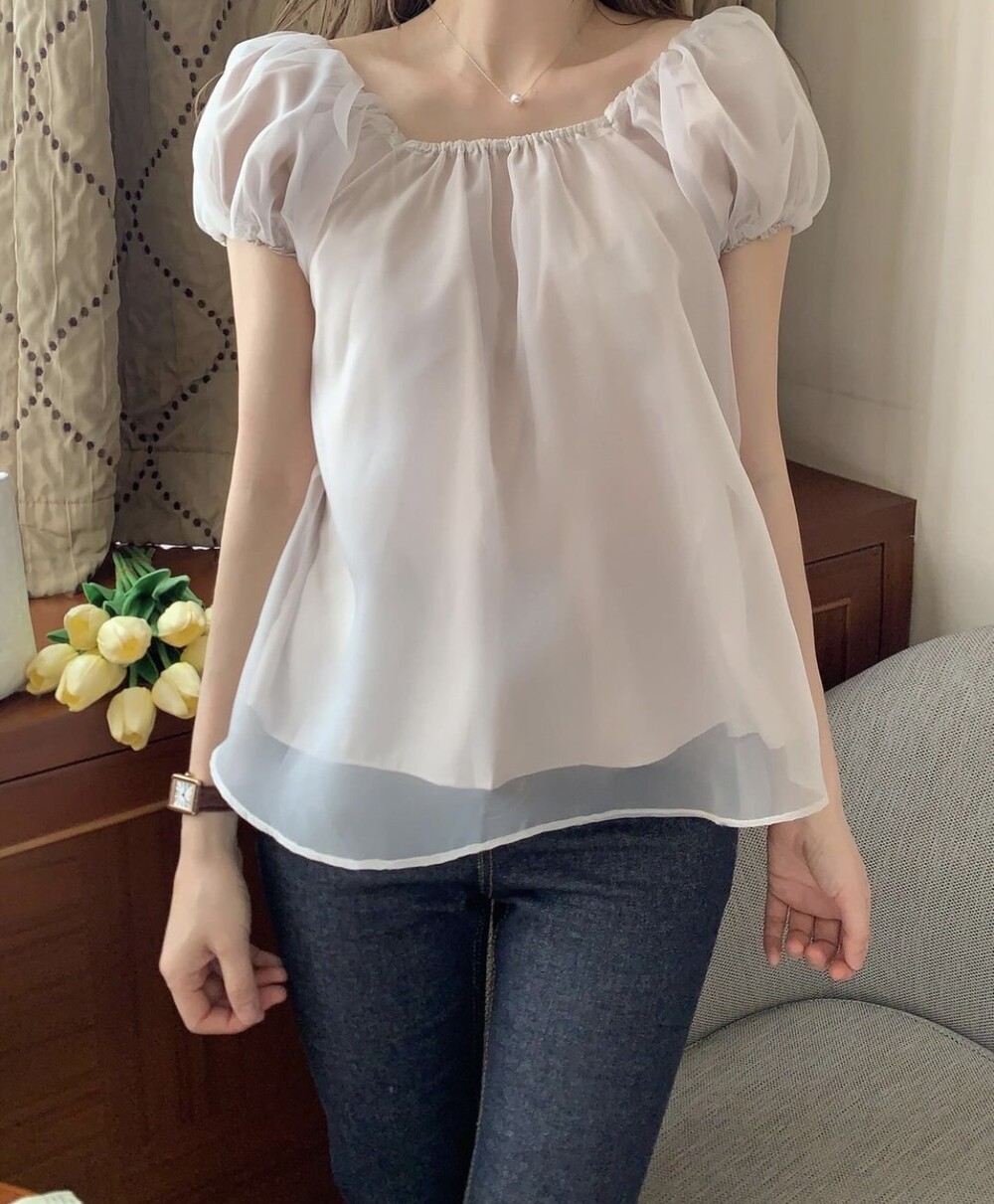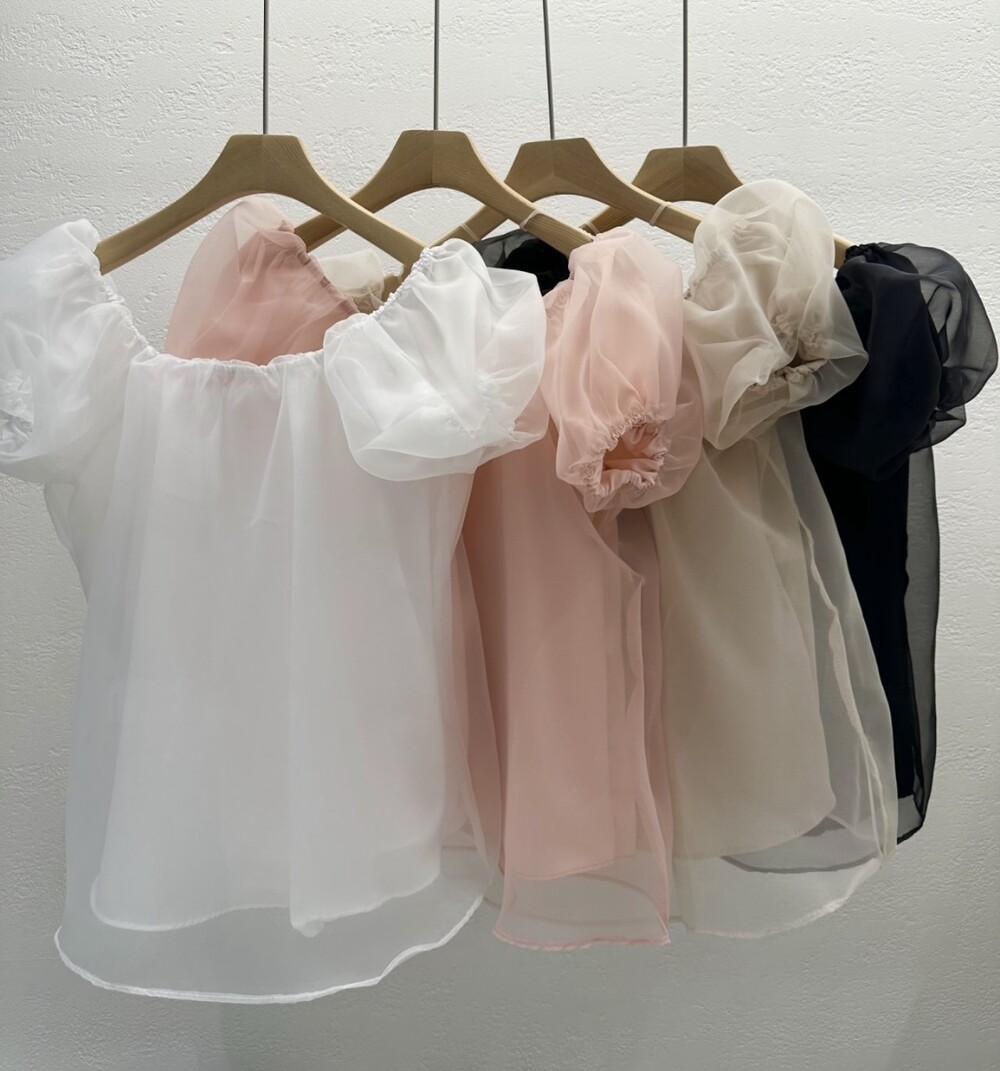 오간자 스퀘어넥 오프숄더 밴딩 퍼프 반팔 소매 셔링 블라우스
