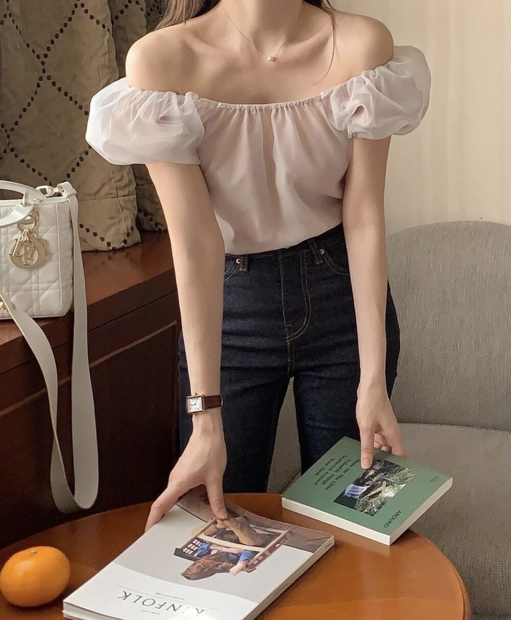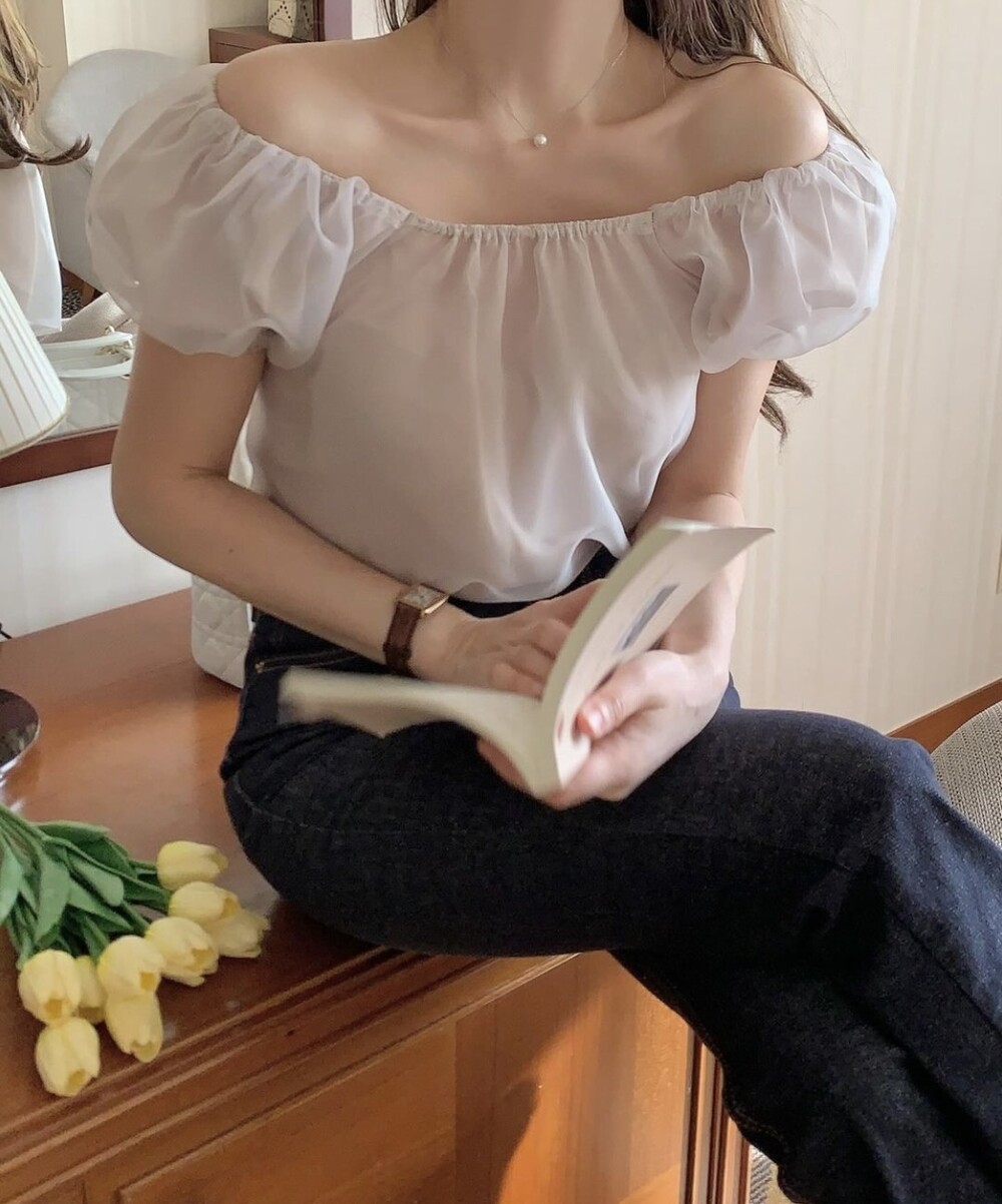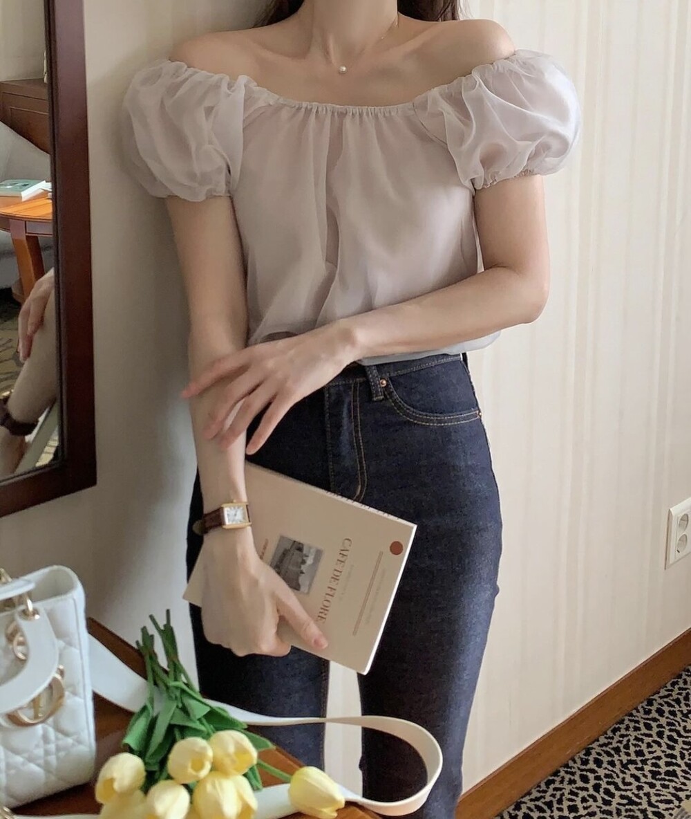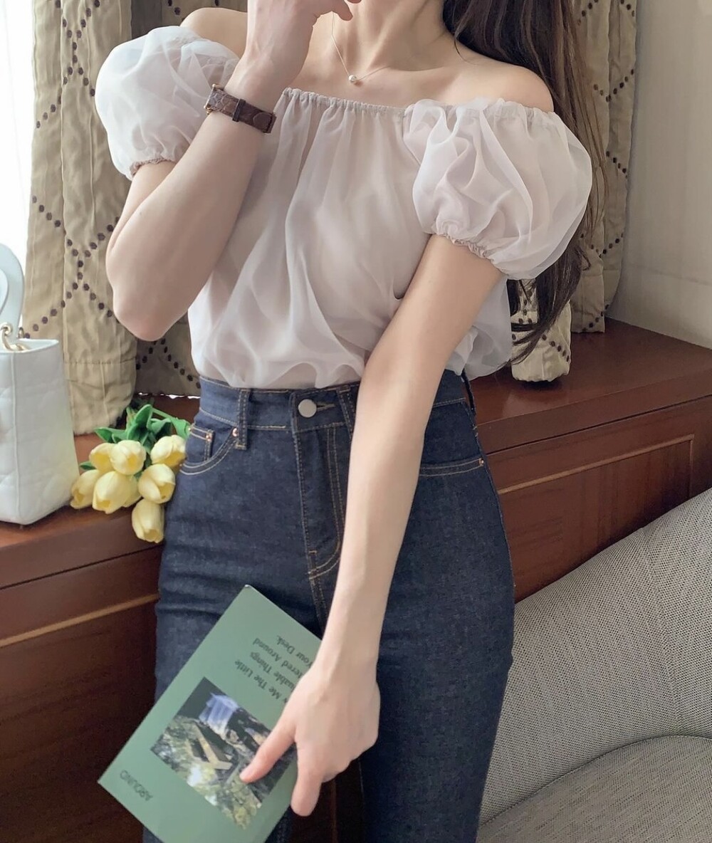 오간자 스퀘어넥 오프숄더 밴딩 퍼프 반팔 소매 셔링 블라우스