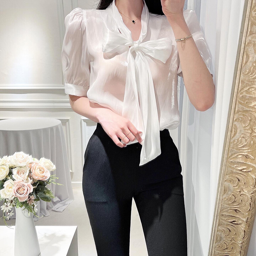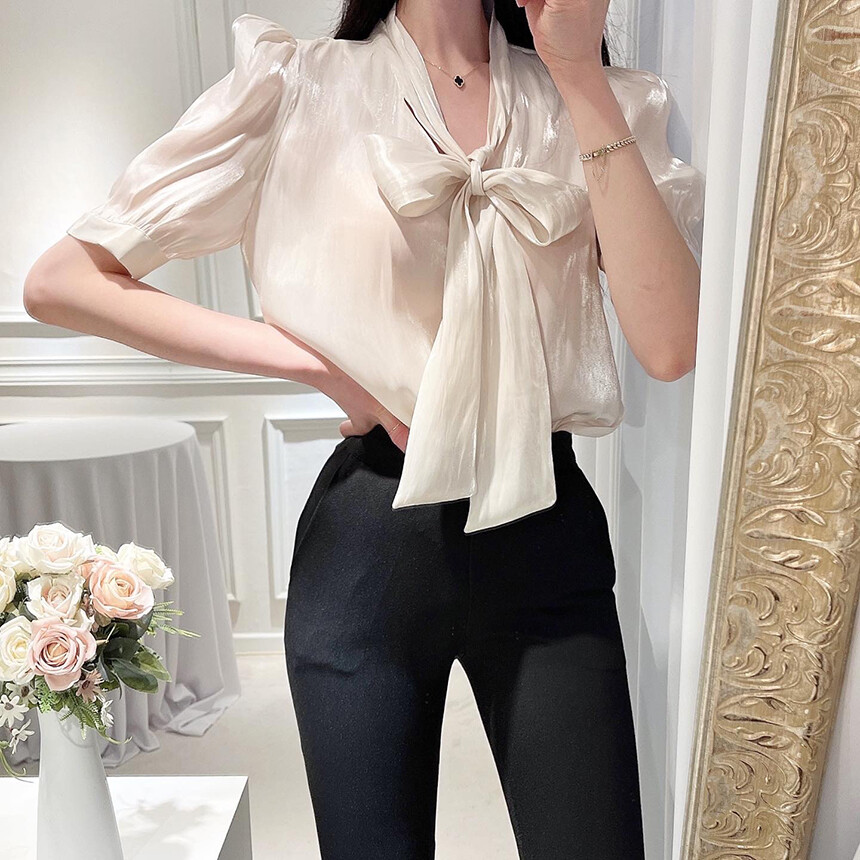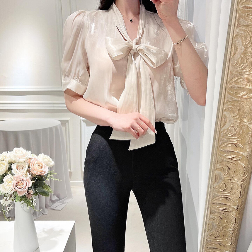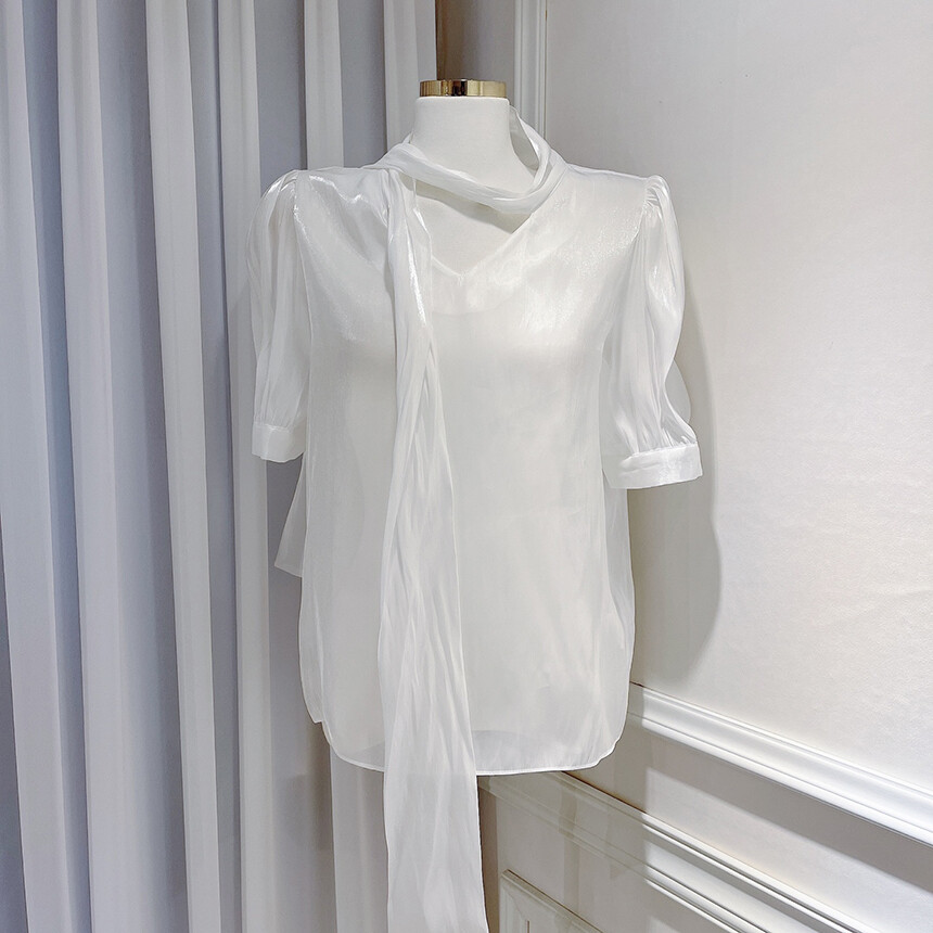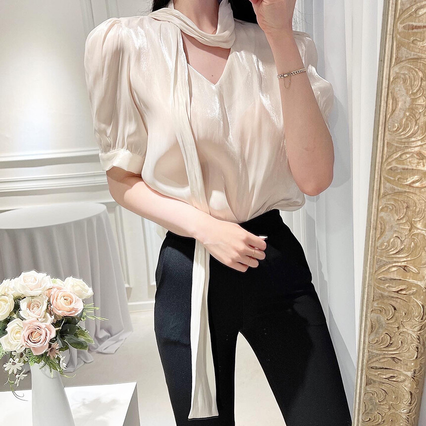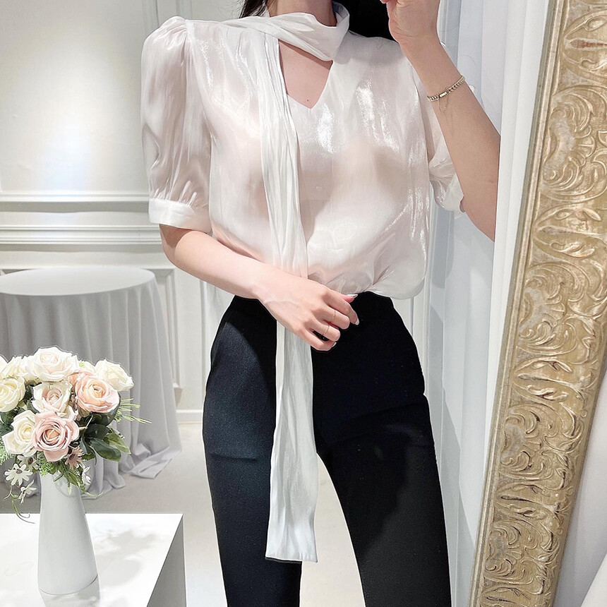 반팔 새틴 글로시 스카프 타이 리본 블라우스