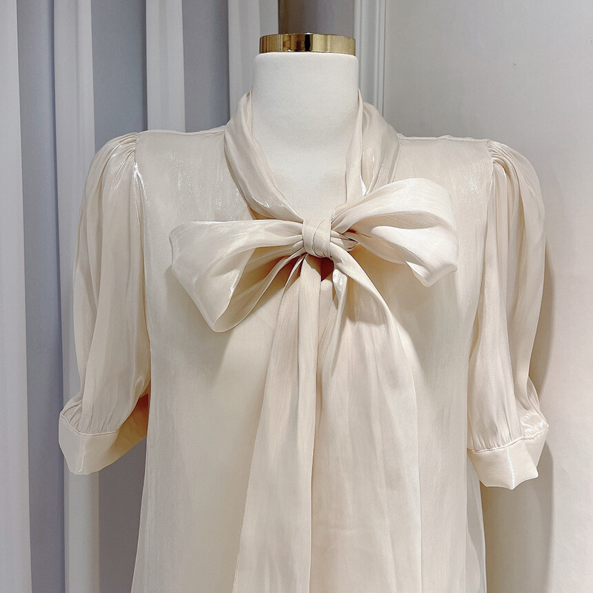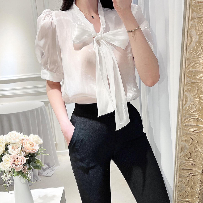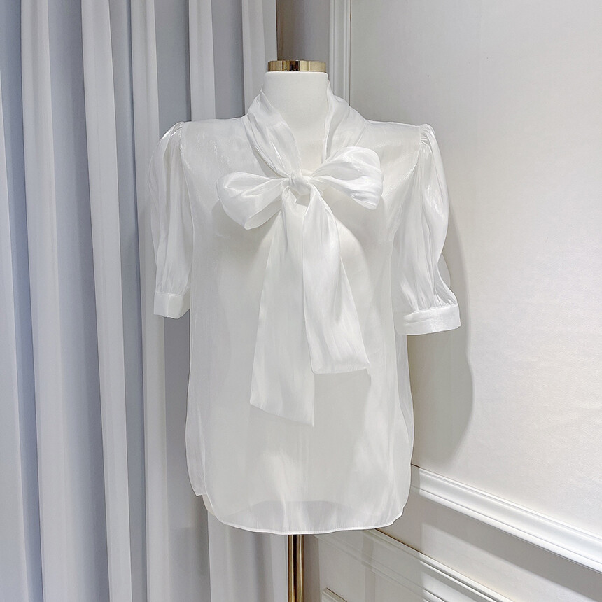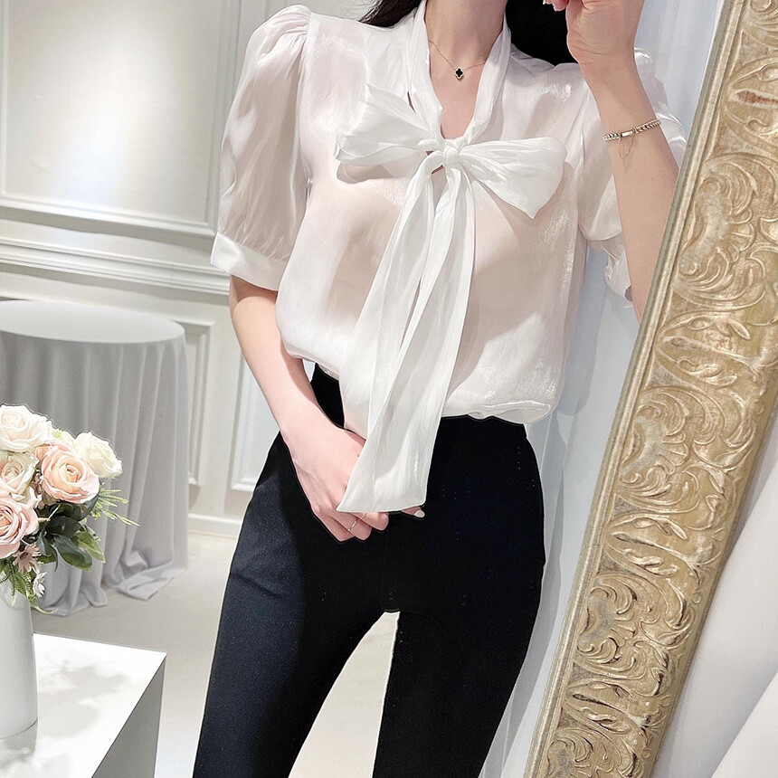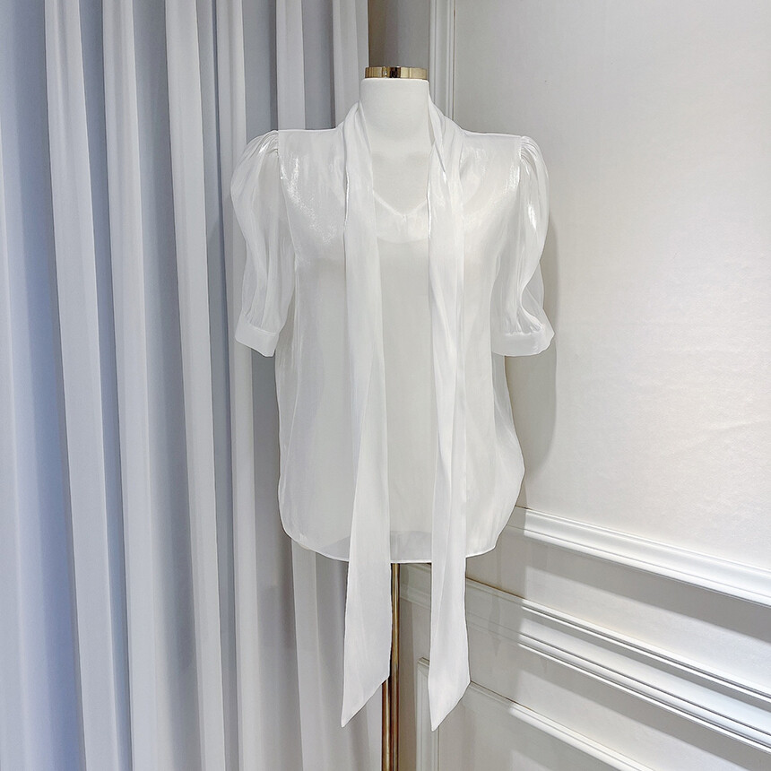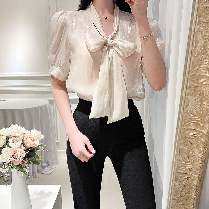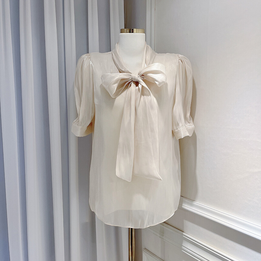 반팔 새틴 글로시 스카프 타이 리본 블라우스