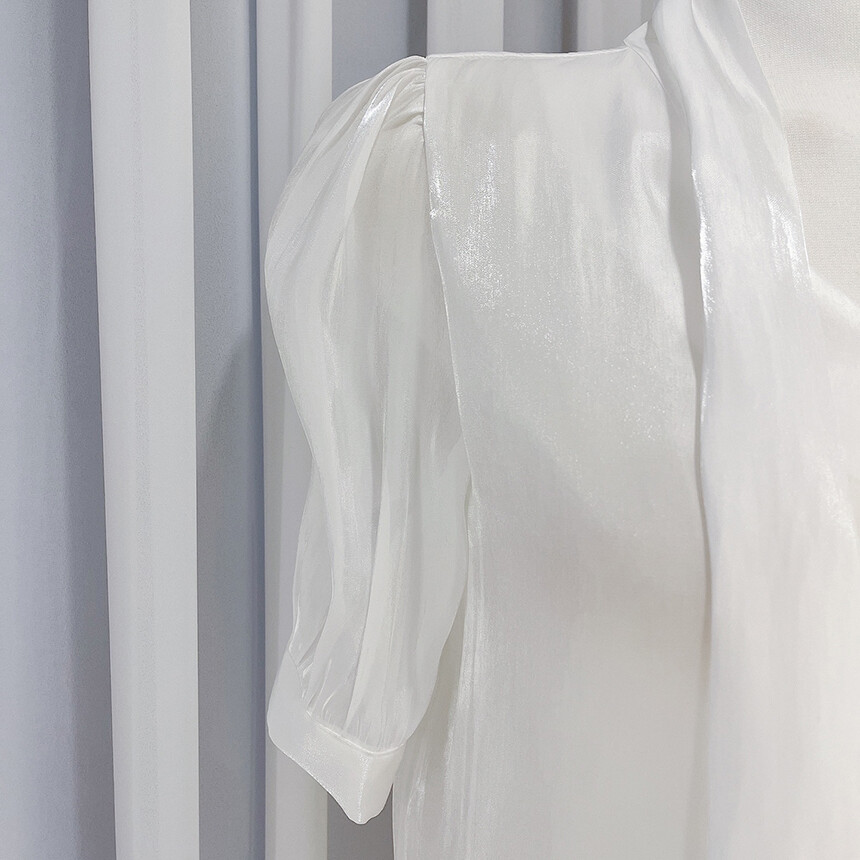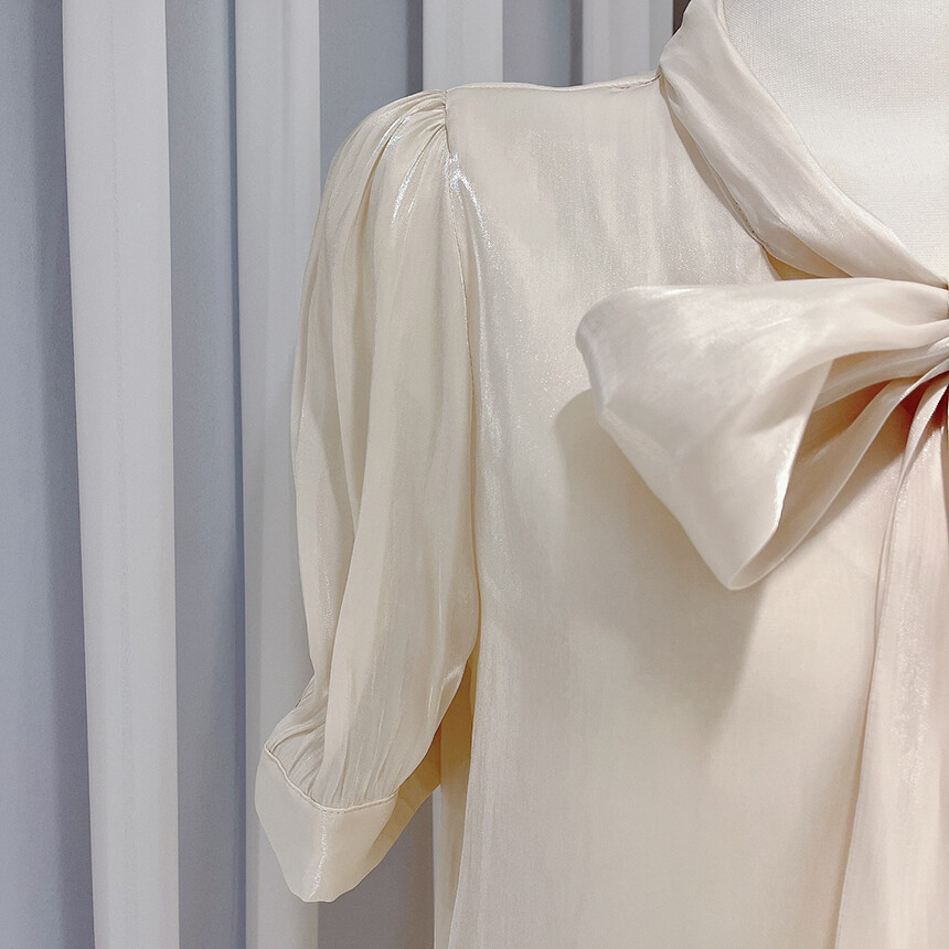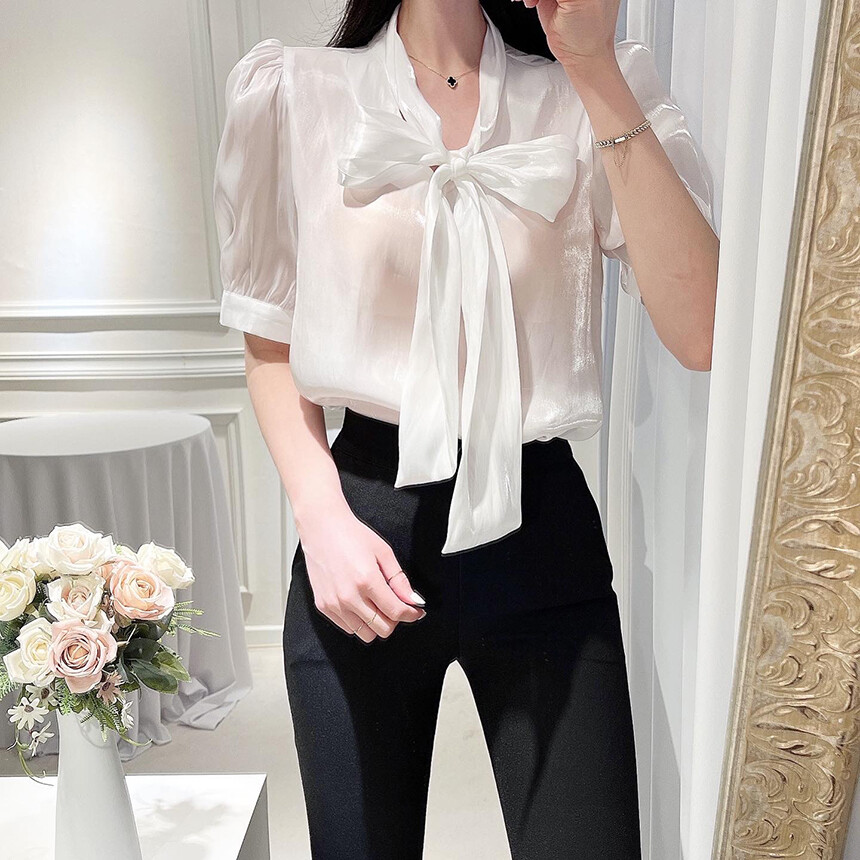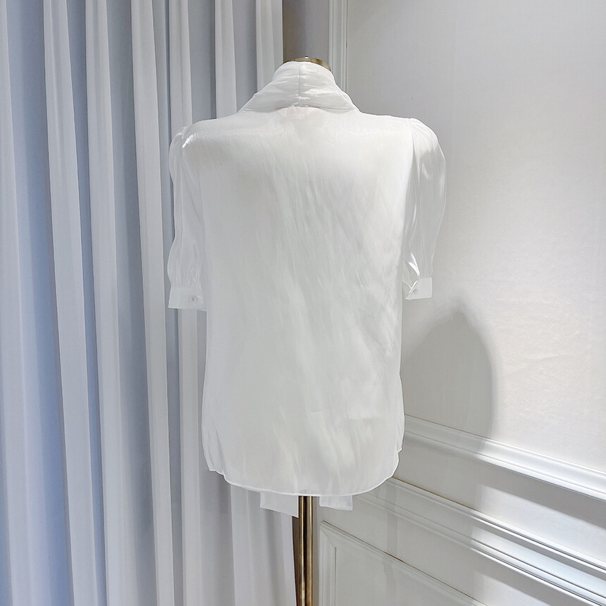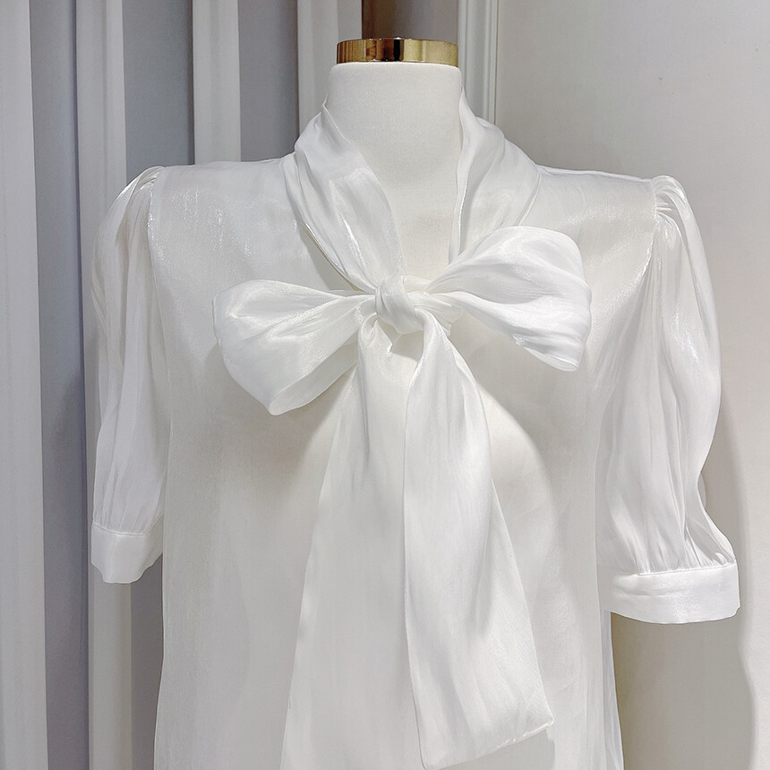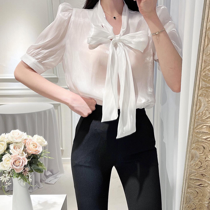 반팔 새틴 글로시 스카프 타이 리본 블라우스