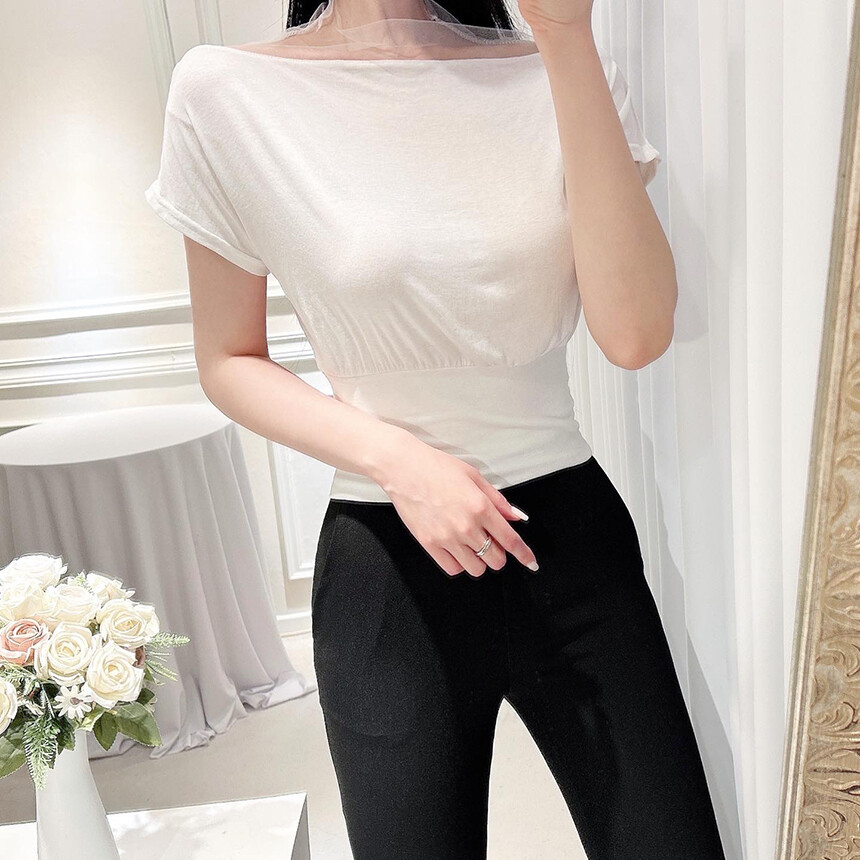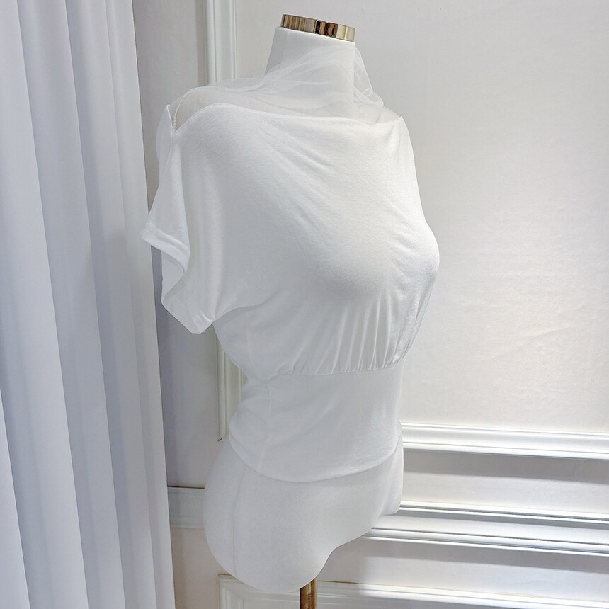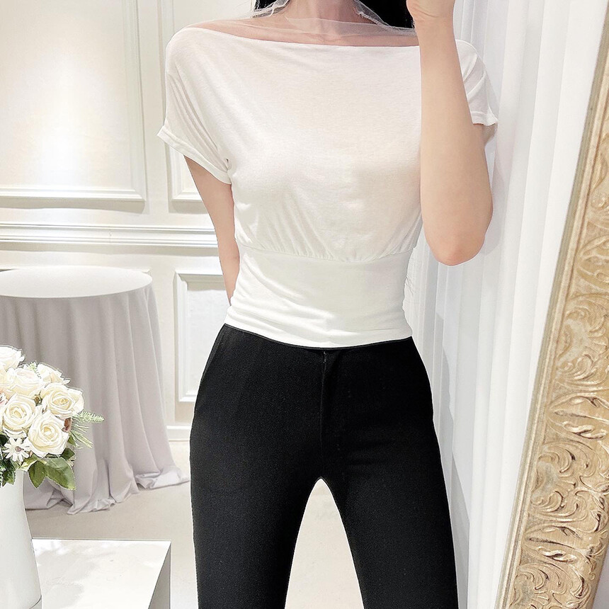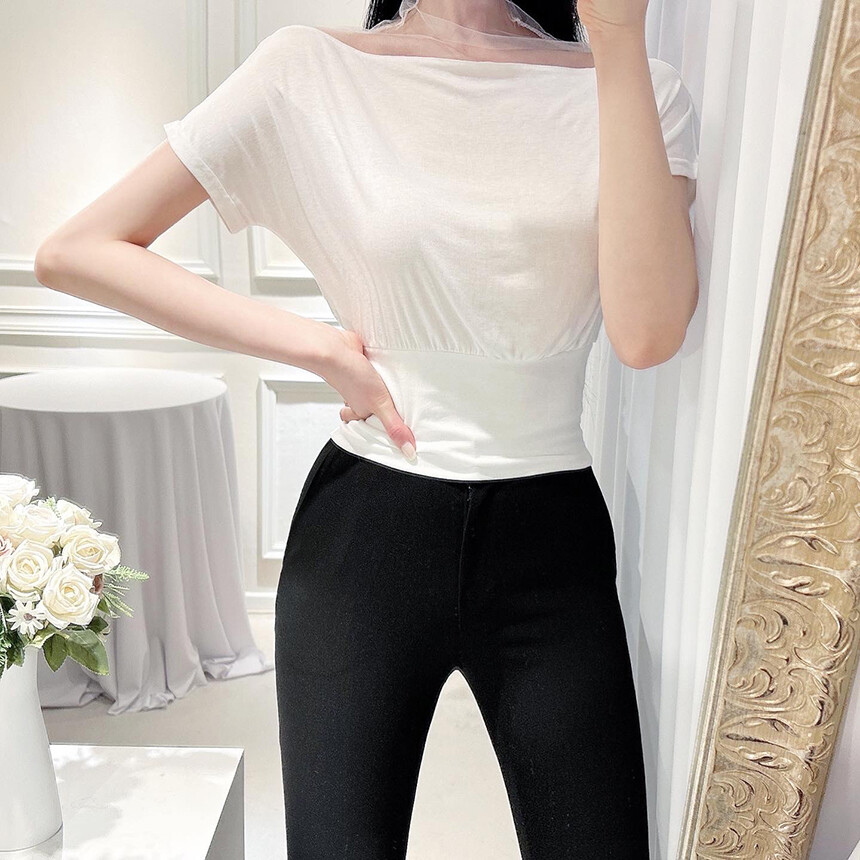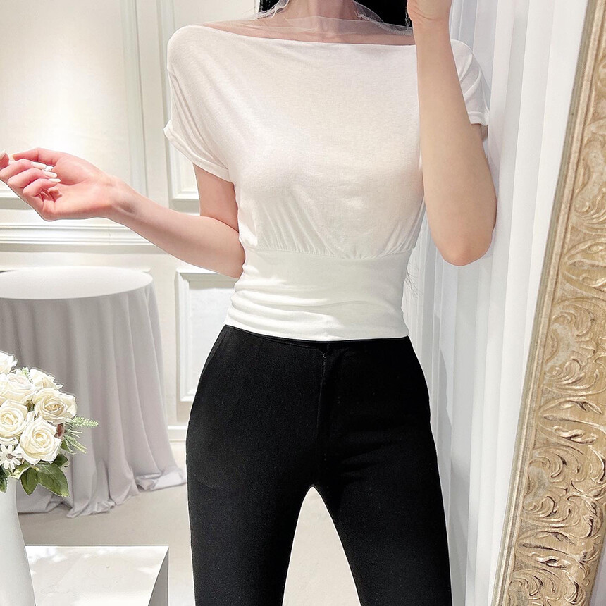 시스루 망사 반목 반팔 배색 오프숄더 블라우스 티셔츠