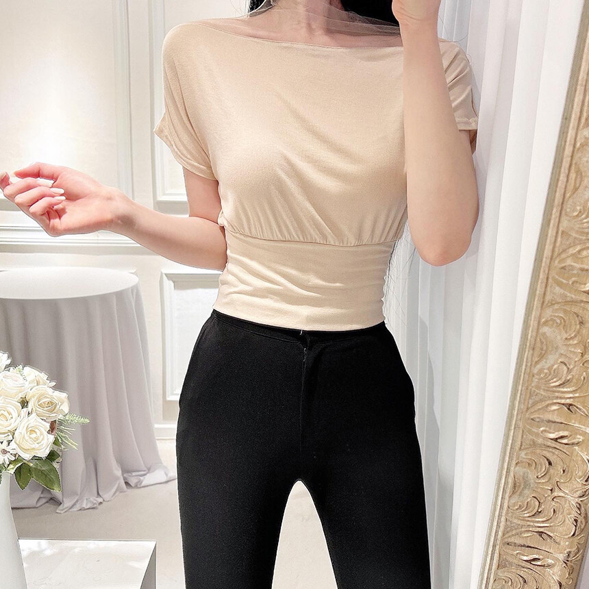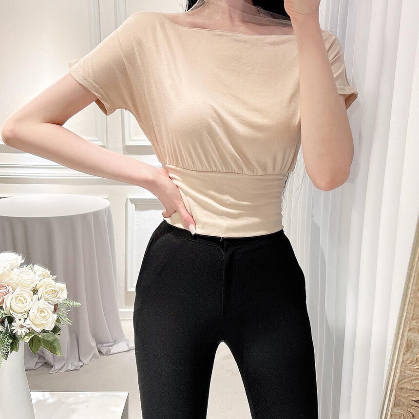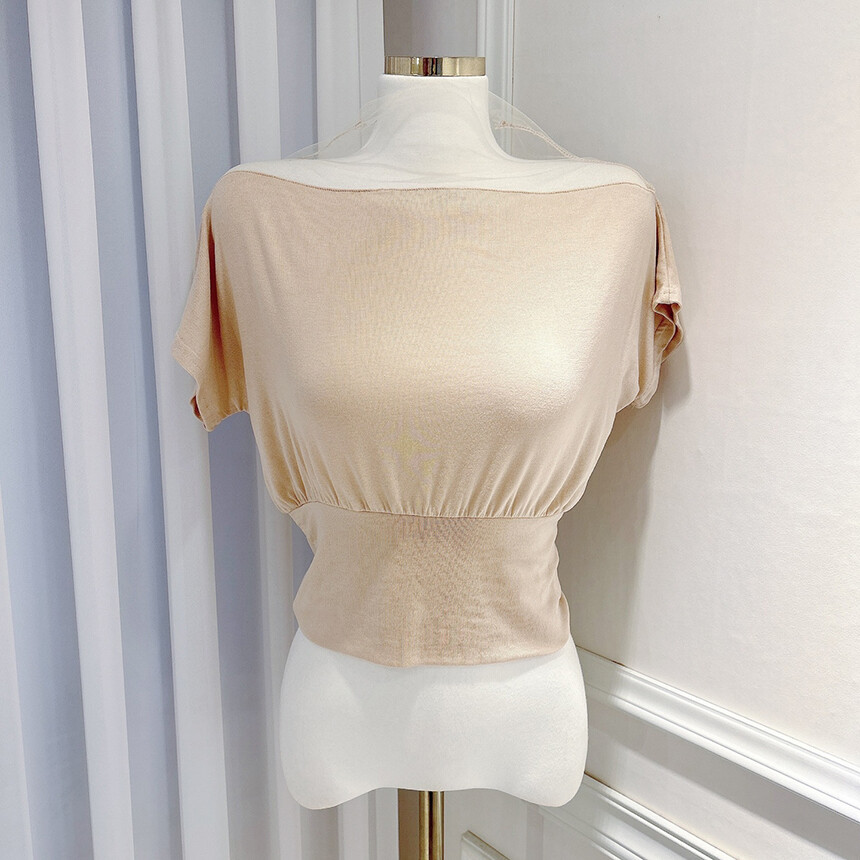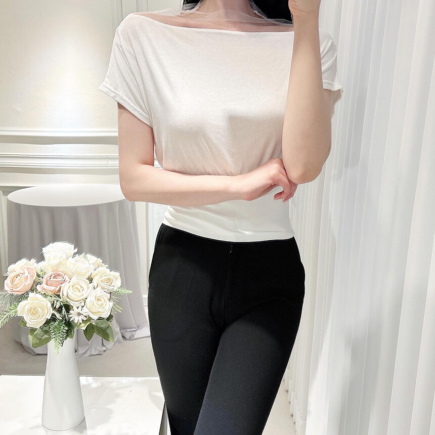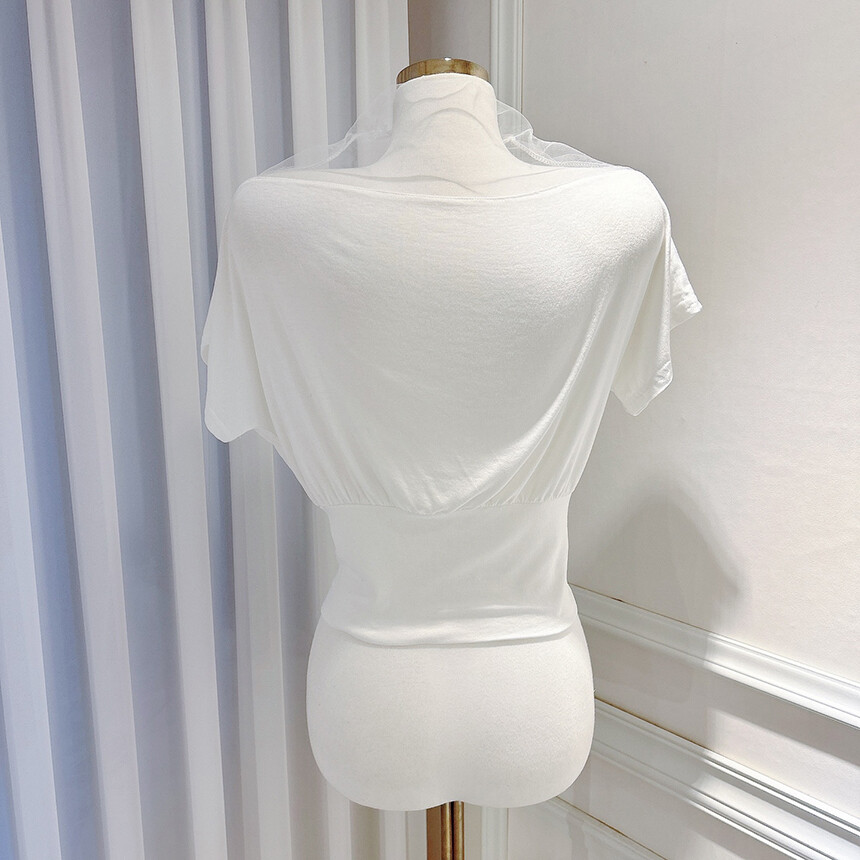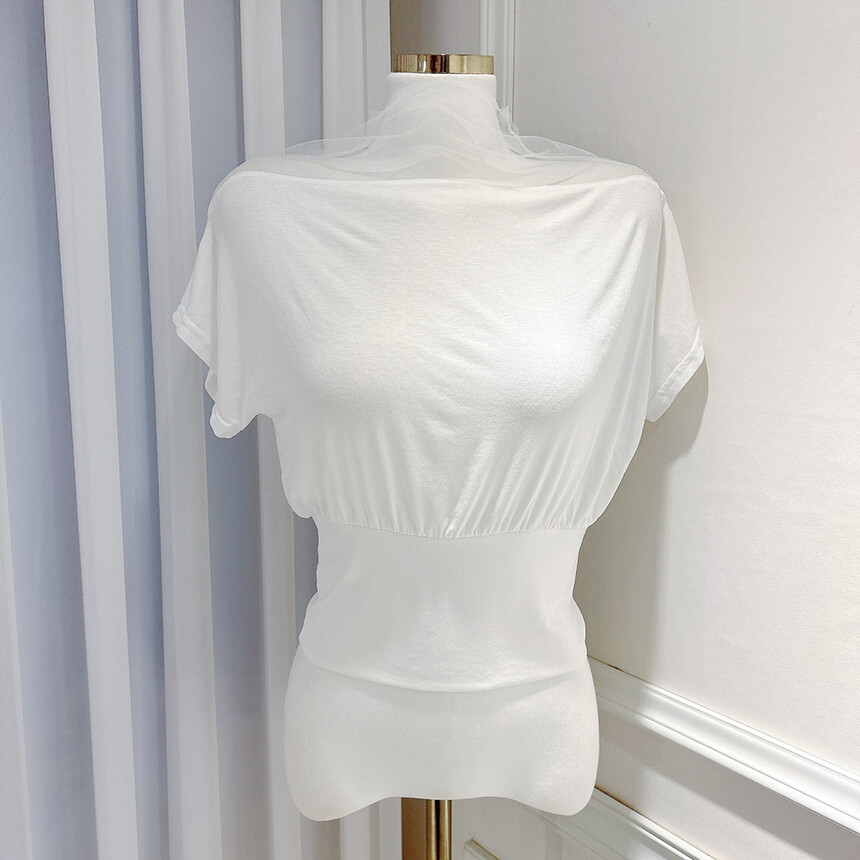 시스루 망사 반목 반팔 배색 오프숄더 블라우스 티셔츠