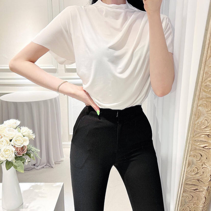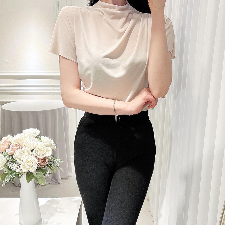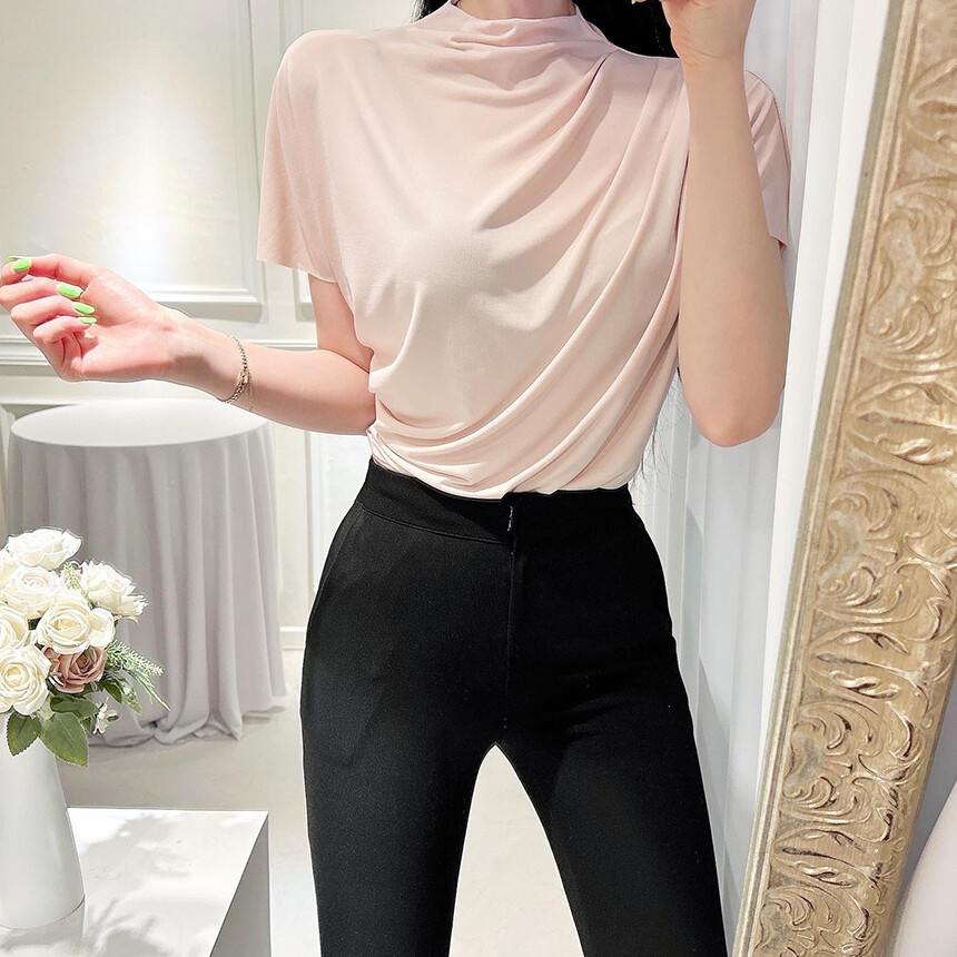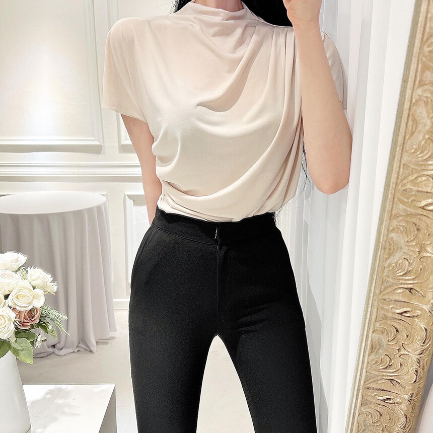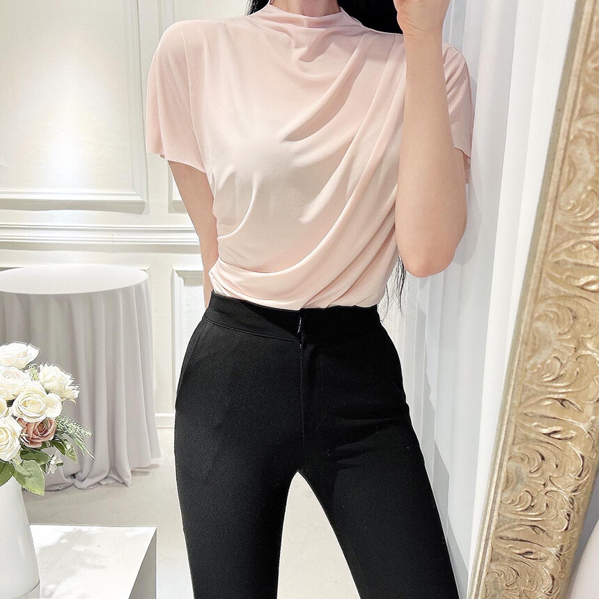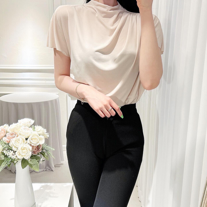 반팔 반목 셔링 드레이프 주름 쿨링 블라우스 티셔츠